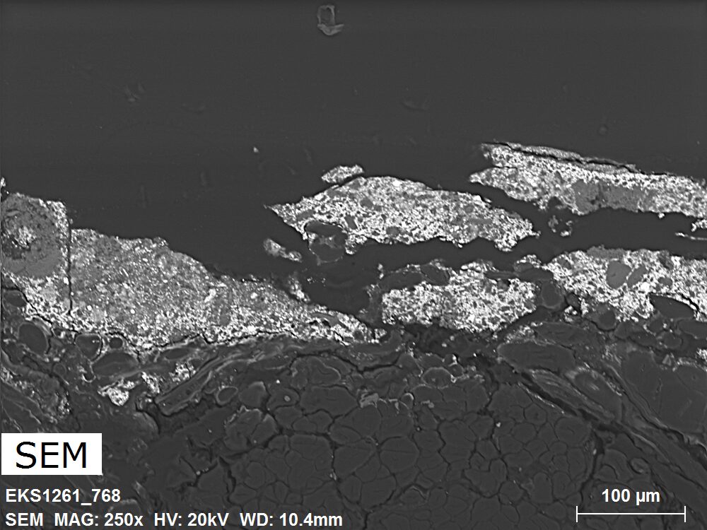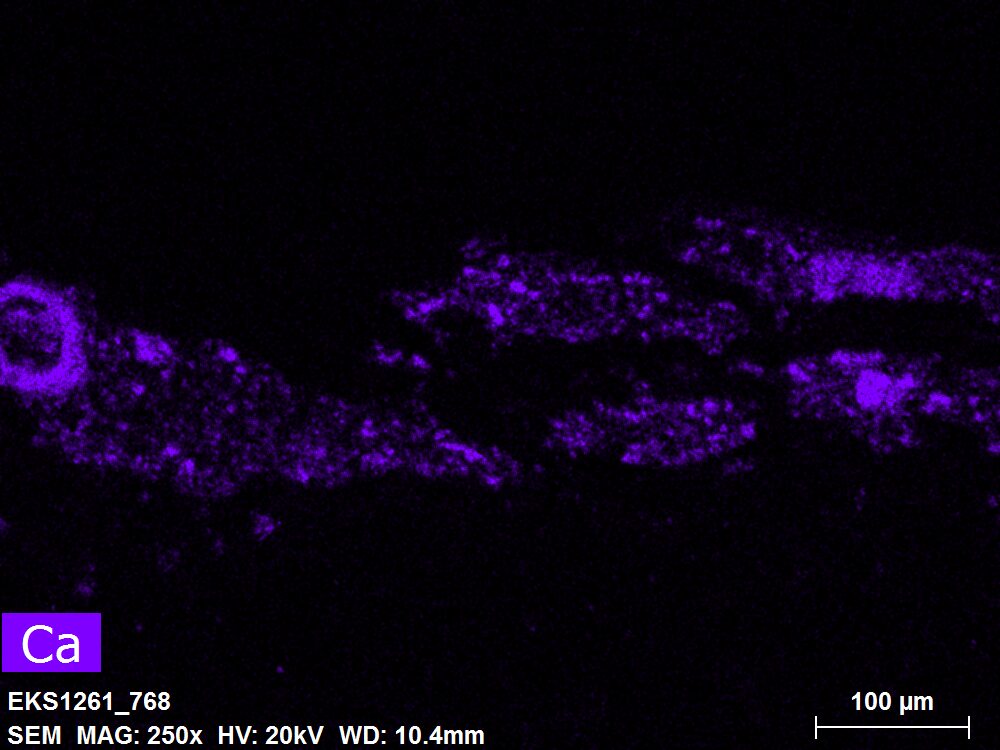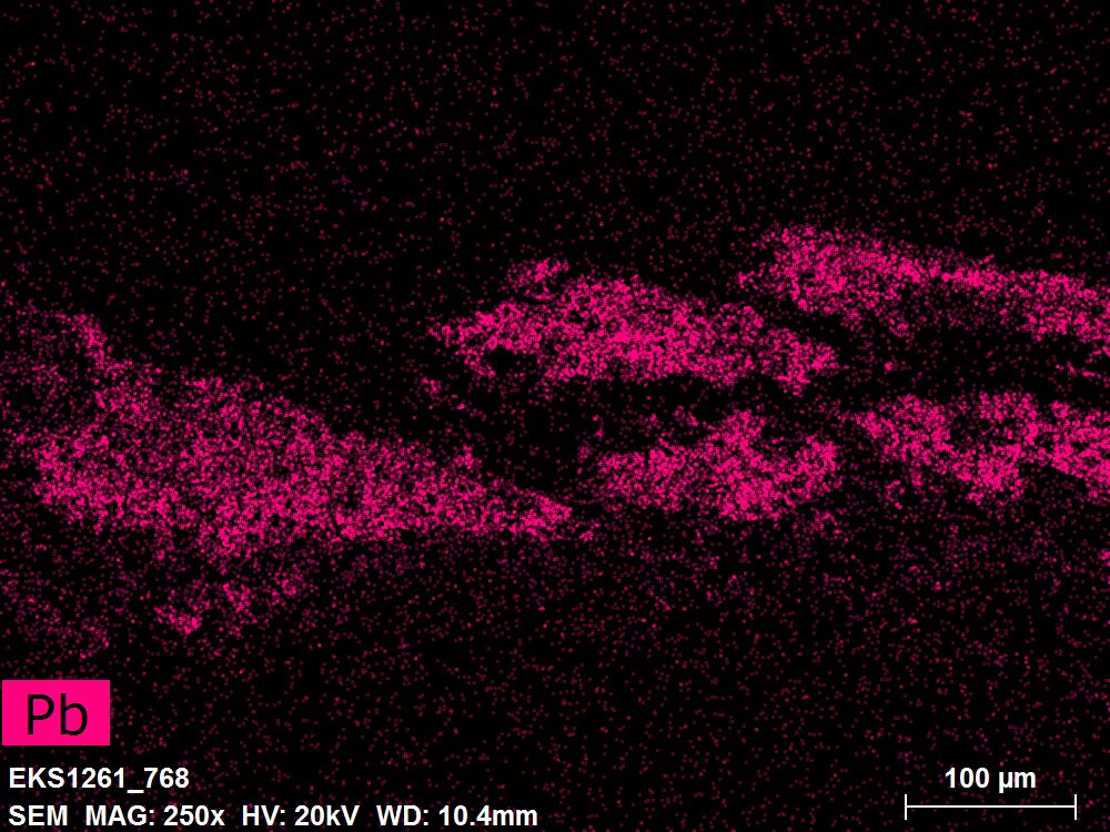 SEM-EDXS is a technique that provides highly detailed images at the microscopic level while simultaneously identifying the elemental composition of a sample. It is particularly valuable for studying the stratigraphy of paint cross sections at very fine scales, for the chemical characterisation of pigments, fillers and degradation products, and for detecting trace elements that may indicate very specific materials. Below, the elements listed in parentheses refer to minor elements whose relative abundance is below 10% of the total signal. The F1 map below represents the Pb M line. Read more under SEM-EDXS in the glossary.