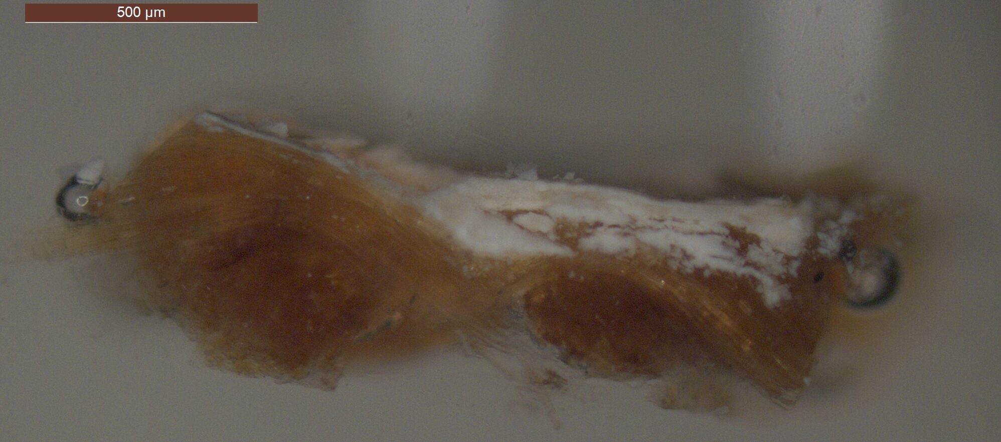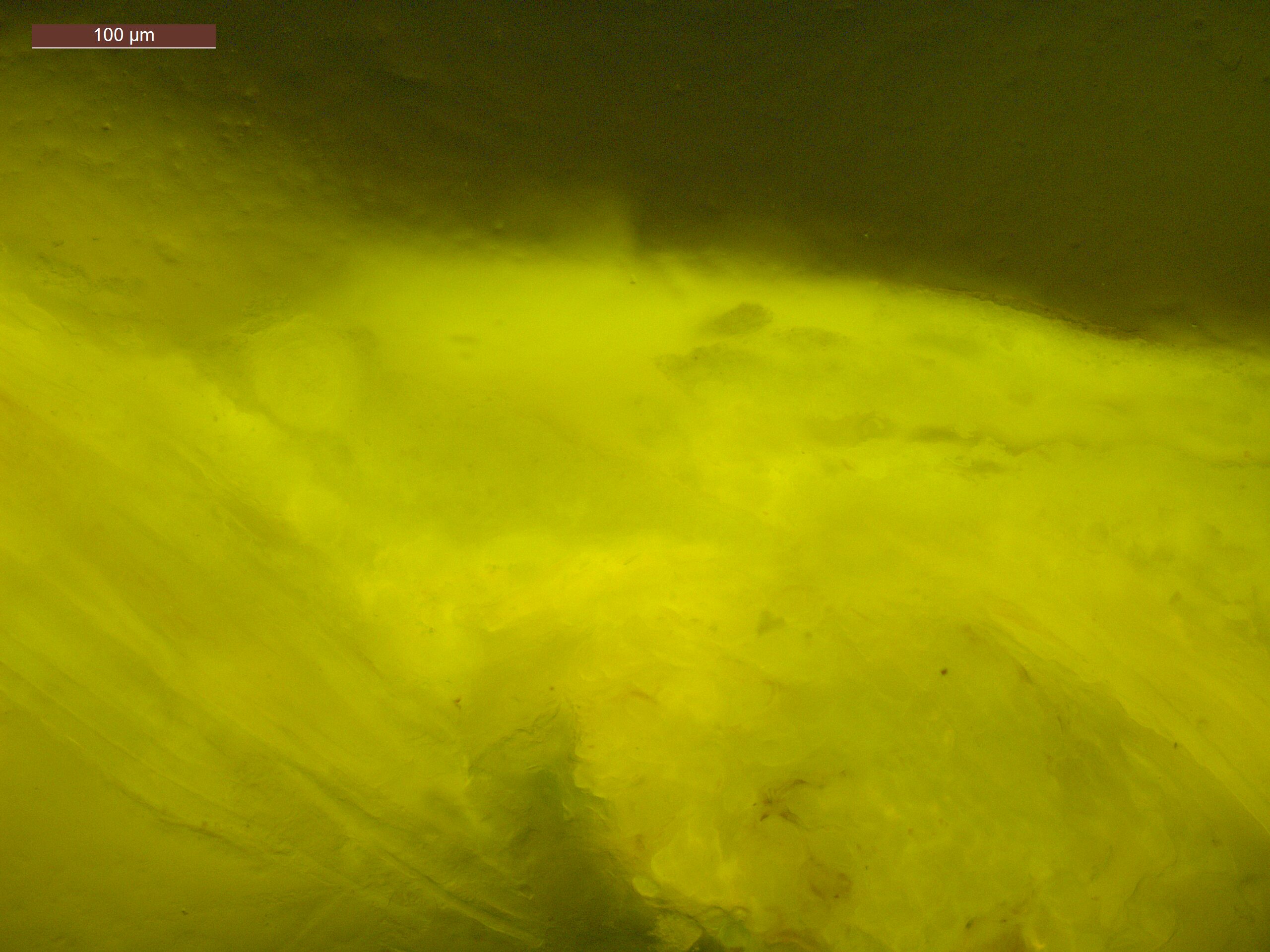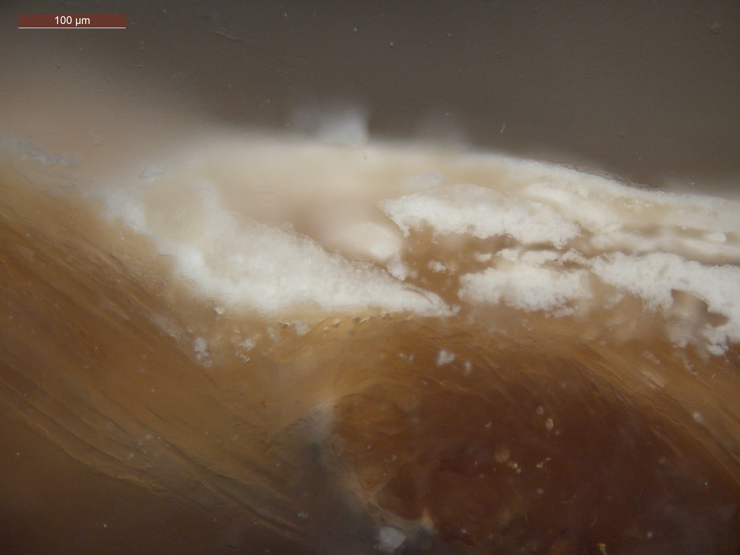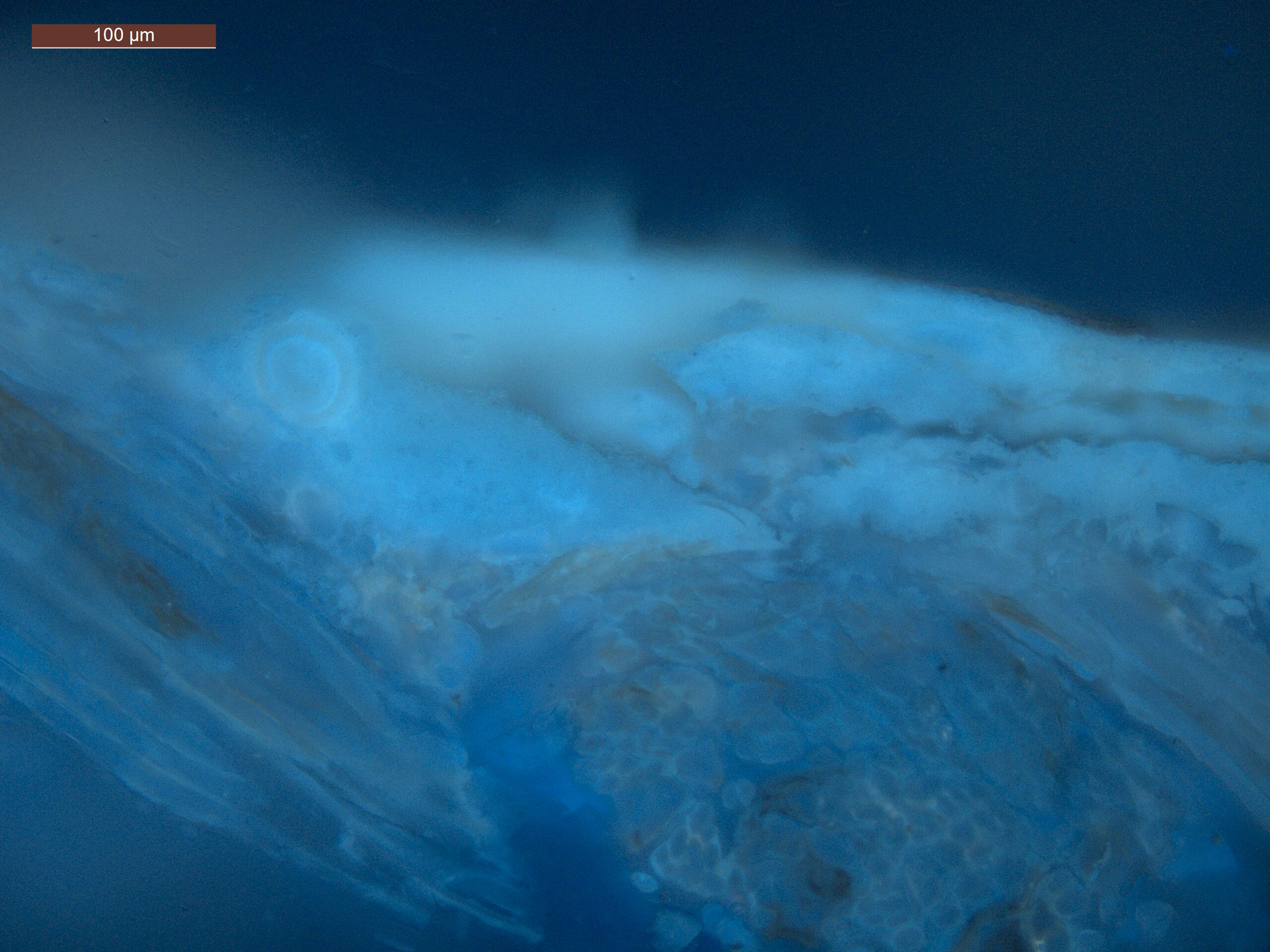 Optical microscopy uses visible light and lenses to magnify and examine the surface and structure of a painting. When applied to cross sections of paint samples, it allows for detailed observation of a painting’s stratigraphy (layer structure) and pigment particles. It is often employed with various illumination techniques, such as dark field and UV fluorescence, to enhance the analysis. Layer number 1 in the results section below the images refers to the layer at the bottom of the cross section.