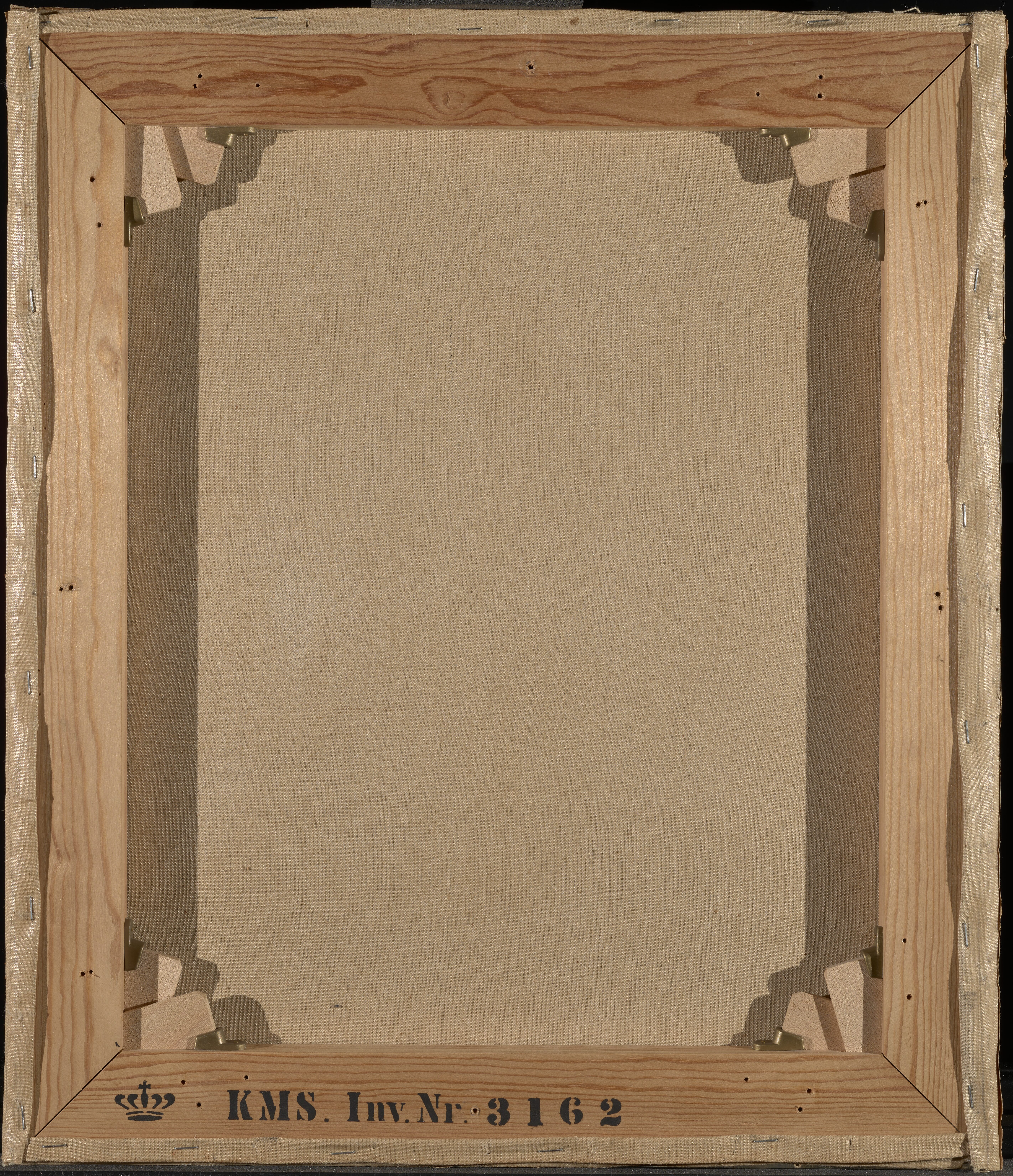 The slight tilt of the original stretching was adjusted with the treatment in 1979. In addition, the format was enlarged by 5-8 mm as seen by the original edge now positioned at the front of the painting.