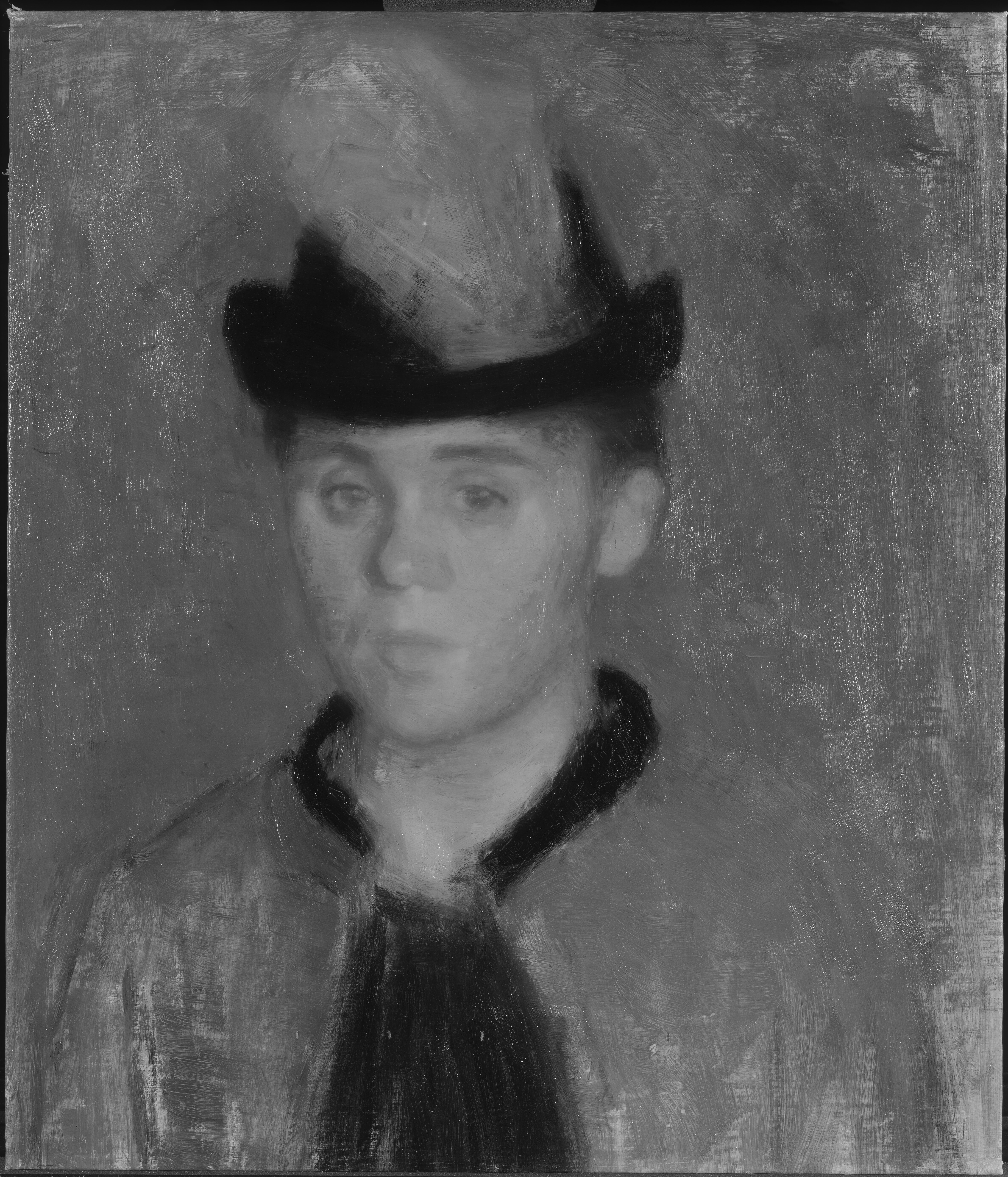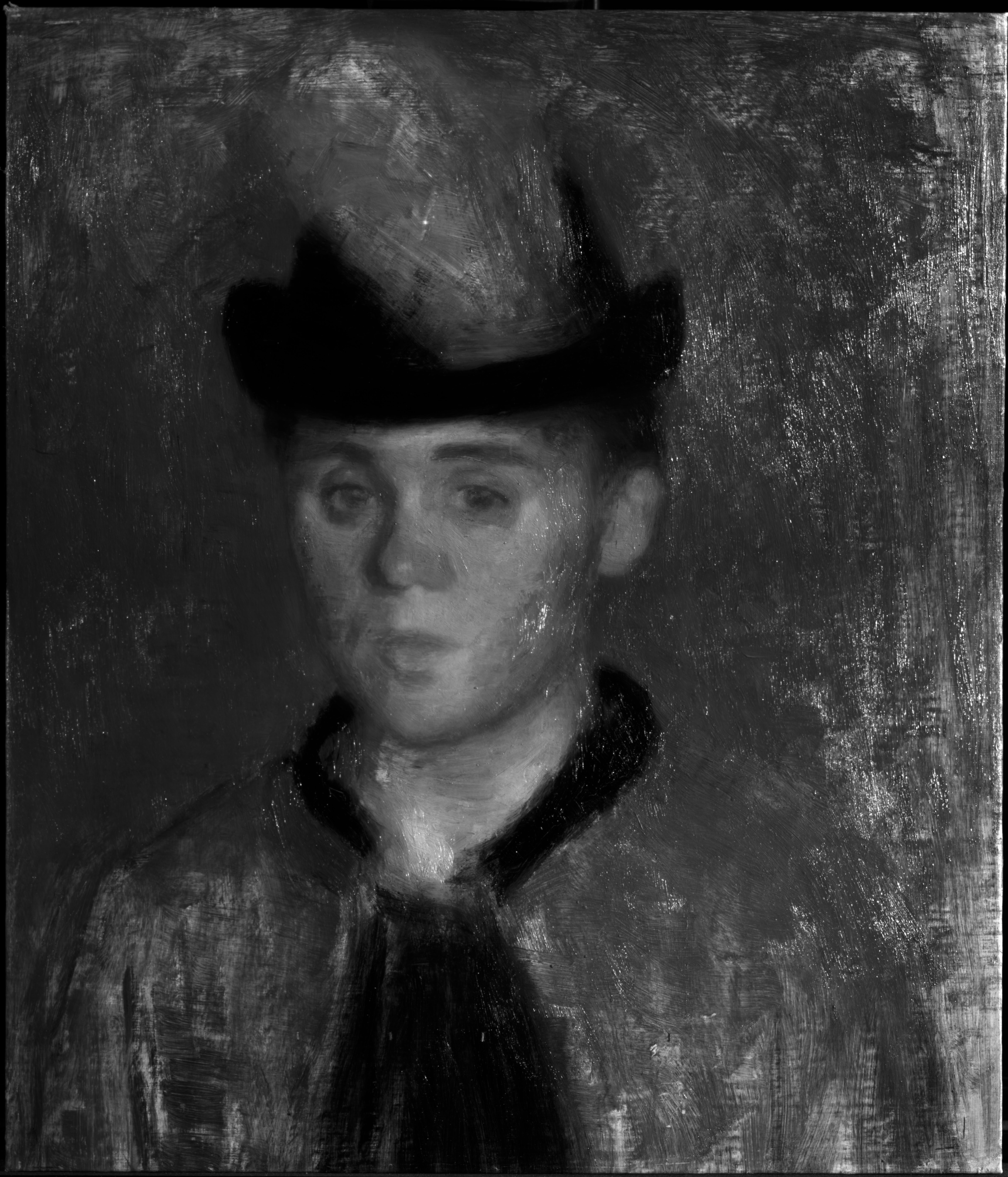 The underdrawing is visible locally as lines in thinned black paint indicating outlines of the shoulder and upper parts of the sleeves. No squaring was detected by visual examination, but a horizontal row of marks made in the wet paint at the lower part of the painting suggests that a transfer by a similar method was employed.