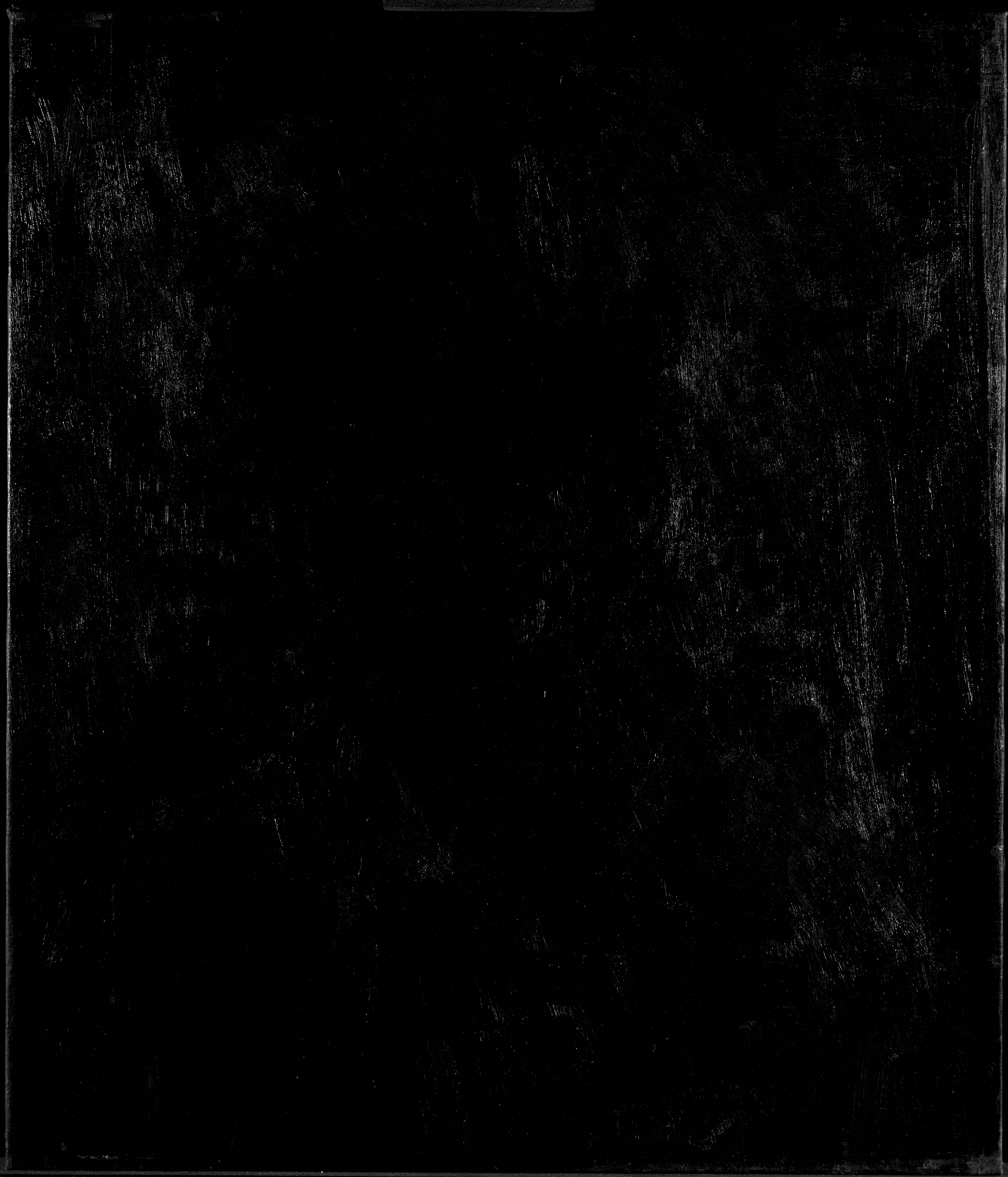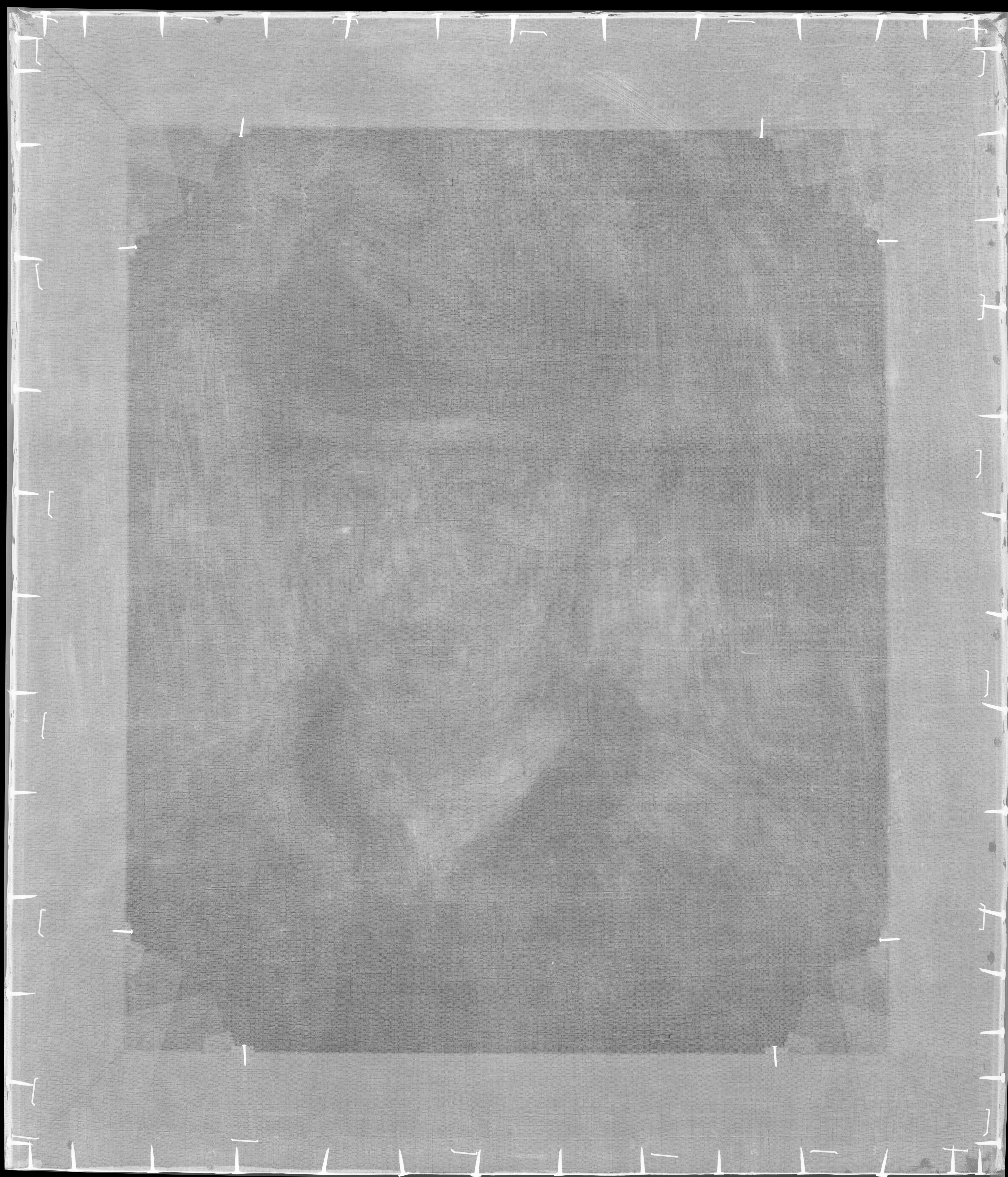 A horizontal line of 6 vertical marks, 5 mm long and 4,5 mm apart, was made in the wet paint 6,5 cm from the bottom edge. They may be related to the squaring method used in the creation of the final portrait (survey no. 85) or they may be traces of a separate transfer method.