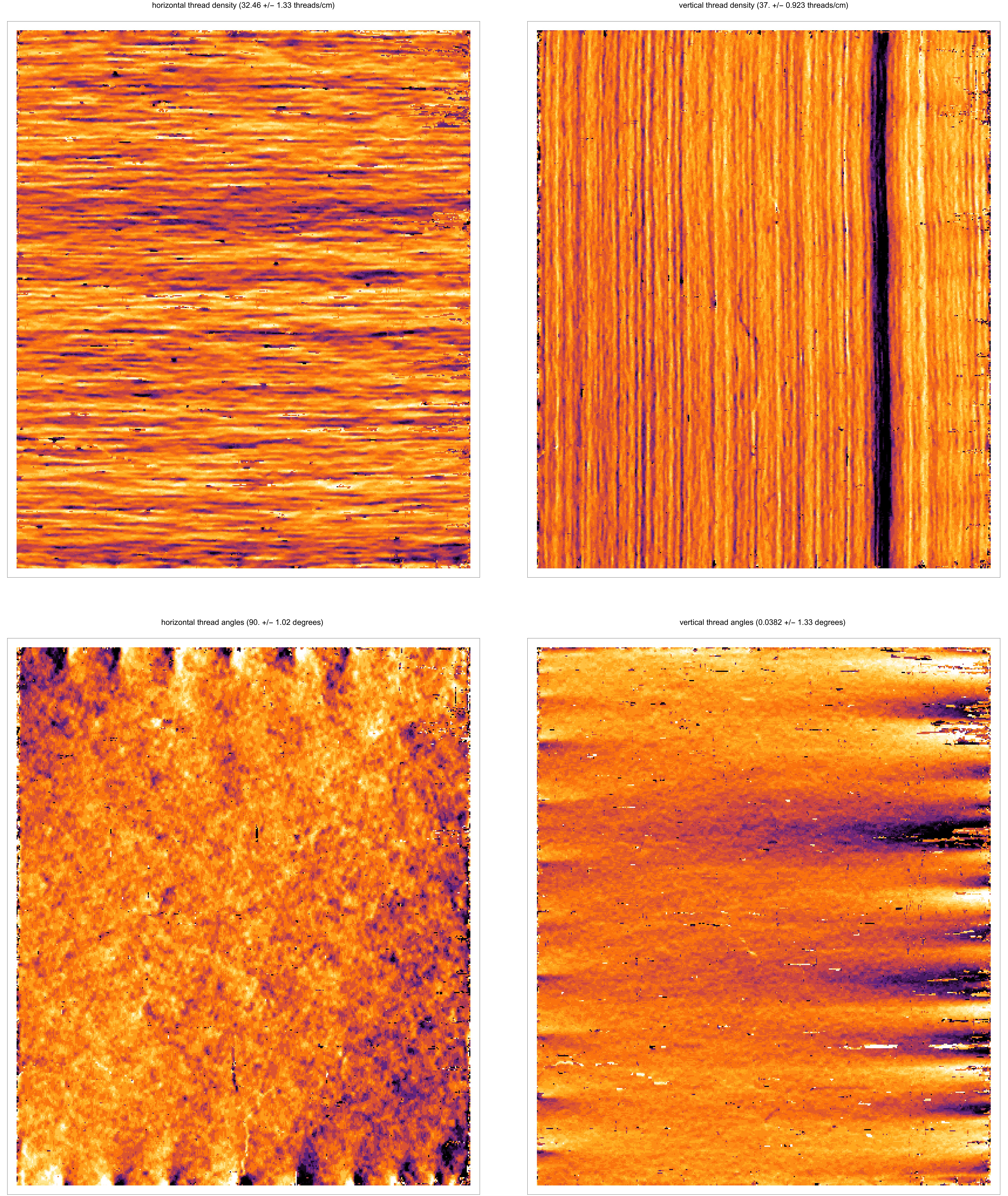 Weave maps are detailed visualisations of the thread patterns in a canvas, created by applying thread counting on high-resolution x-radiographs. These are used for analysing the structure of the canvas and to compare canvases used in different paintings. A comparison between weave maps can sometimes determine if two or more pieces of canvas derive from the same batch and thereby shed light on the place and period in which a painting has been created.