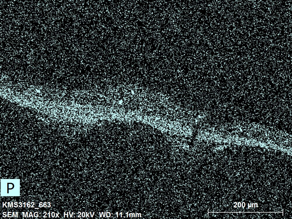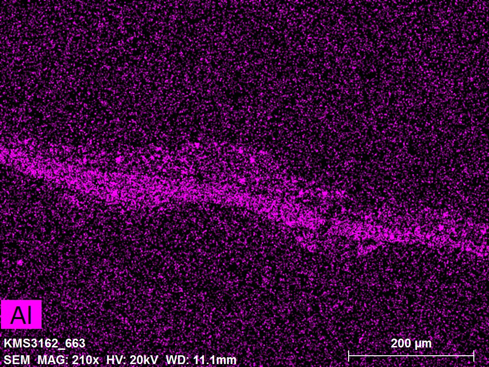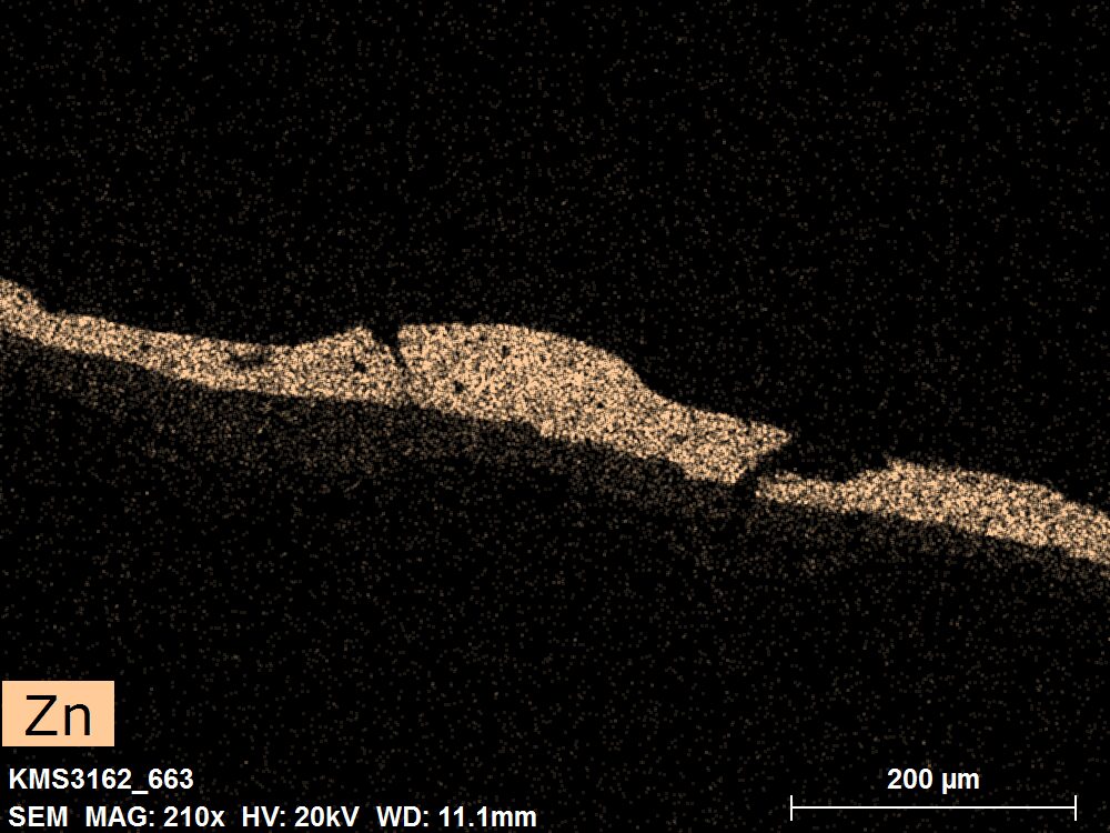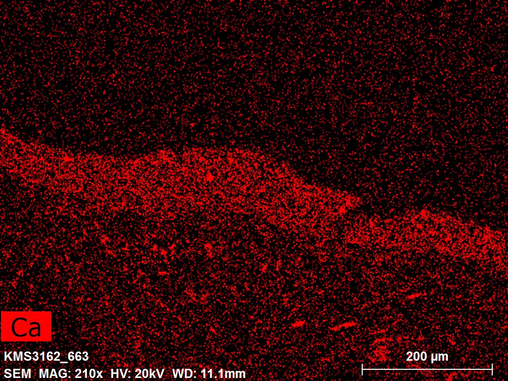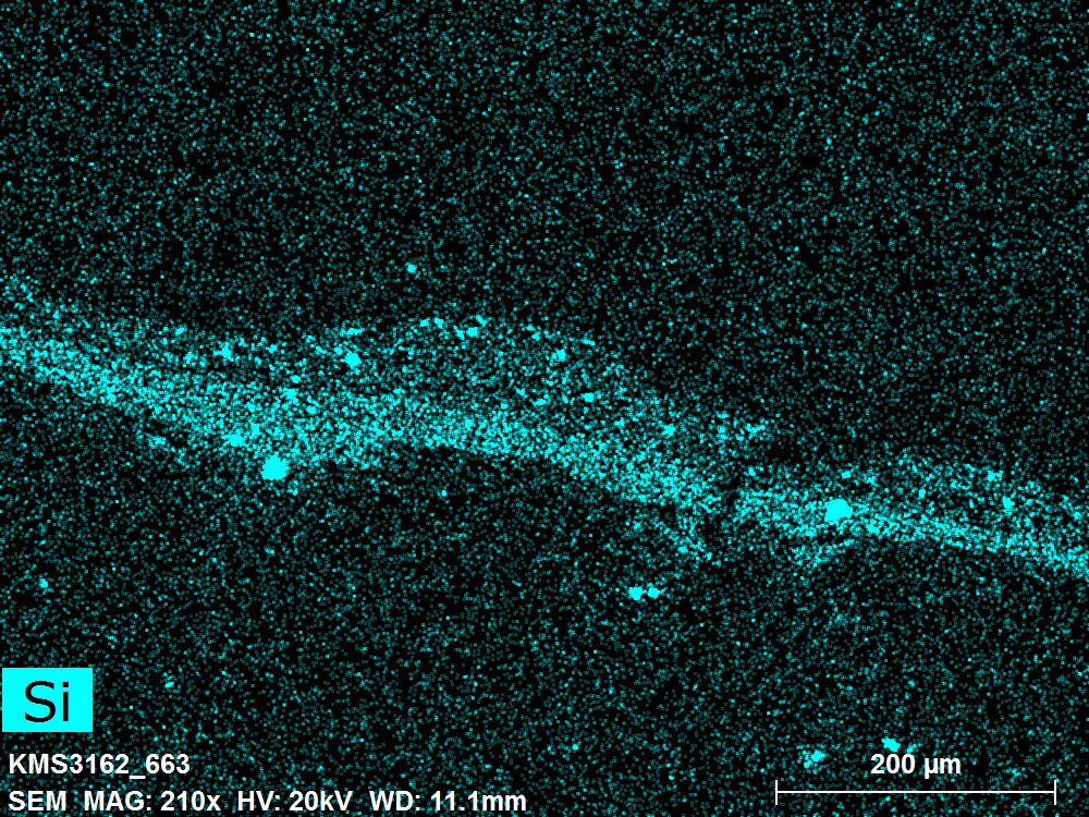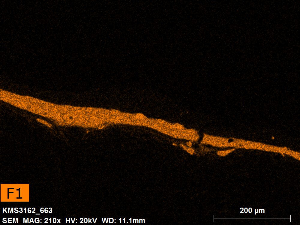 SEM-EDXS is a technique that provides highly detailed images at the microscopic level while simultaneously identifying the elemental composition of a sample. It is particularly valuable for studying the stratigraphy of paint cross sections at very fine scales, for the chemical characterisation of pigments, fillers and degradation products, and for detecting trace elements that may indicate very specific materials. Below, the elements listed in parentheses refer to minor elements whose relative abundance is below 10% of the total signal. The F1 map below represents the Pb M line. Read more under SEM-EDXS in the glossary.