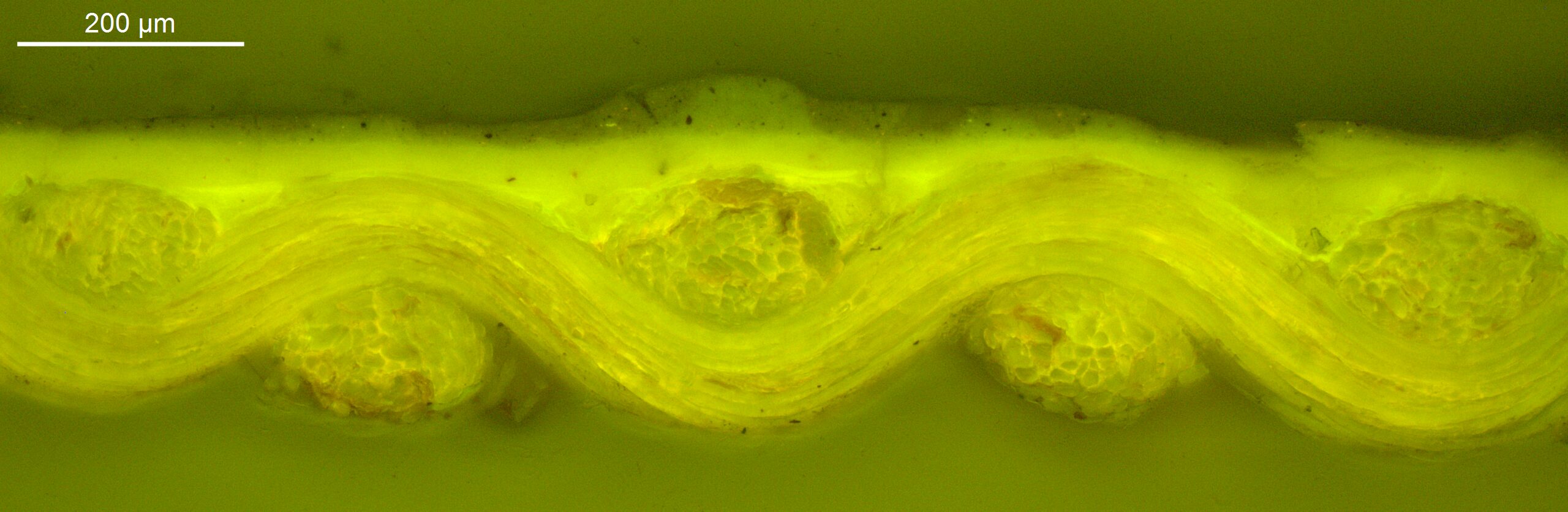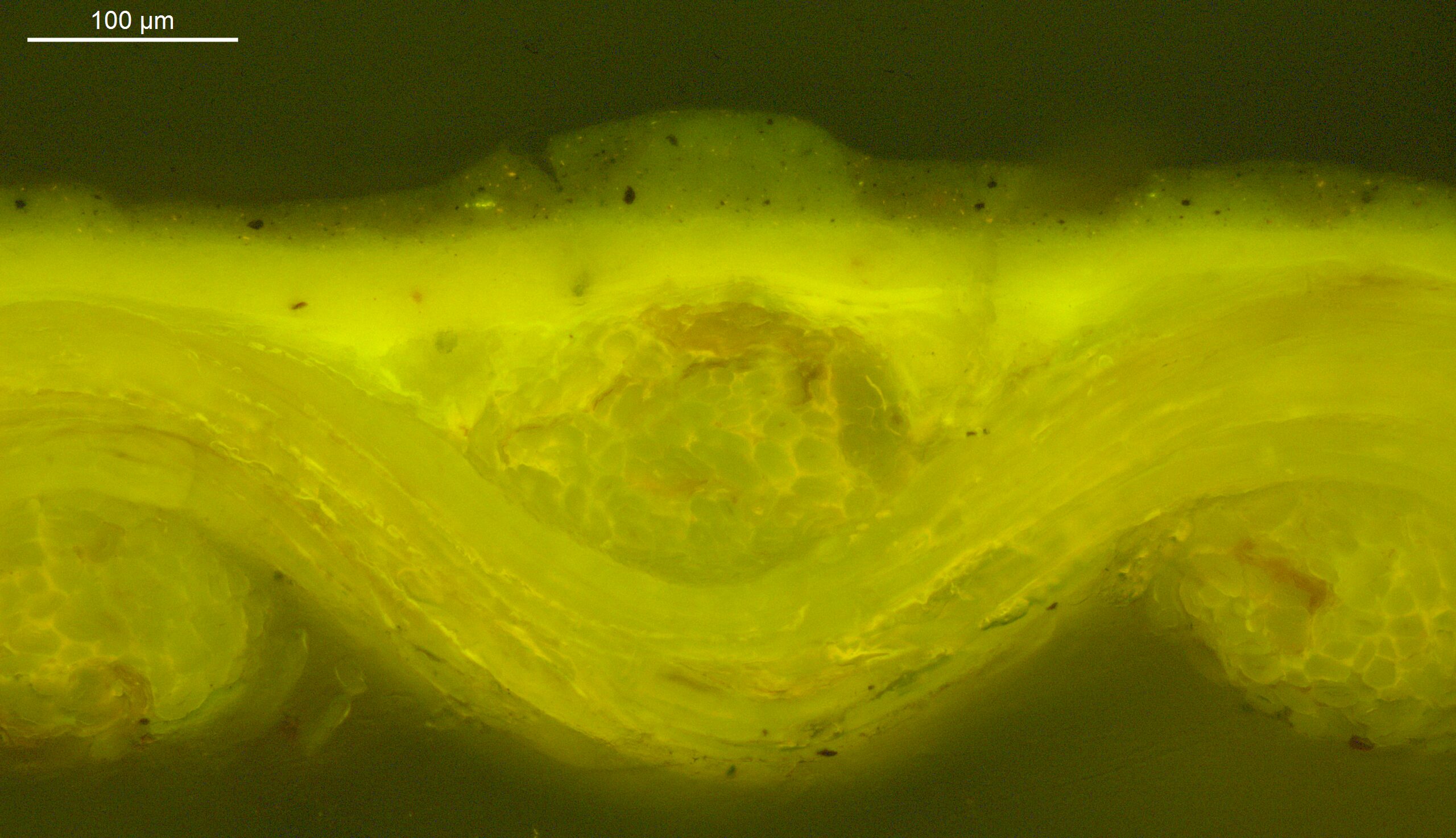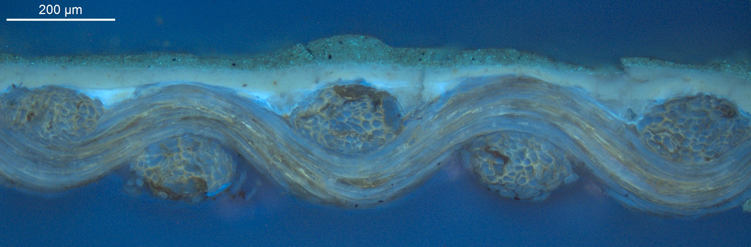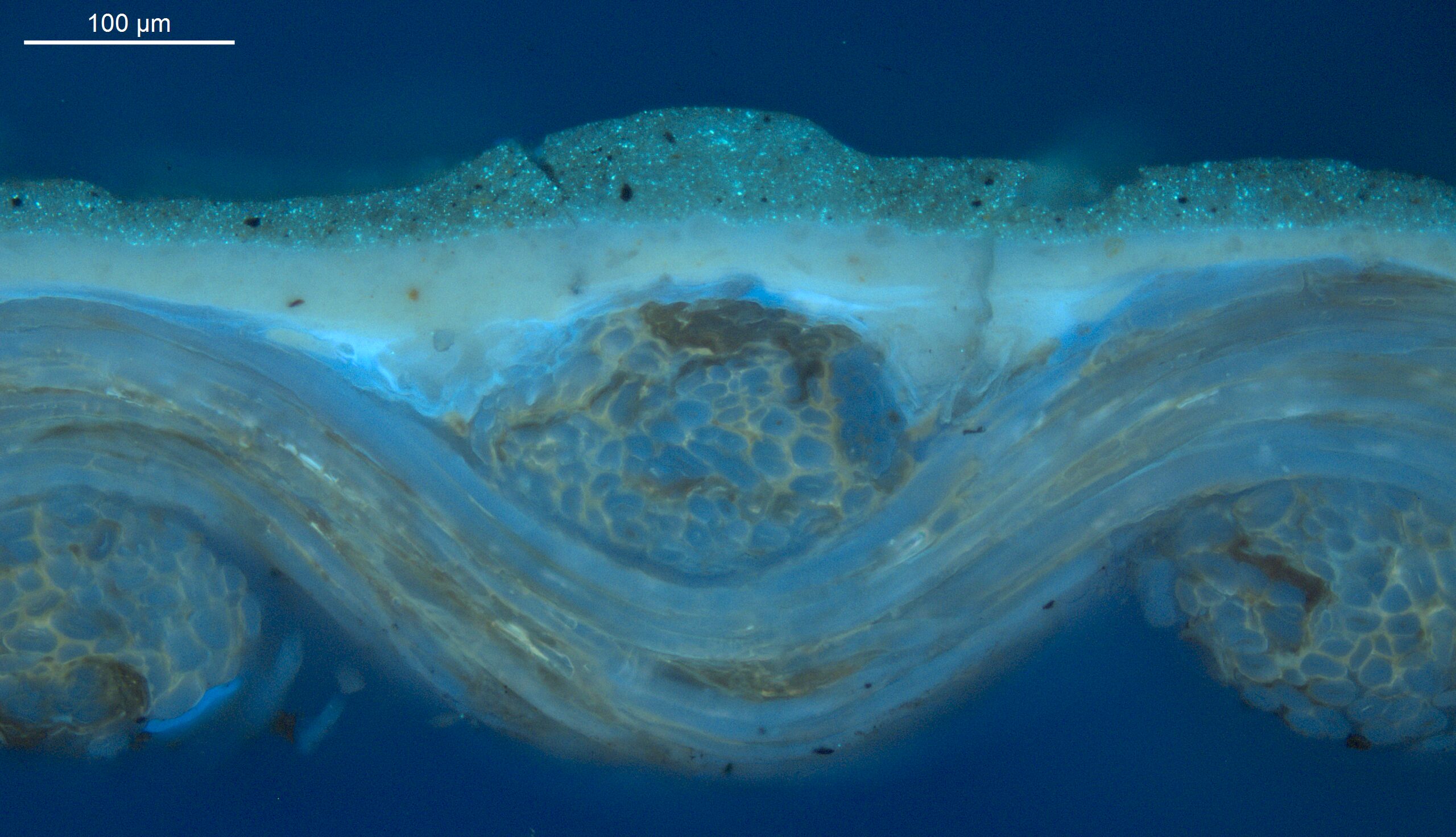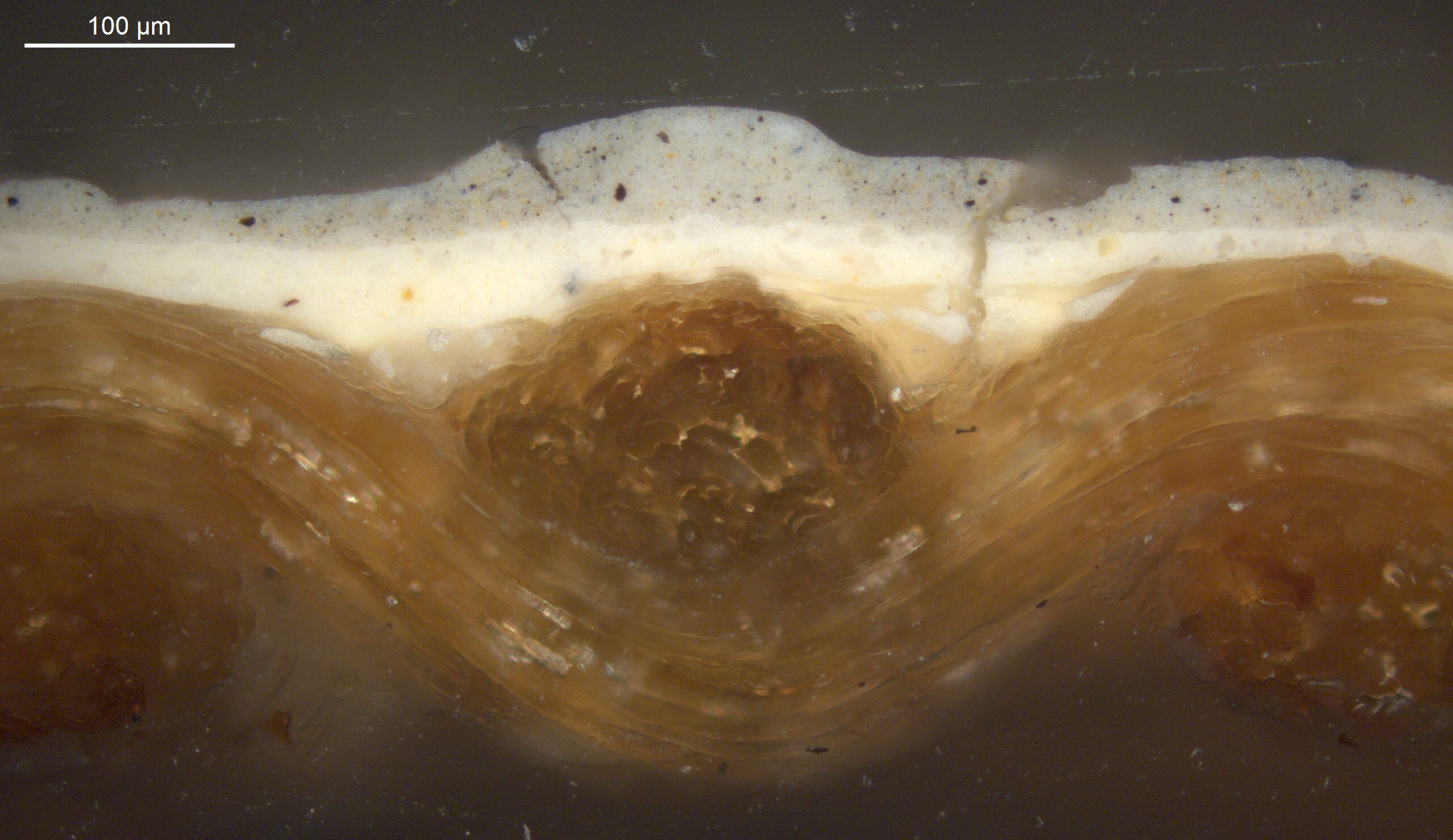 Optical microscopy uses visible light and lenses to magnify and examine the surface and structure of a painting. When applied to cross sections of paint samples, it allows for detailed observation of a painting’s stratigraphy (layer structure) and pigment particles. It is often employed with various illumination techniques, such as dark field and UV fluorescence, to enhance the analysis. Layer number 1 in the results section below the images refers to the layer at the bottom of the cross section.