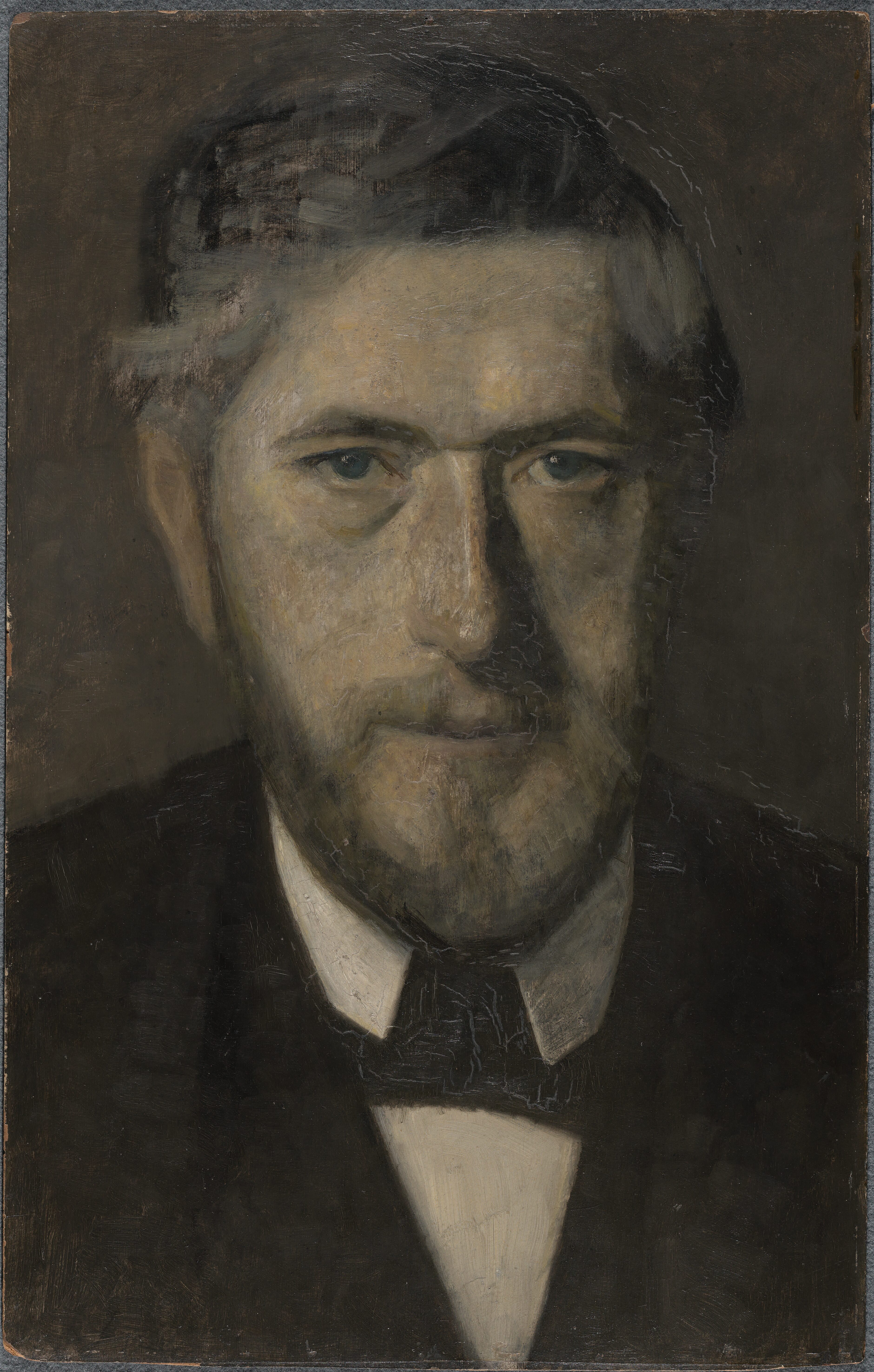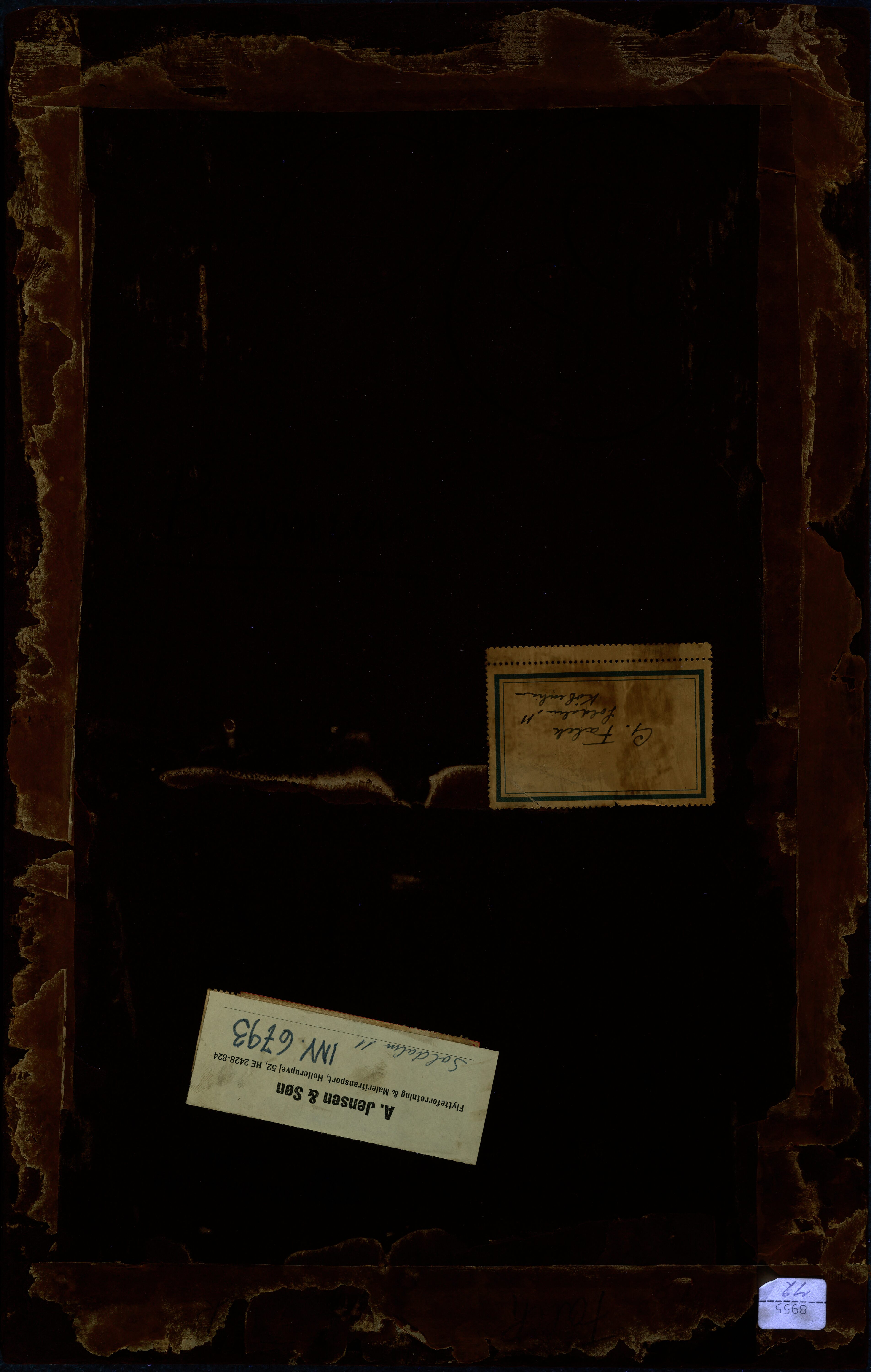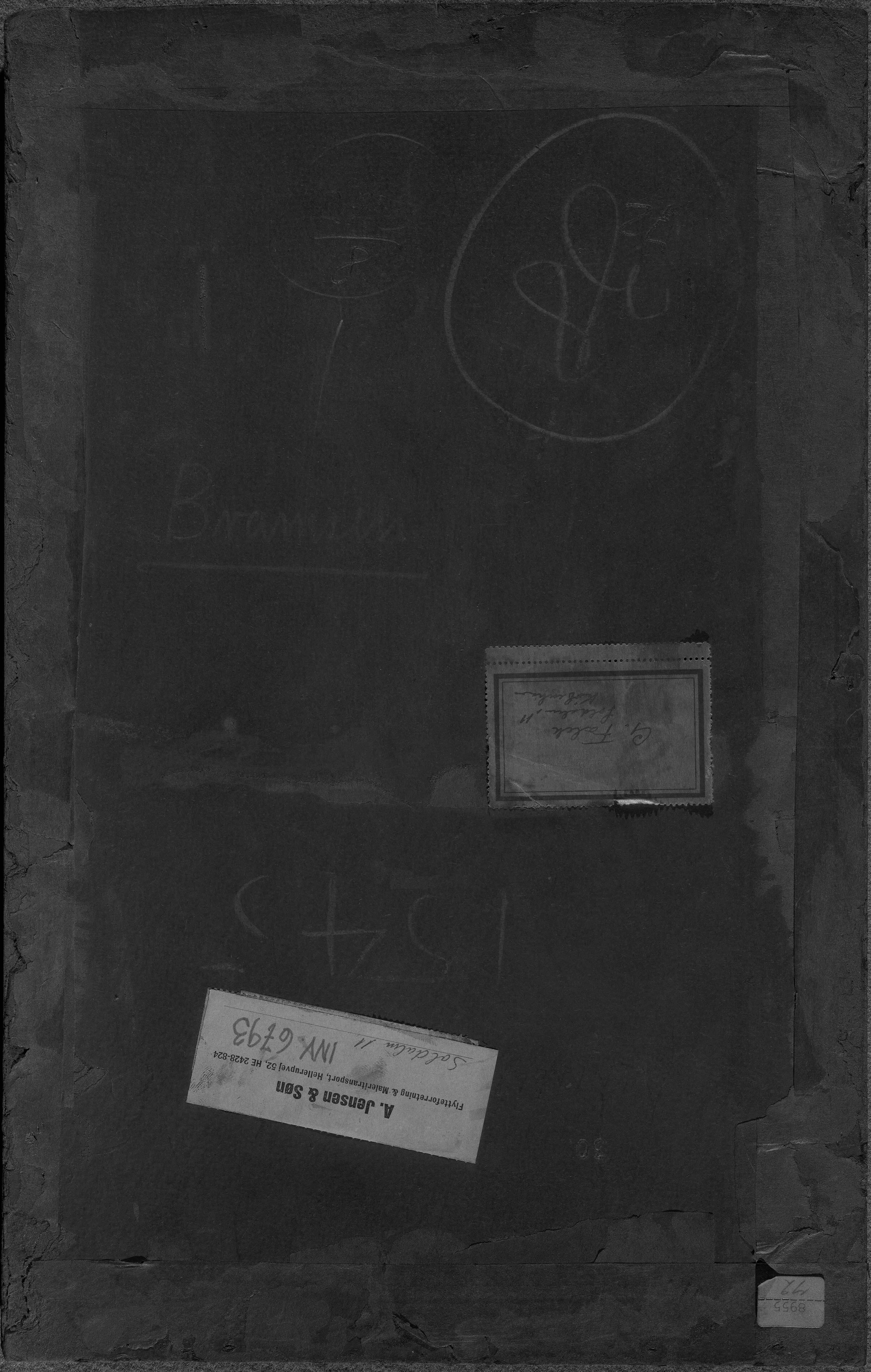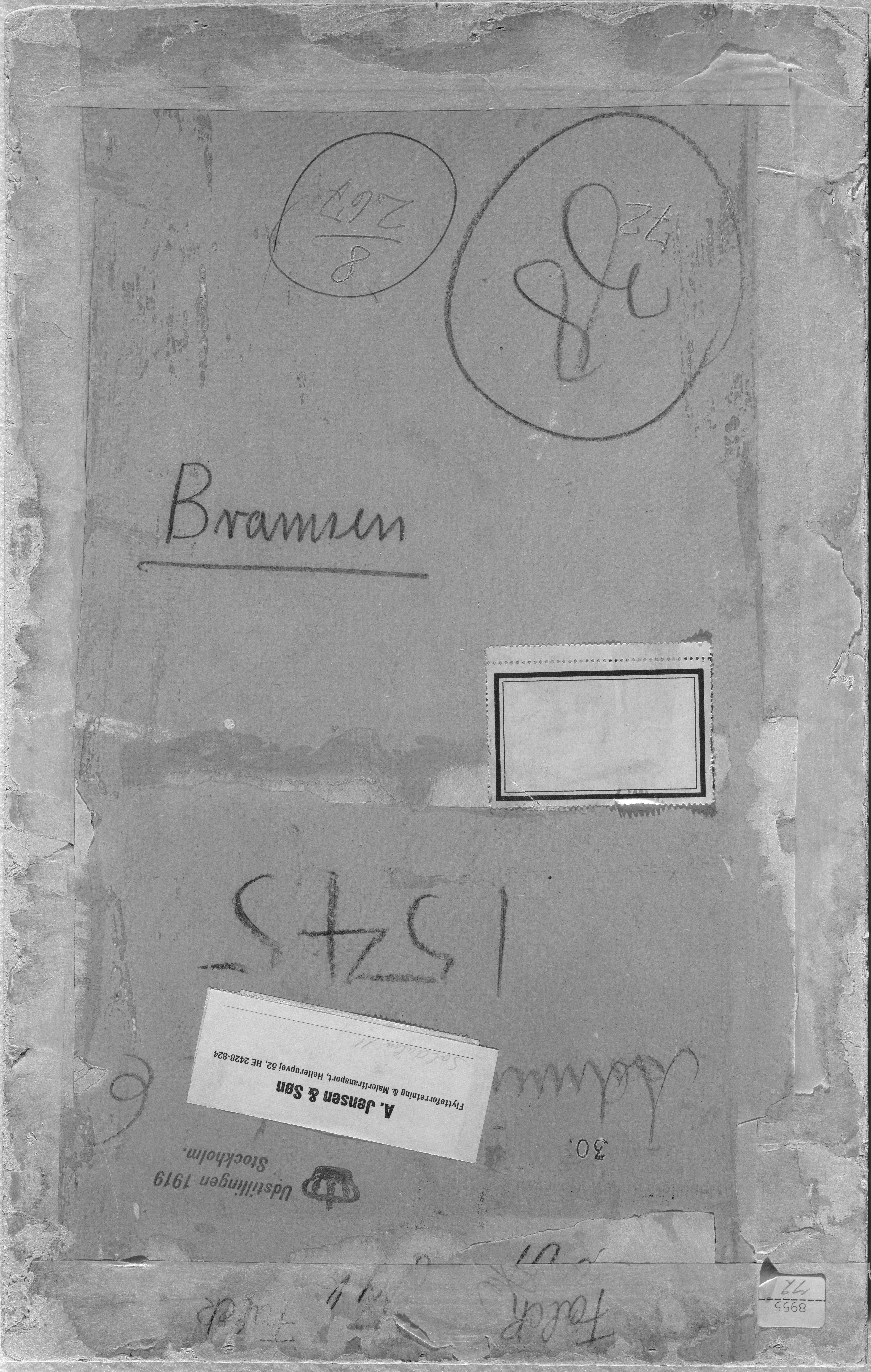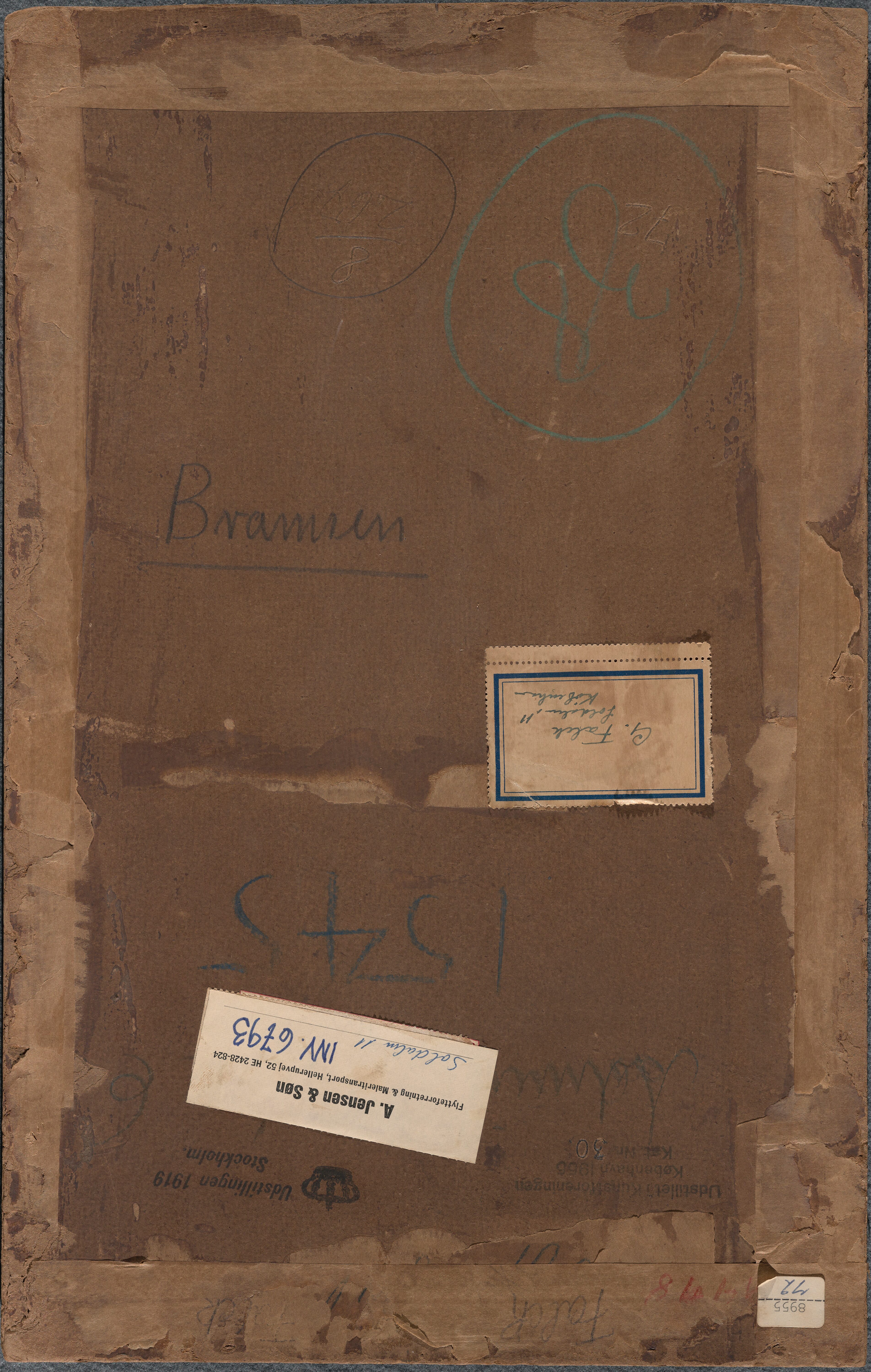 An overpainted pin hole penetrating the board at the top centre may be from mounting on a wall or a wooden board. A line cut through the paint layer close to the lower edge. On the reverse are the following labels, stamps and inscriptions: Labels: '8955____72' and 'A.Jensen & Søn. Flytteforretning& Maleritransport, Hellerupvej 52, HE 2428-824 (Handwriting) Soldalen 11 INV. 6793'. In handwriting: 'G.Falck, Soldalen 11, København'. Stamps: 'Udstillet i Kunstforeningen, København 1955, Kat. Nr. 30' and '(below a Royal crest) Udstillingen 1919 Stockholm'. Inscriptions: In red pencil: '1478'. In pencil: 'Falck' and 'Bramsen'. In blue crayon: '1545' and '38'. Other inscriptions are illegible.
