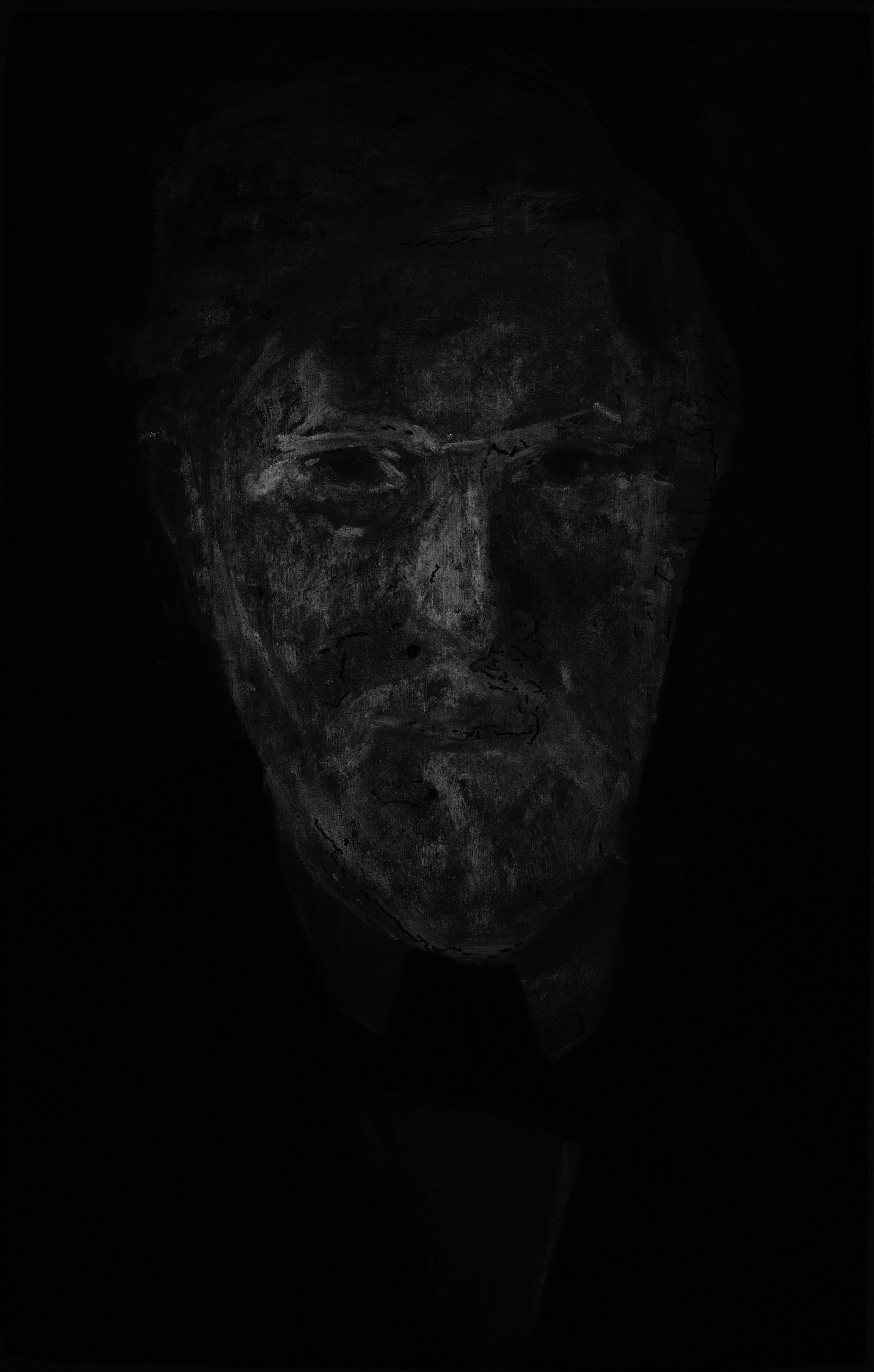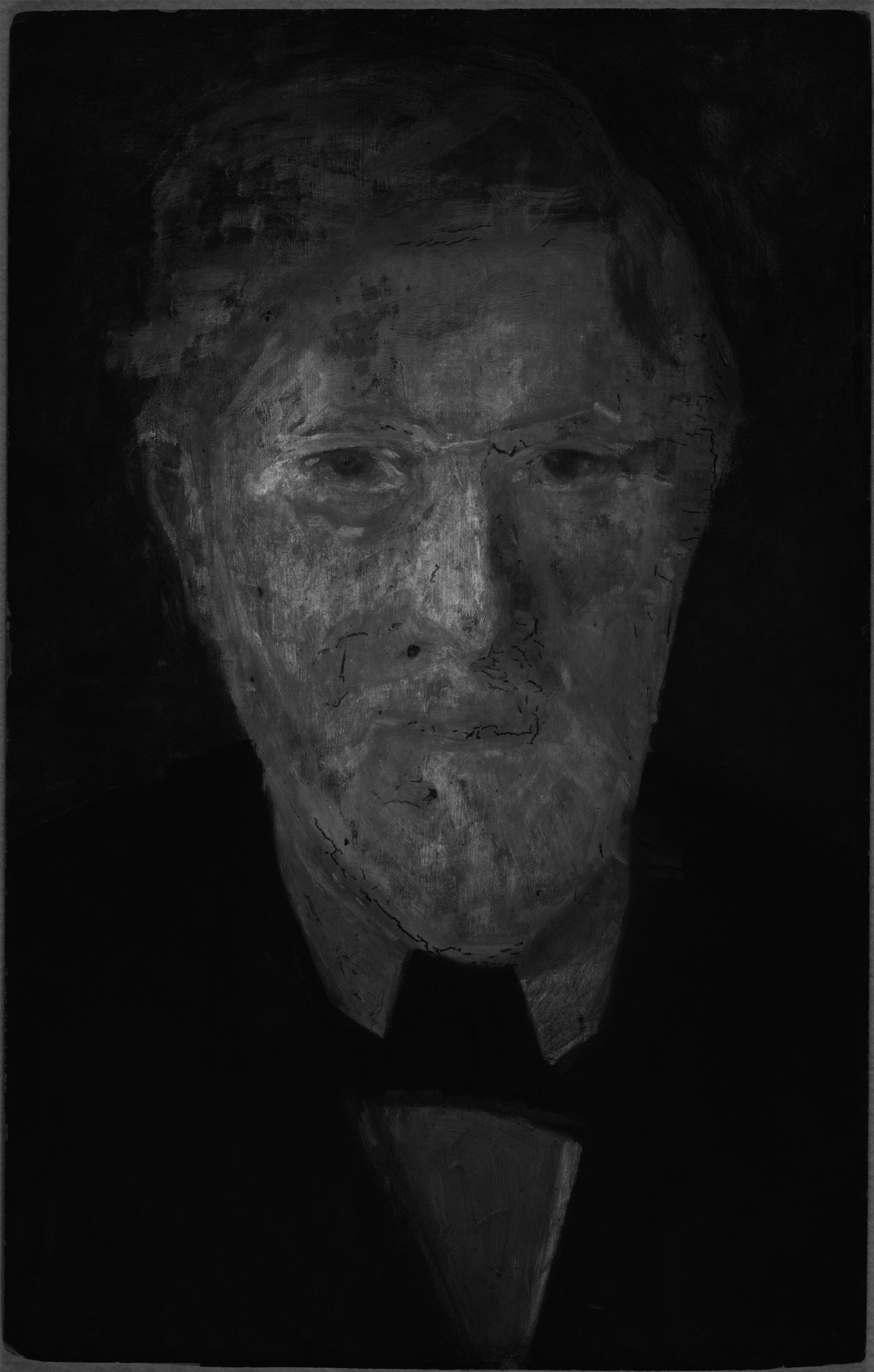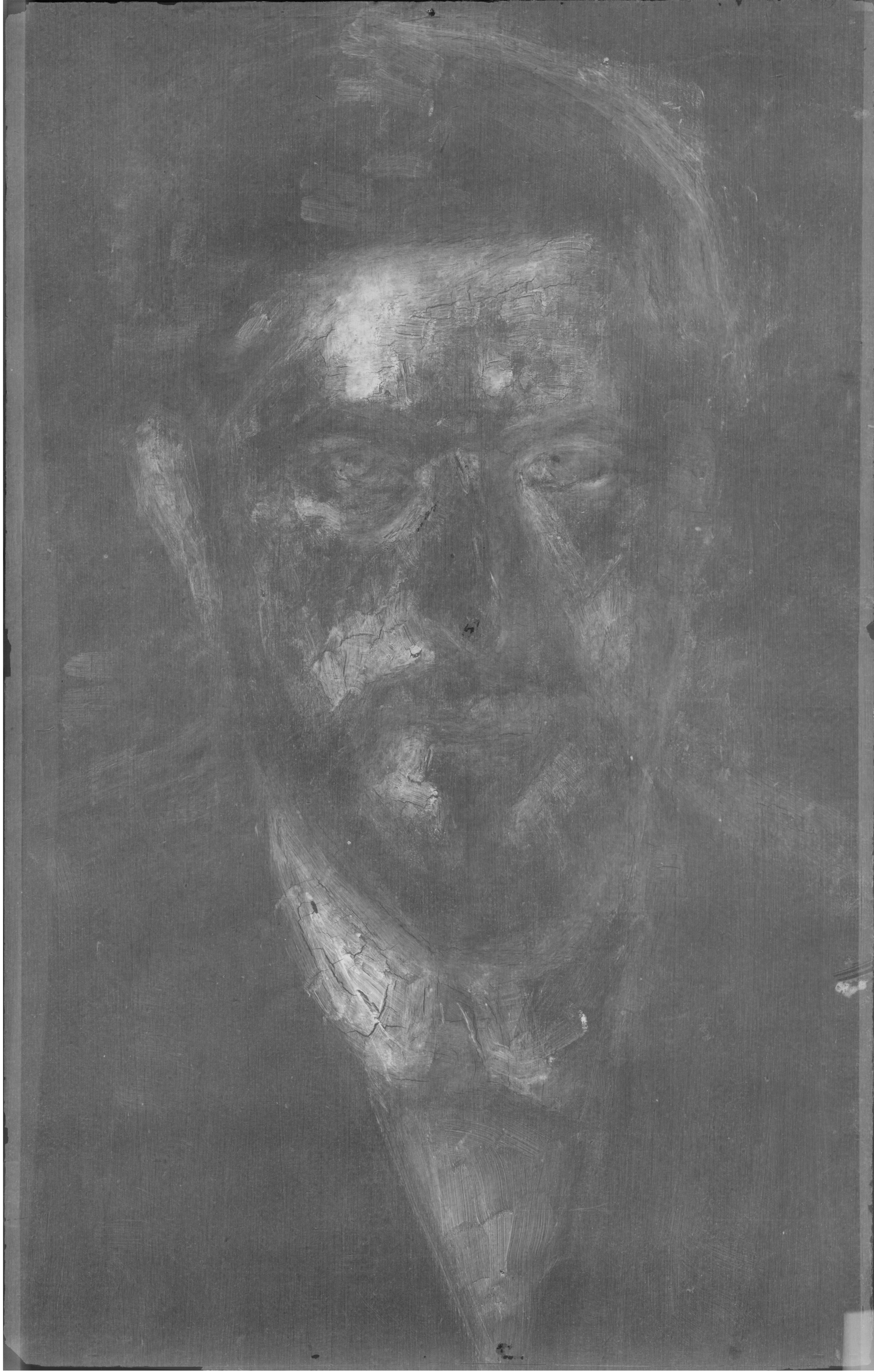 The white ground is visible through the paint layer in the background near the edges, and in the hair on the left hand side as well as in the shirt collar on the right hand side. The ground has been exposed by scraping to create the highlights of the eyes as well as the highlights of the nose.