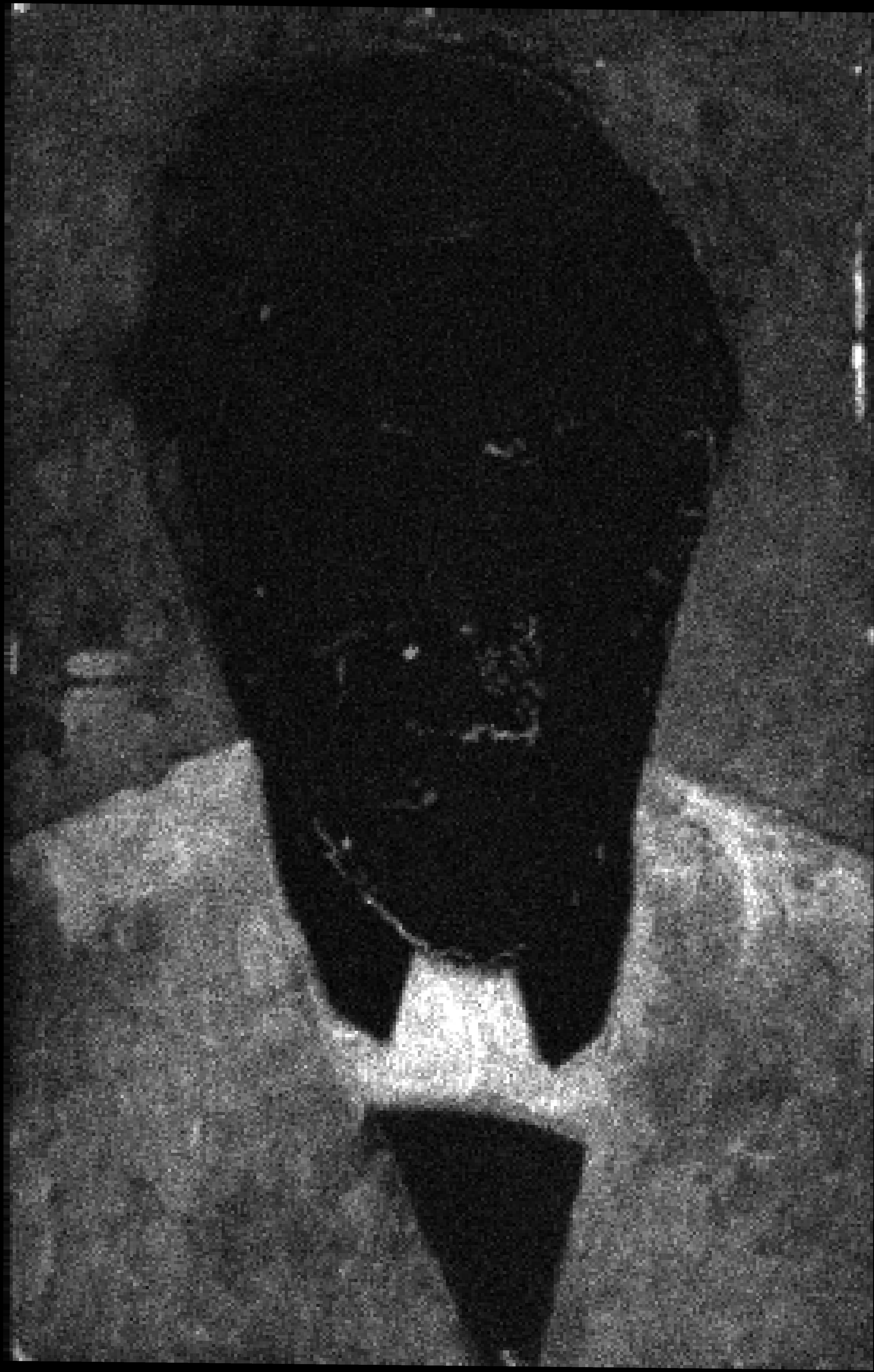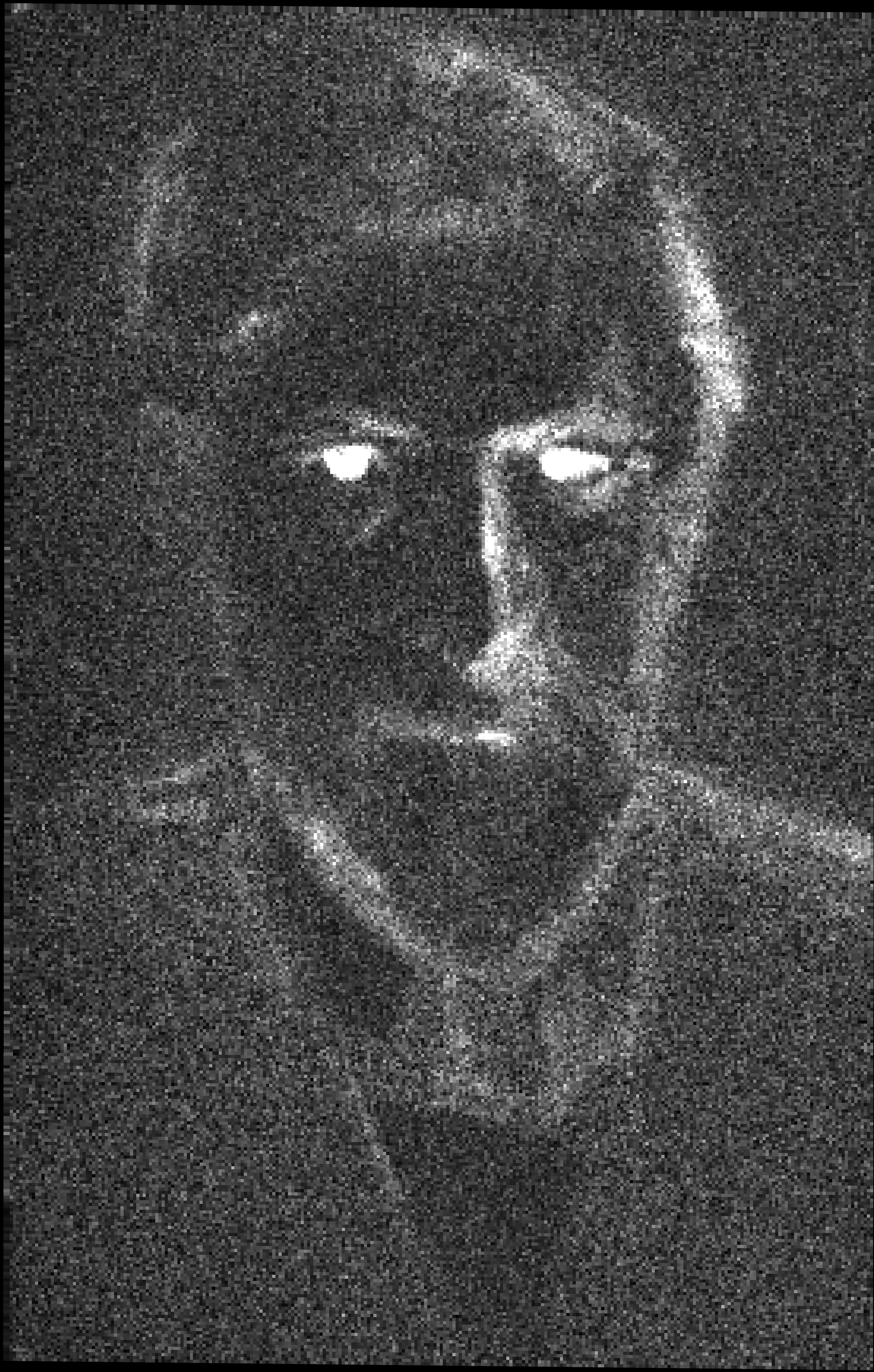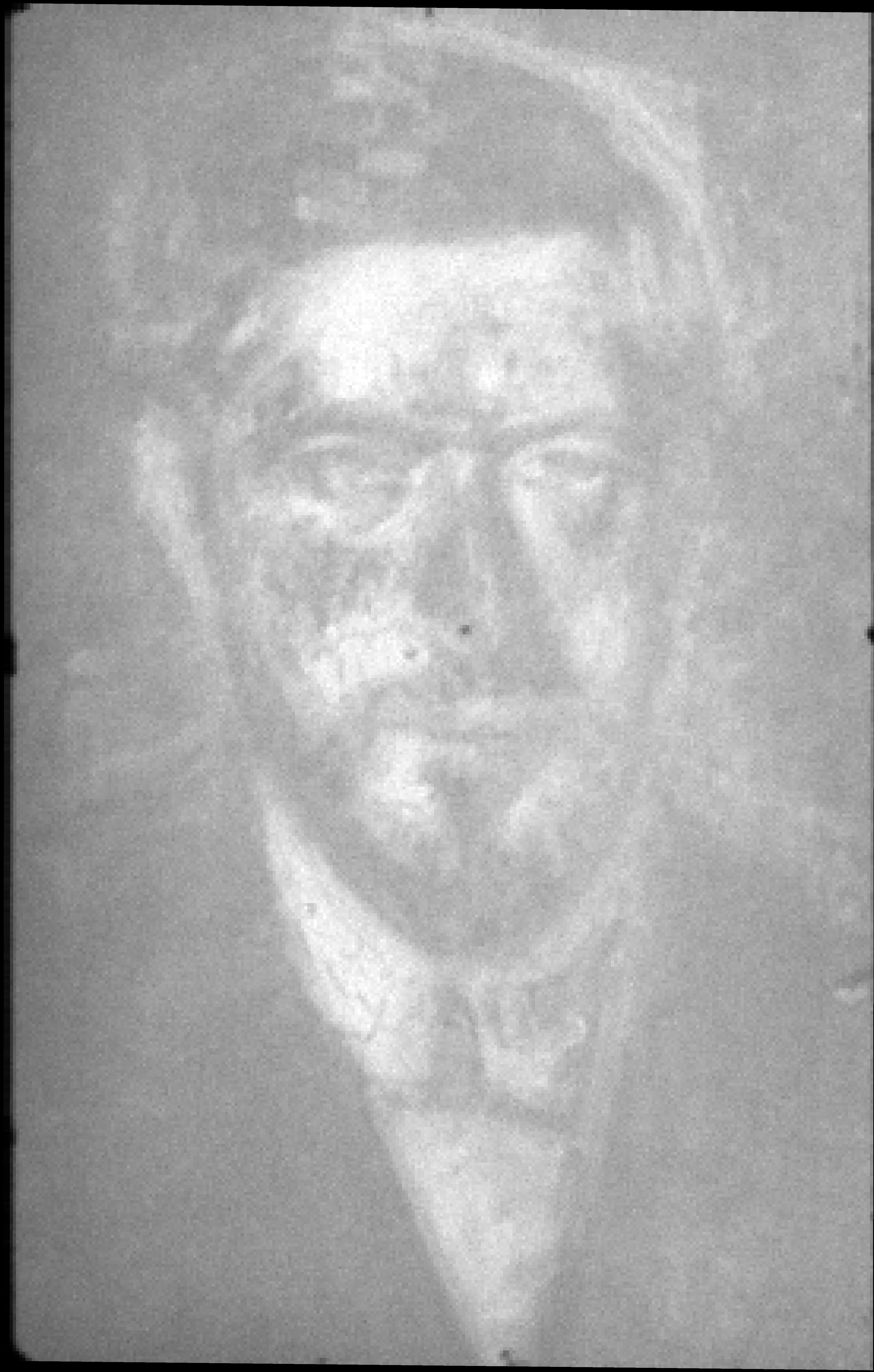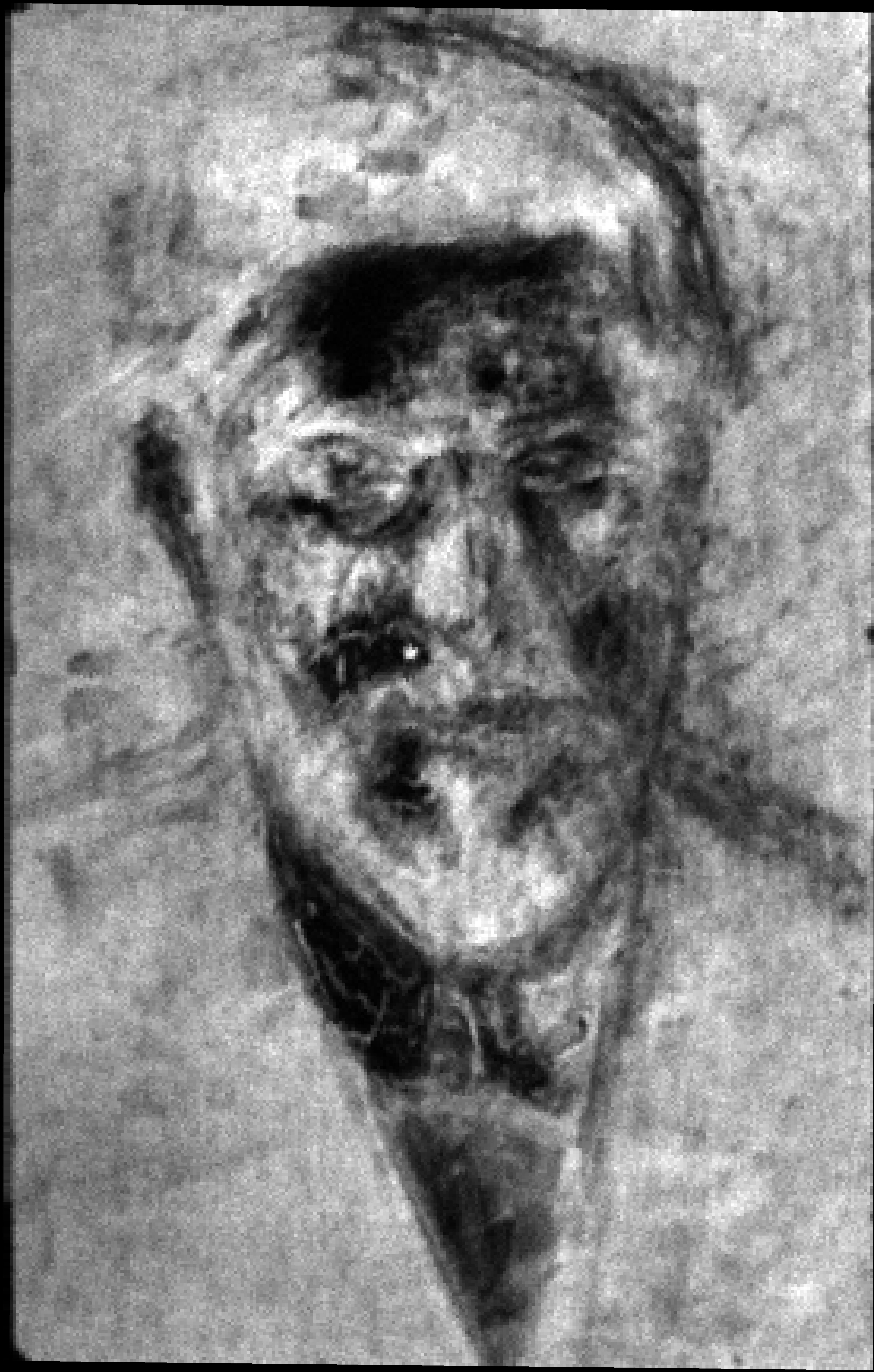 The white ground is visible through the paint layer in the background near the edges, and in the hair on the left hand side as well as in the shirt collar on the right hand side. The ground has been exposed by scraping to create the highlights of the eyes as well as the highlights of the nose.