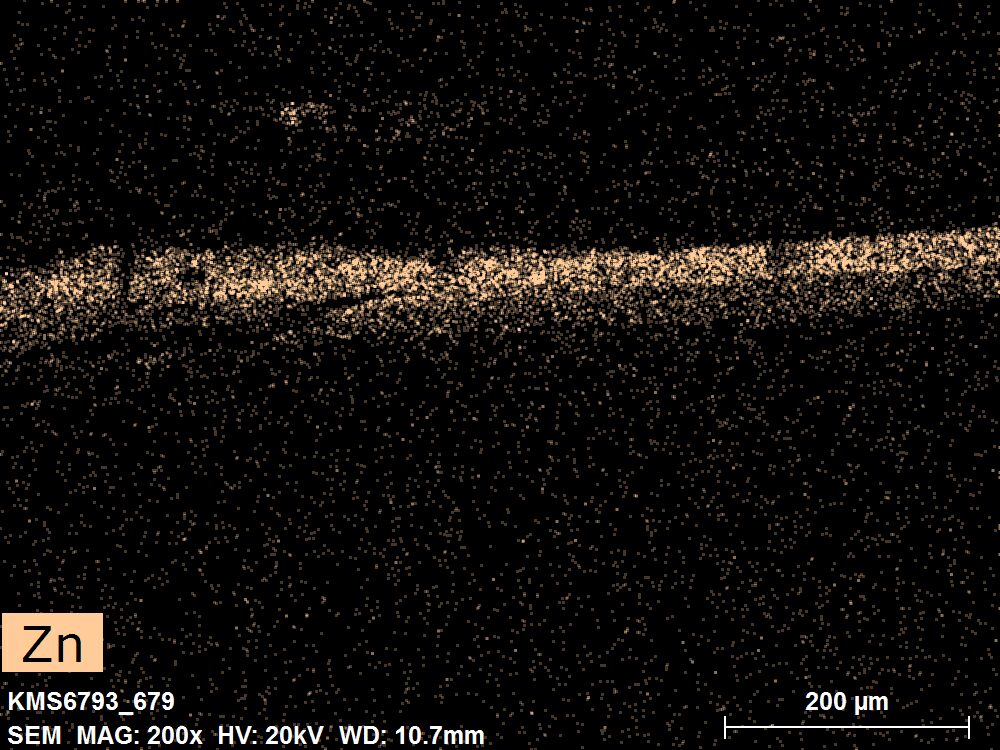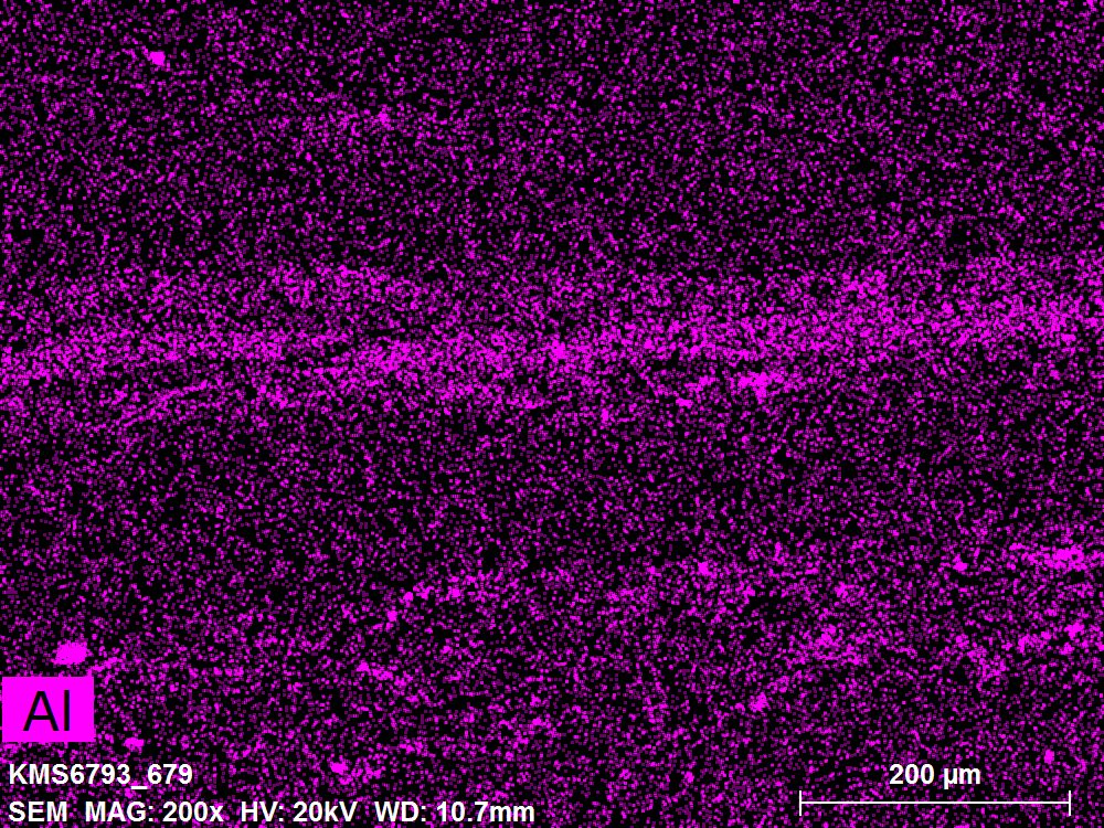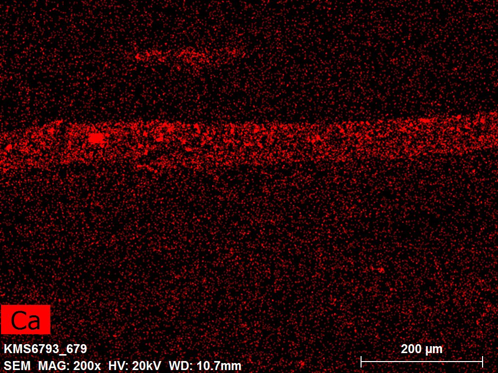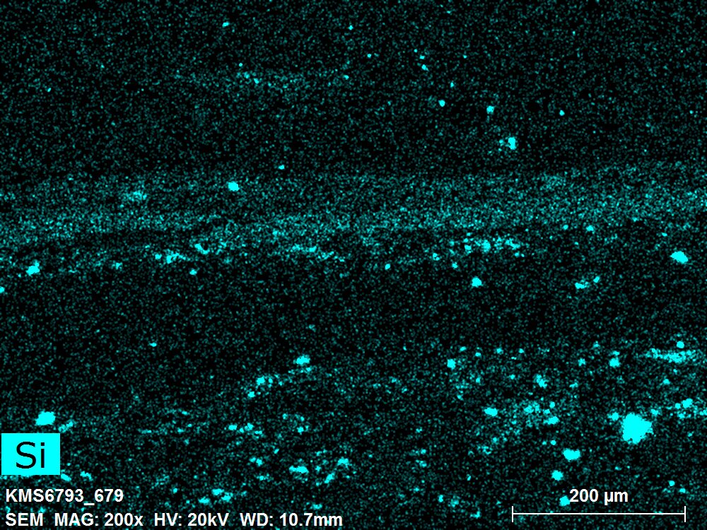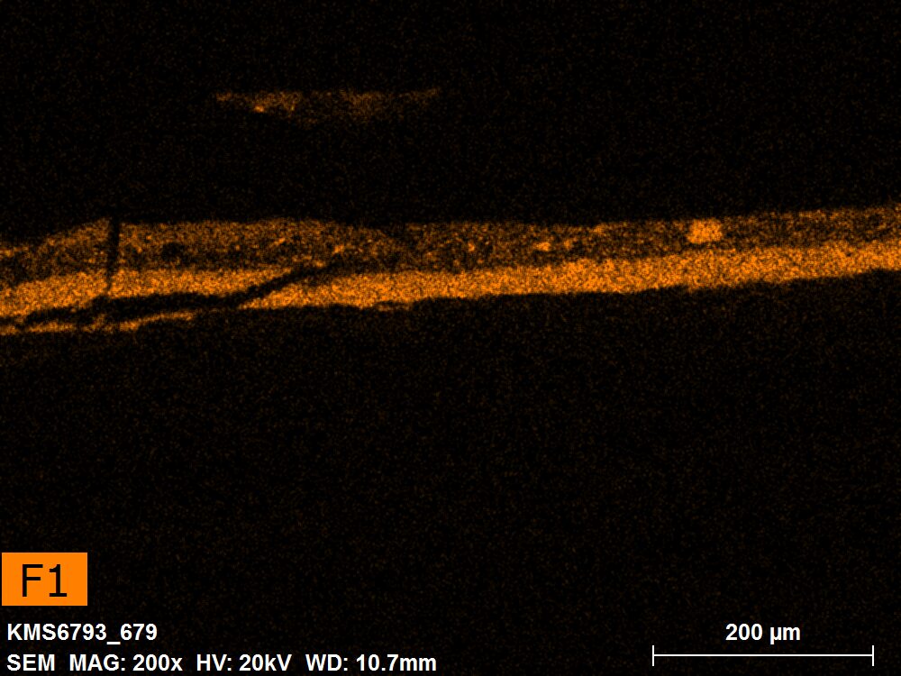 SEM-EDXS is a technique that provides highly detailed images at the microscopic level while simultaneously identifying the elemental composition of a sample. It is particularly valuable for studying the stratigraphy of paint cross sections at very fine scales, for the chemical characterisation of pigments, fillers and degradation products, and for detecting trace elements that may indicate very specific materials. Below, the elements listed in parentheses refer to minor elements whose relative abundance is below 10% of the total signal. The F1 map below represents the Pb M line. Read more under SEM-EDXS in the glossary.