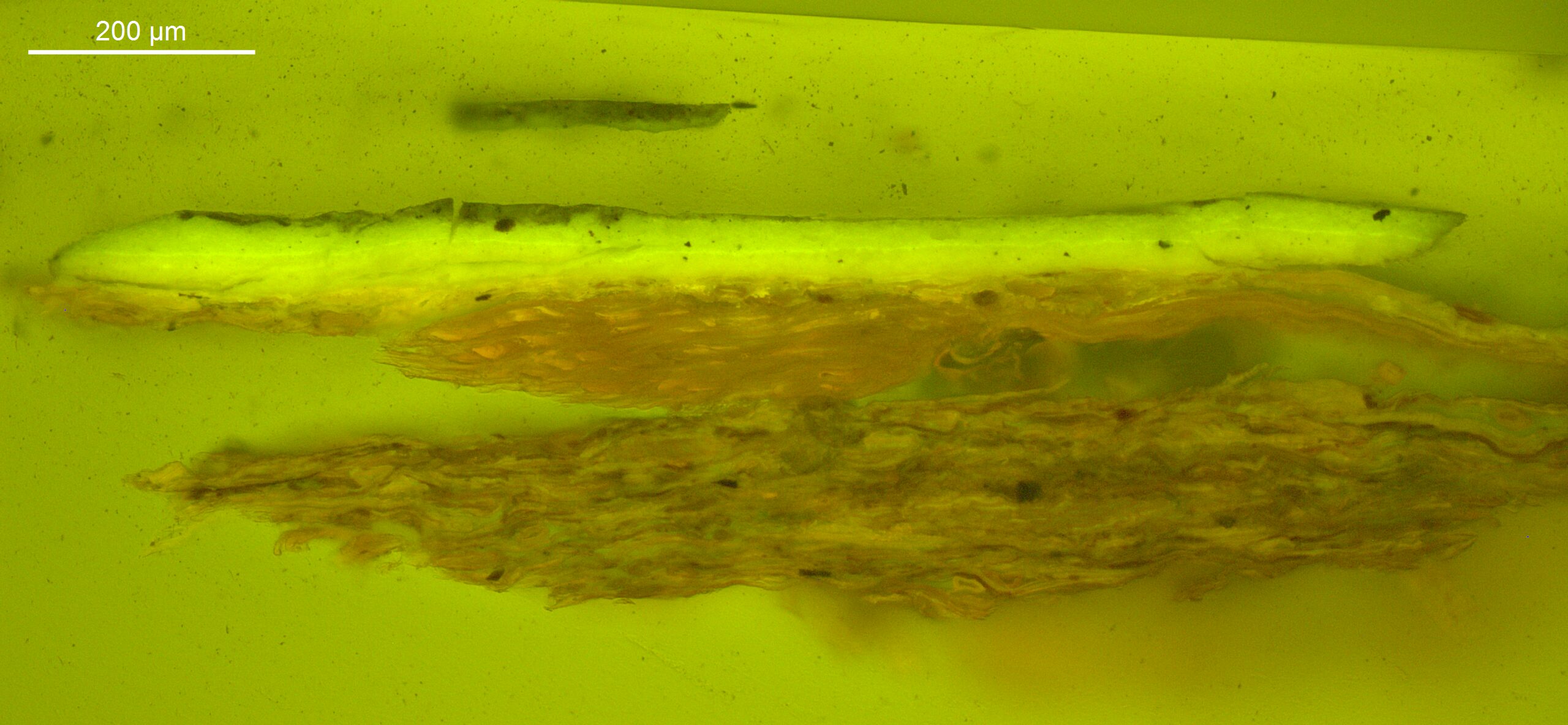 Optical microscopy uses visible light and lenses to magnify and examine the surface and structure of a painting. When applied to cross sections of paint samples, it allows for detailed observation of a painting’s stratigraphy (layer structure) and pigment particles. It is often employed with various illumination techniques, such as dark field and UV fluorescence, to enhance the analysis. Layer number 1 in the results section below the images refers to the layer at the bottom of the cross section.