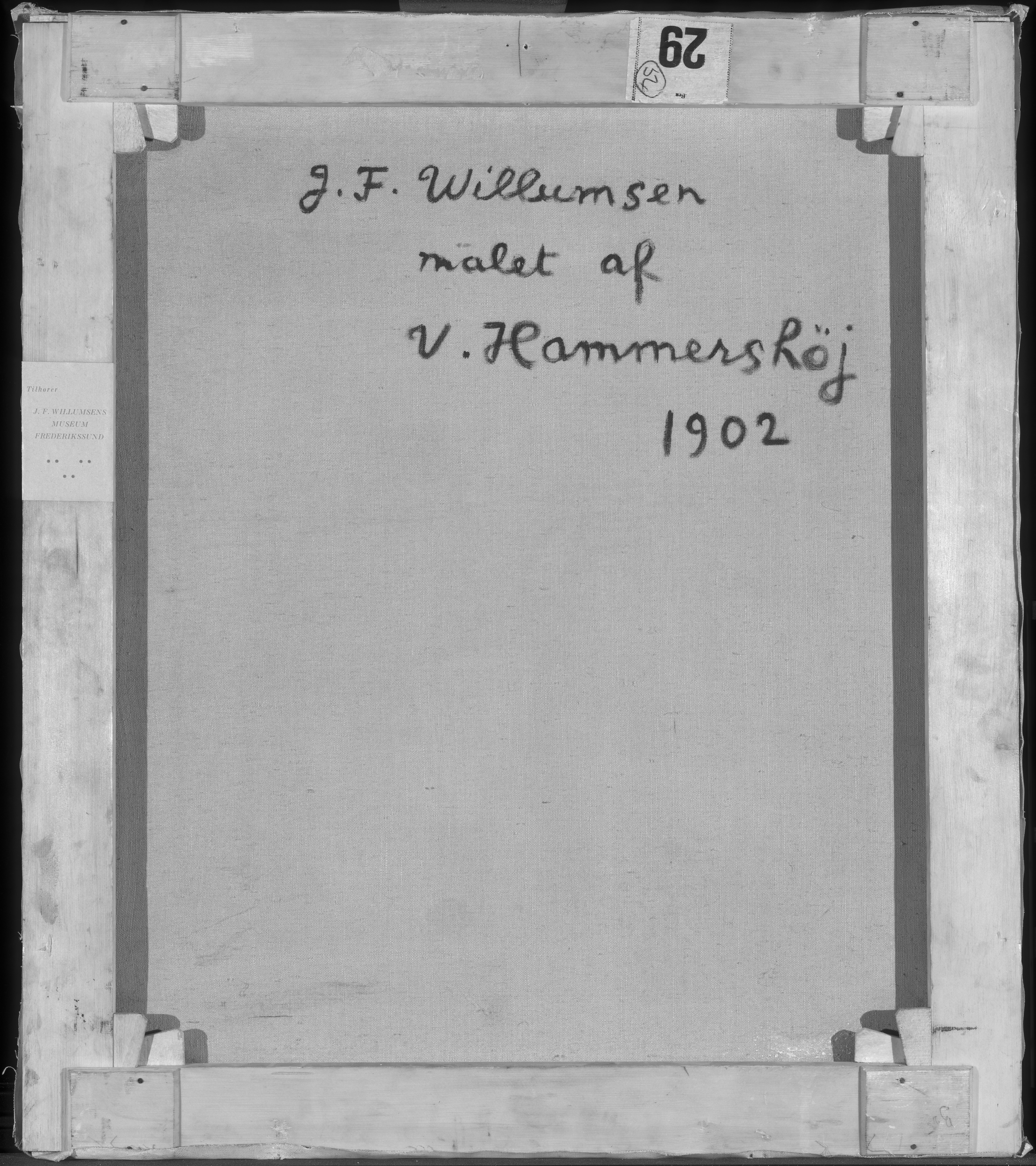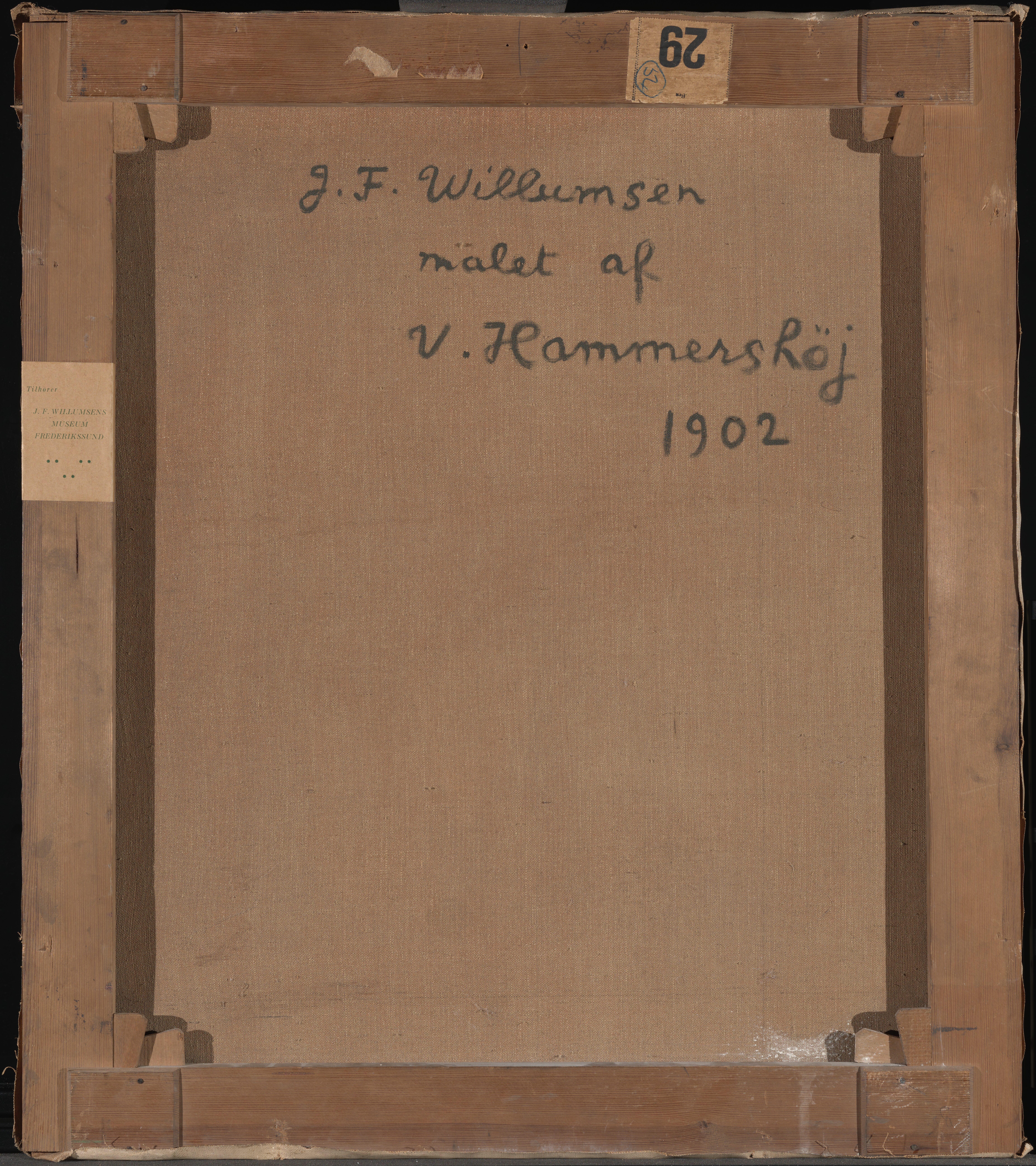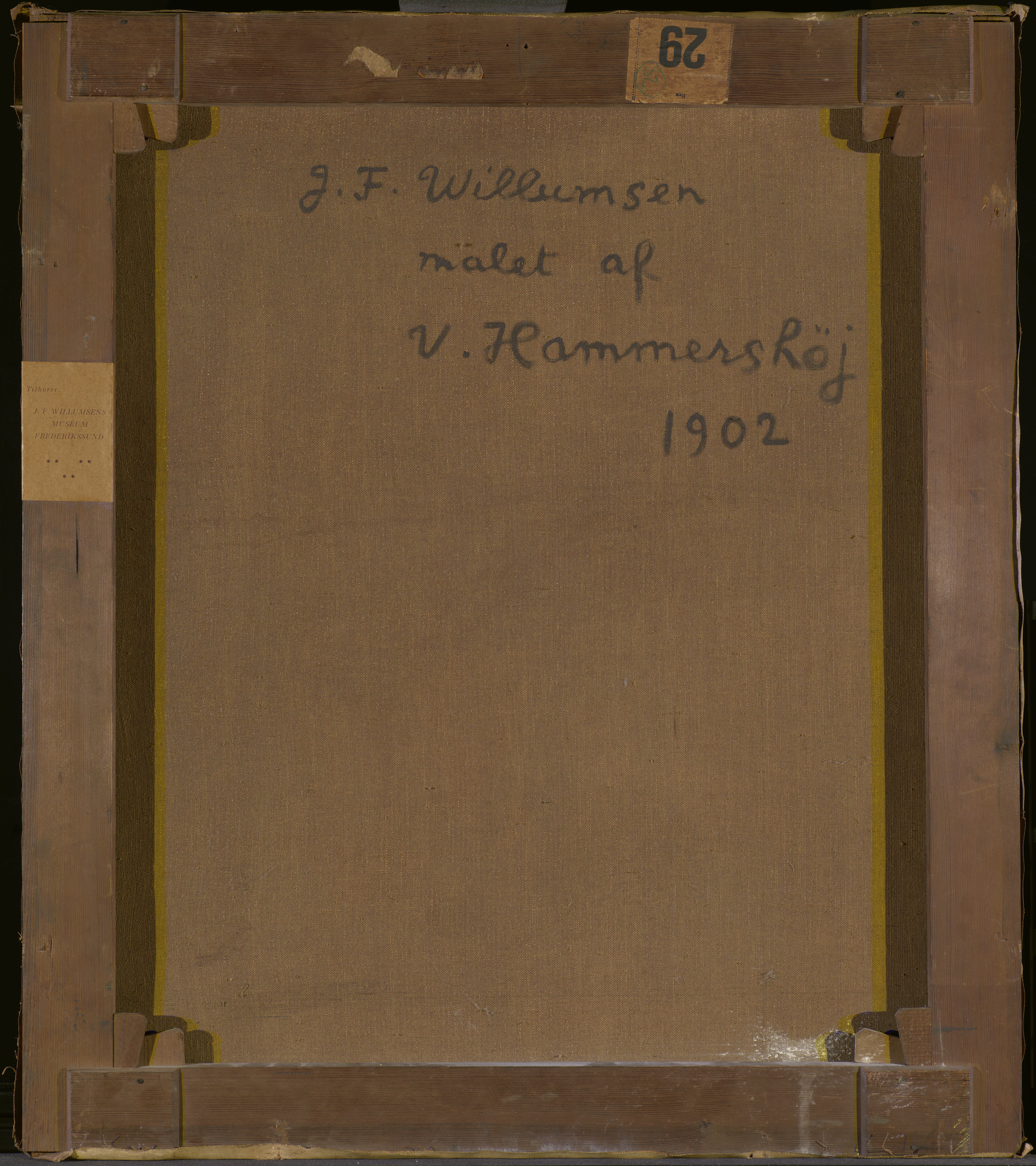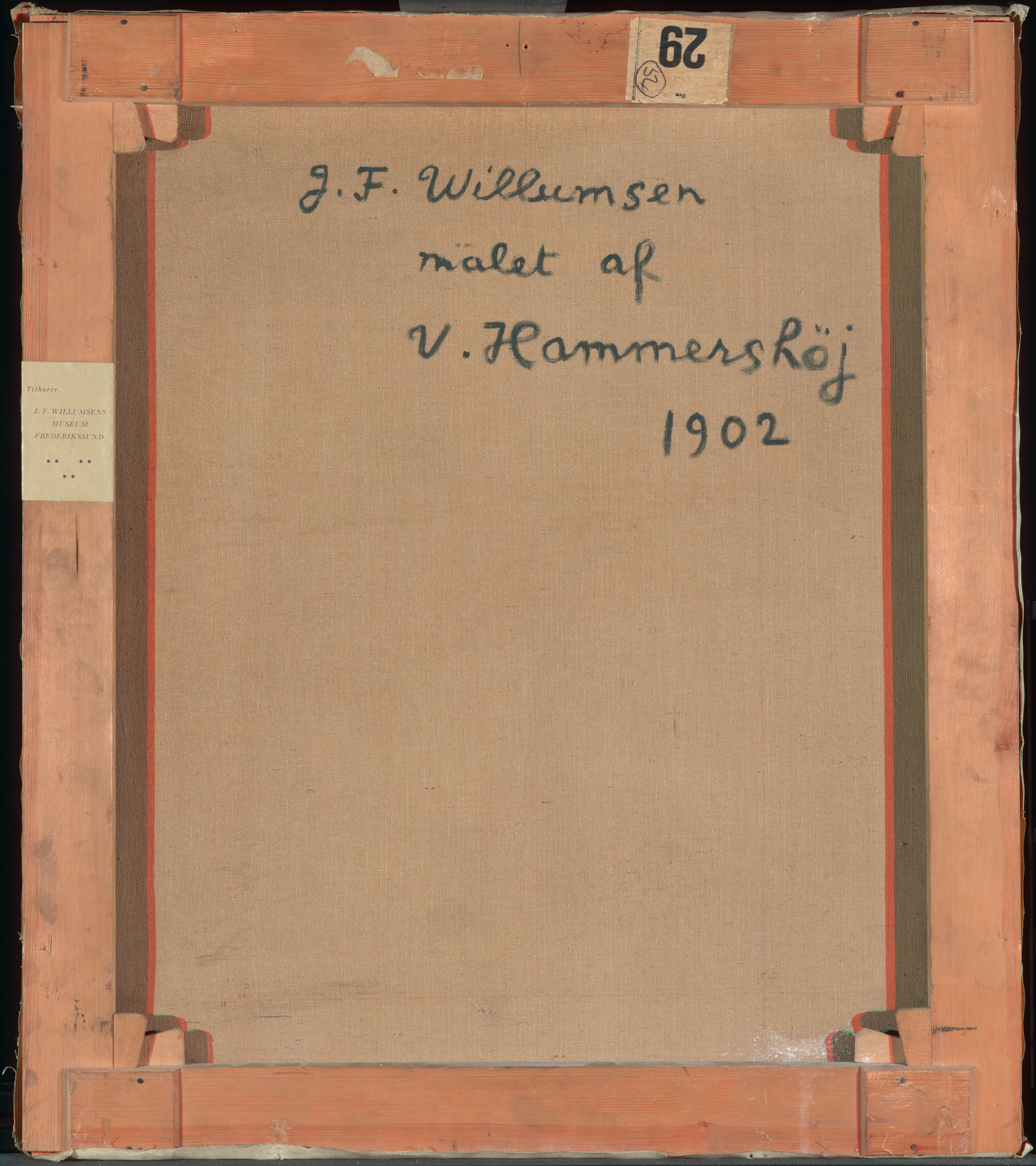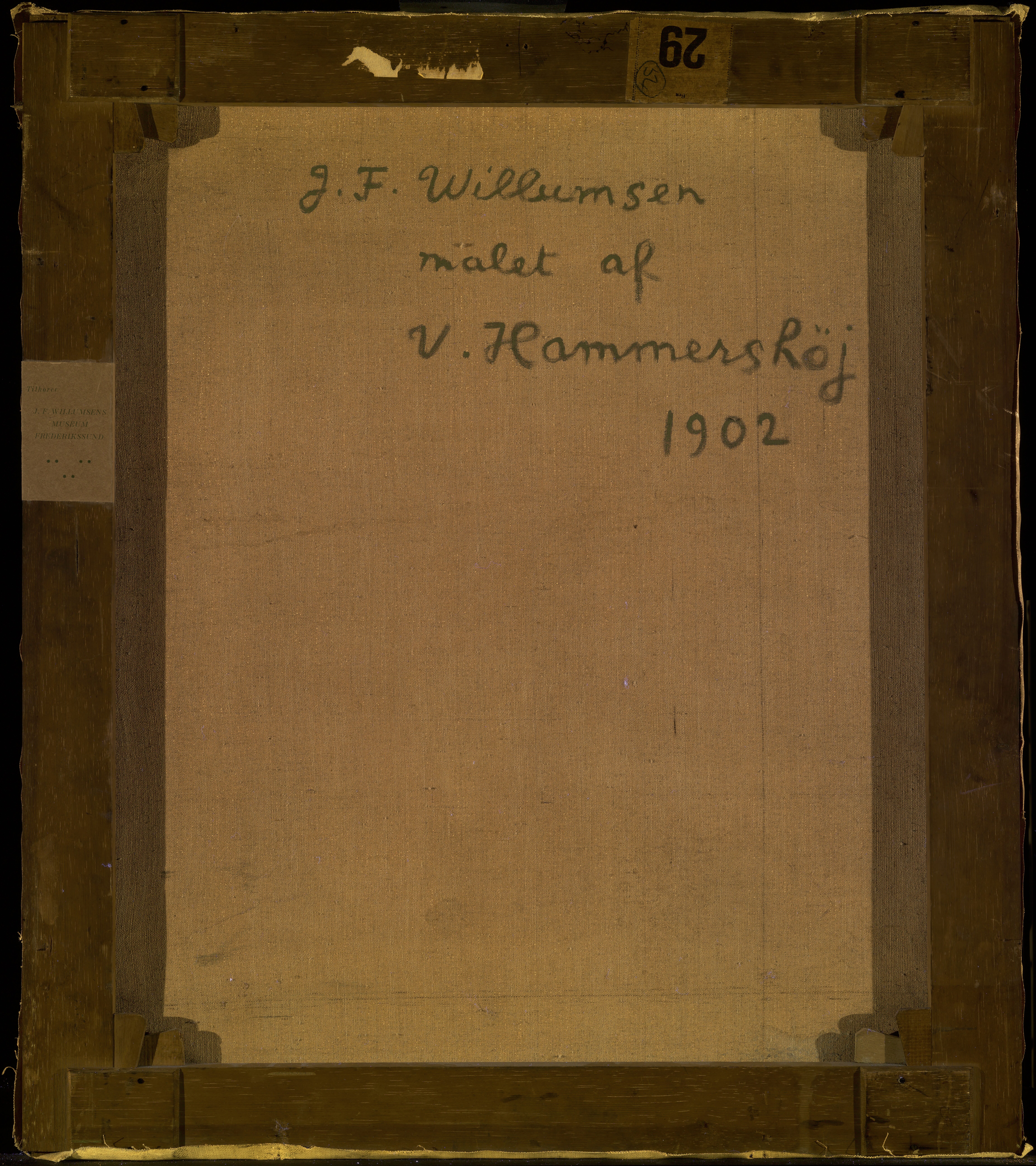 An inscription in black paint, in Willumsen's own hand, on the reverse of the canvas: "J.F. Willumsen malet af V. Hammershöj 1902" is at odds with the dating of the painting in the Bramsen (1918) p. 99 in which the date is a year earlier, i.e. the same as the “Fem portrætter”. J.F. Willumsen’s dating suggests that the portrait may be a repetition after the figure in the large group portrait, rather than a preliminary study. Maybe Willumsen himself requested a replica from Hammershøi? And furthermore Willumsen might have added paint himself at the bottom of the painting?