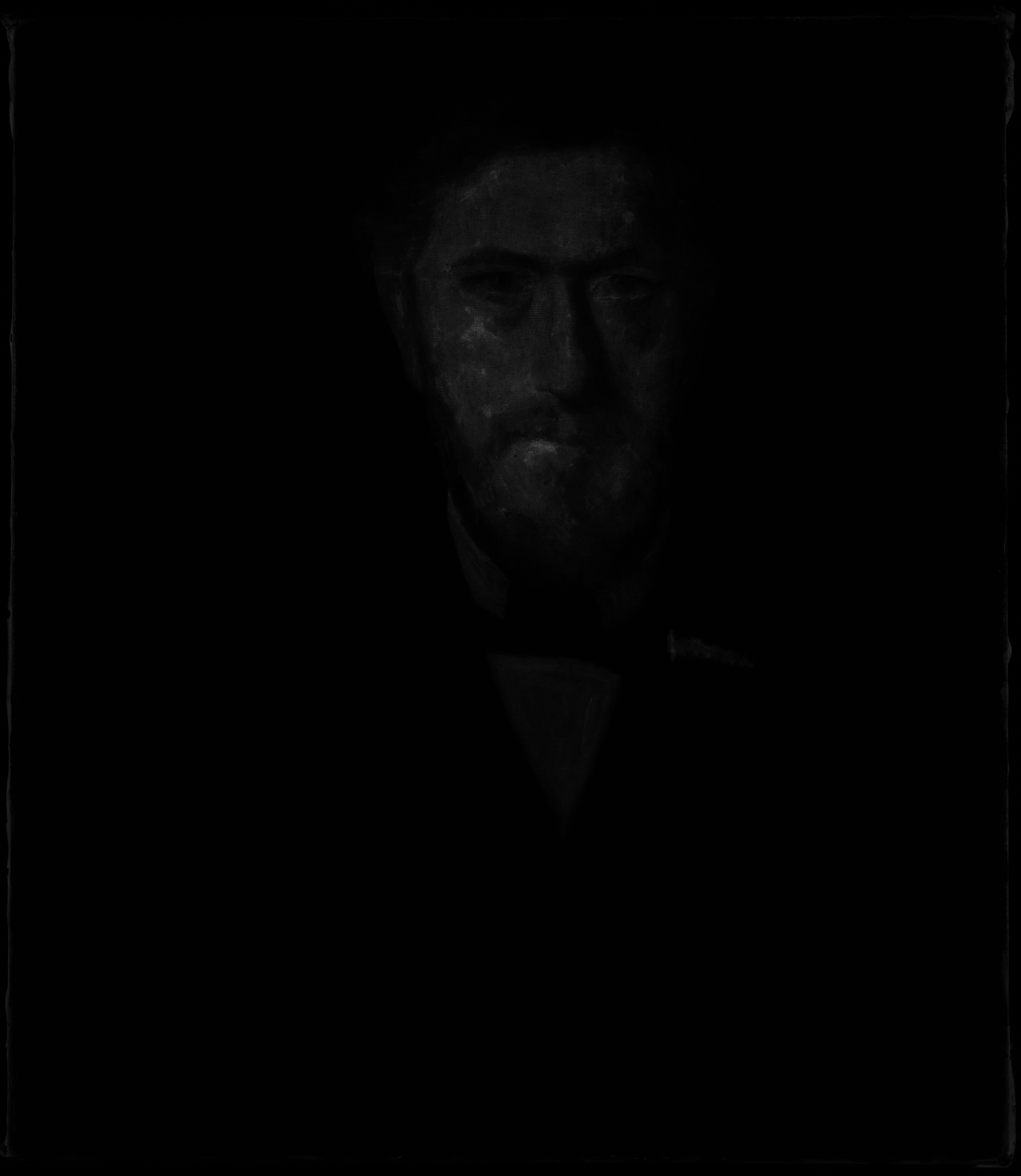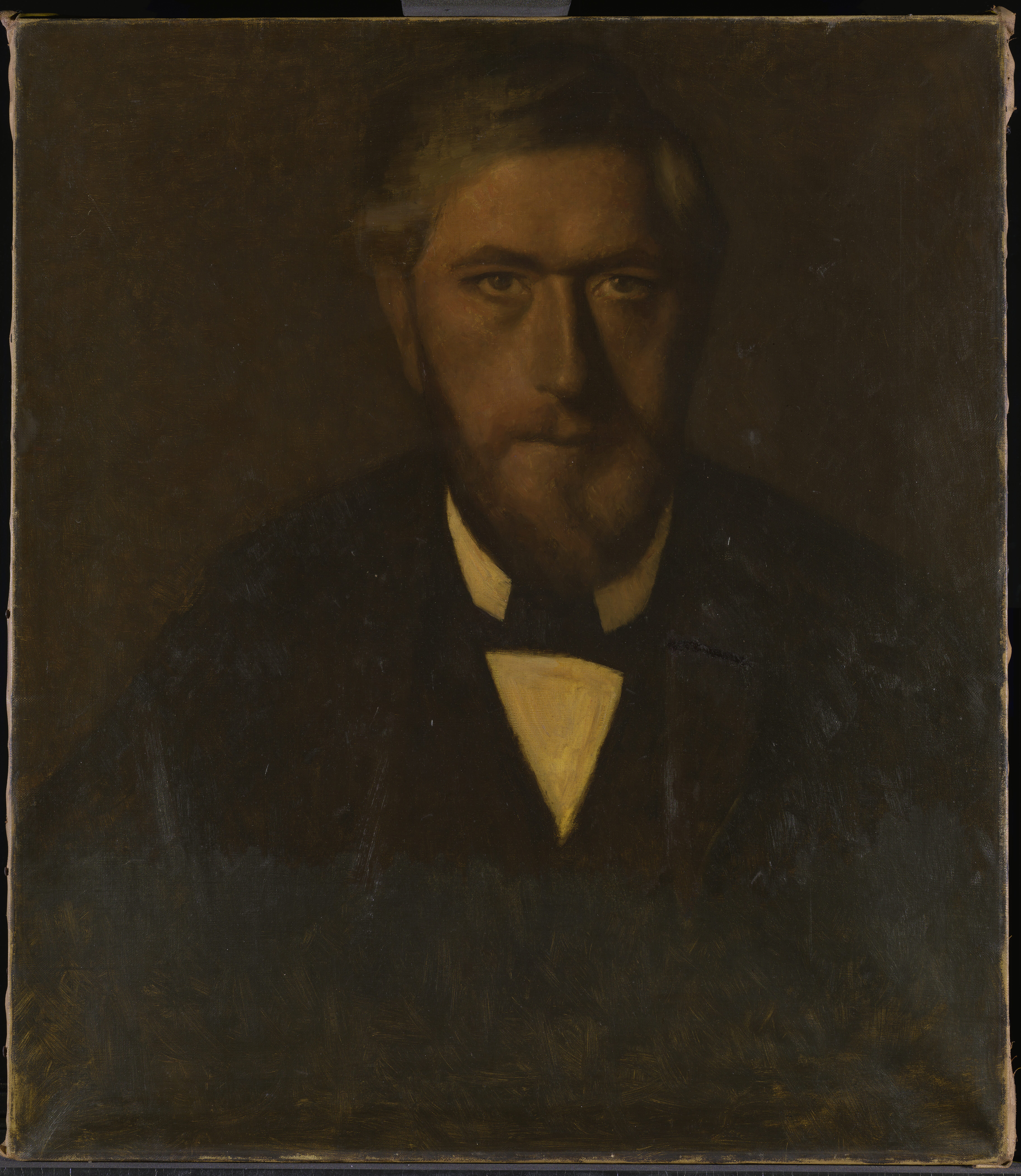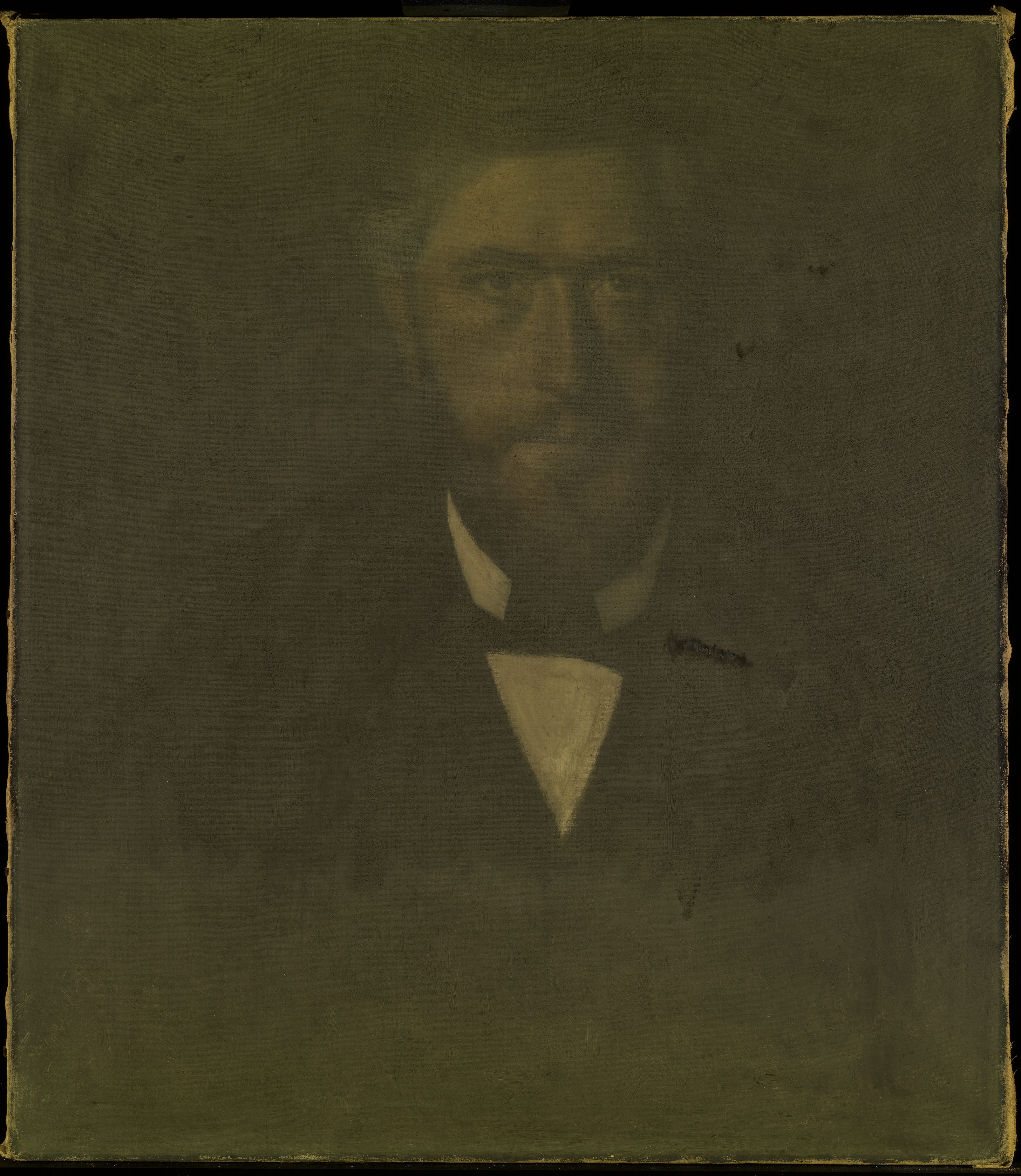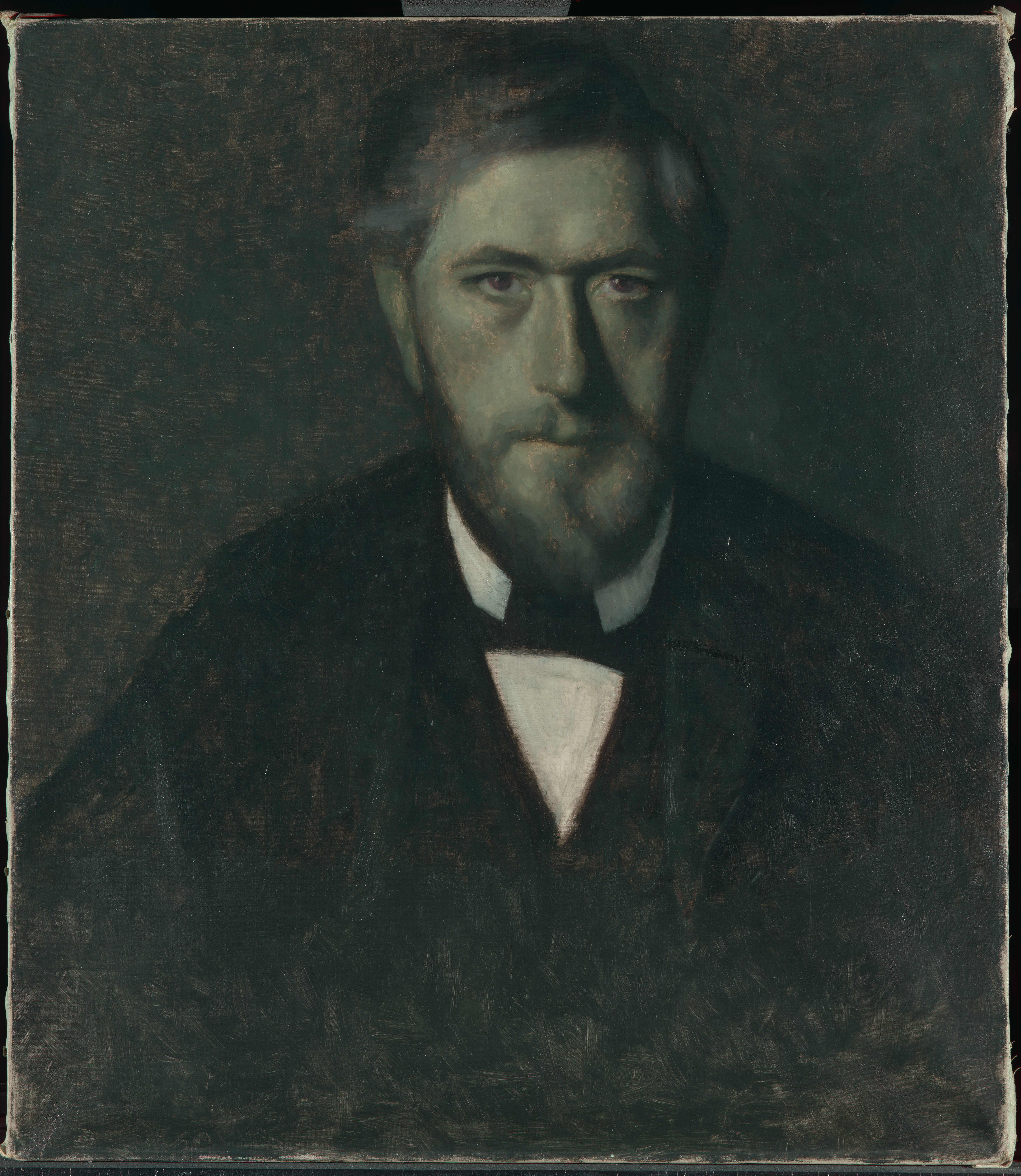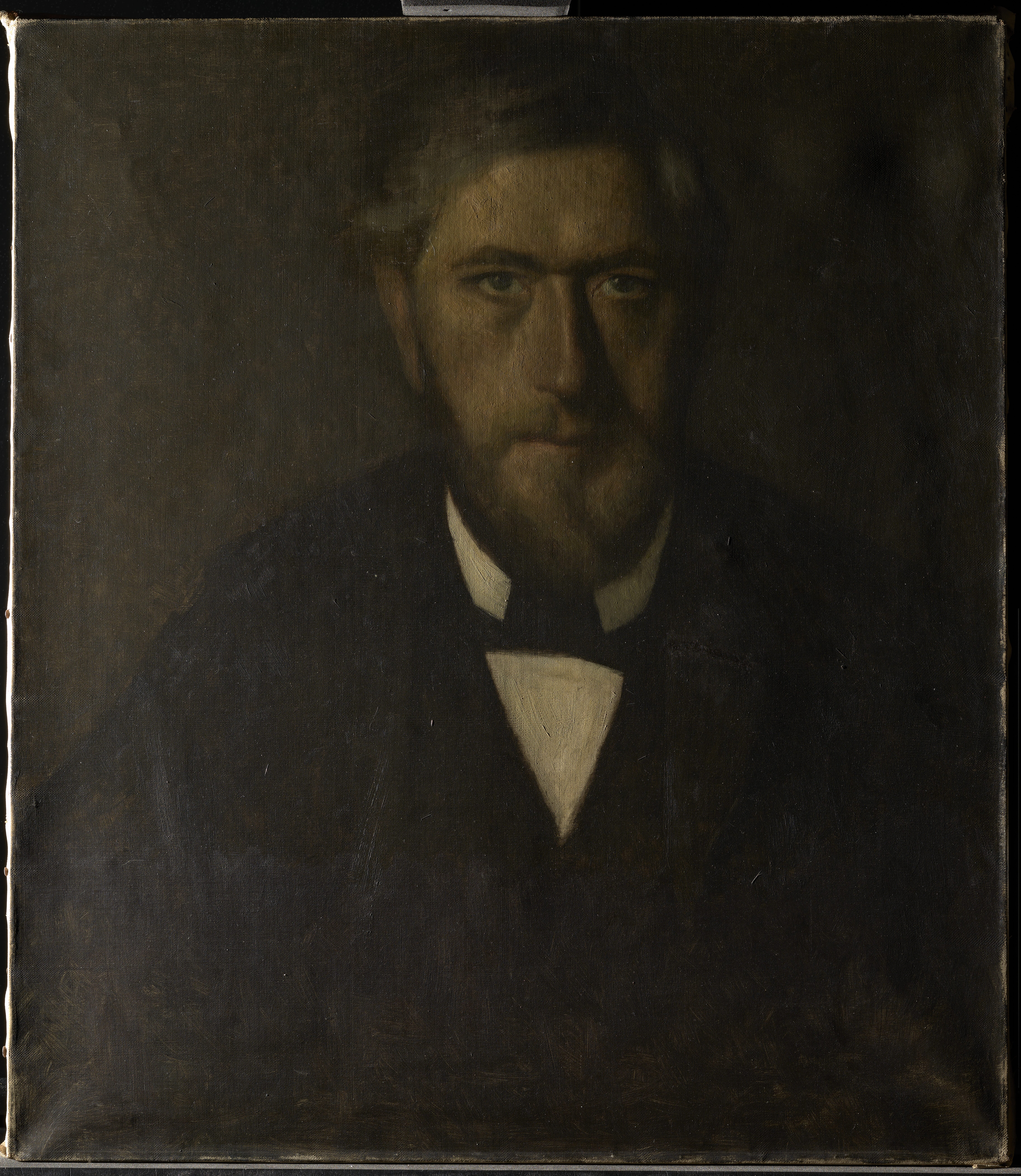 An inscription in black paint, in Willumsen's own hand, on the reverse of the canvas: "J.F. Willumsen malet af V. Hammershöj 1902" is at odds with the dating of the painting in the Bramsen (1918) p. 99 in which the date is a year earlier, i.e. the same as the “Fem portrætter”. J.F. Willumsen’s dating suggests that the portrait may be a repetition after the figure in the large group portrait, rather than a preliminary study. Maybe Willumsen himself requested a replica from Hammershøi? And furthermore Willumsen might have added paint himself at the bottom of the painting?