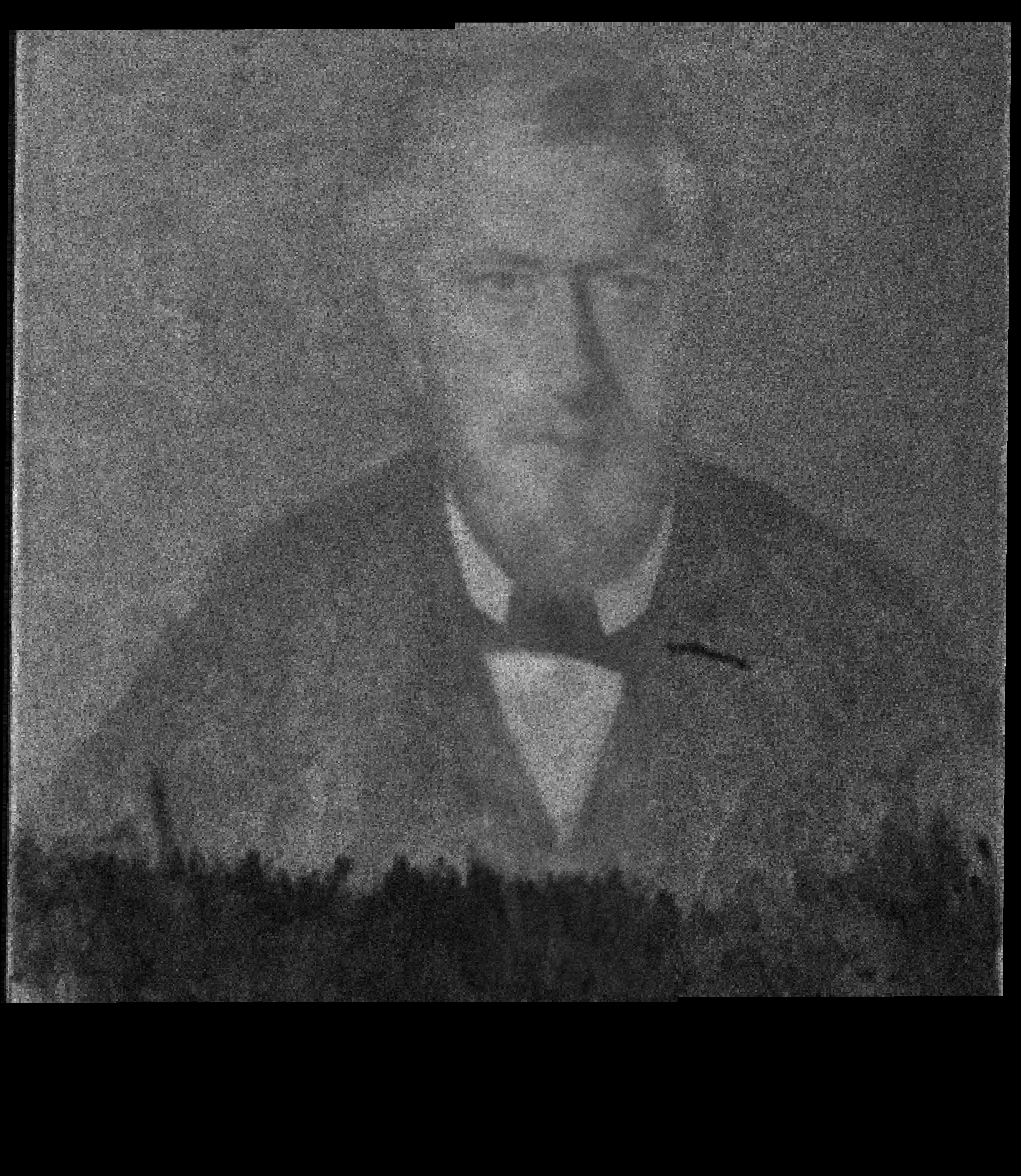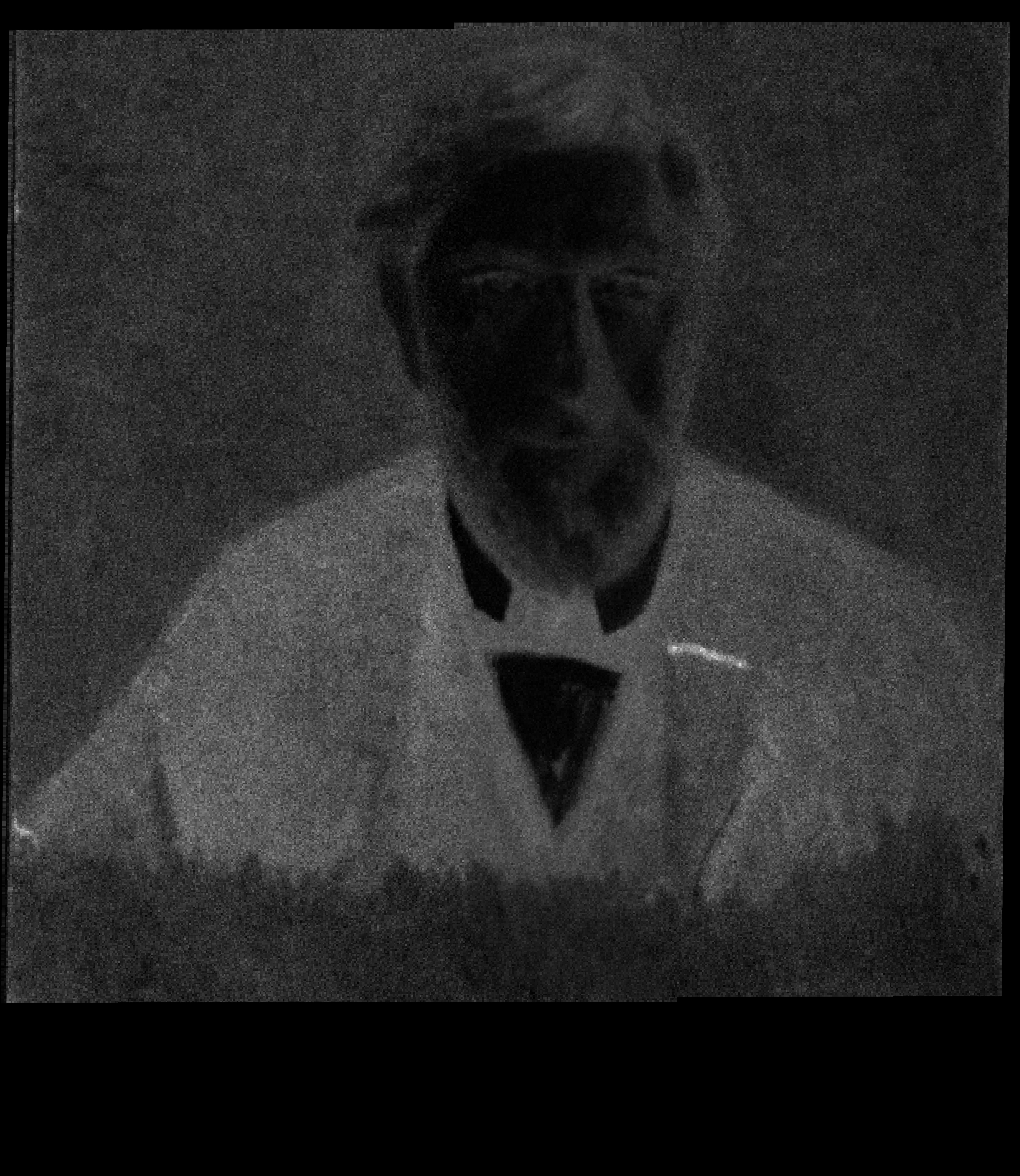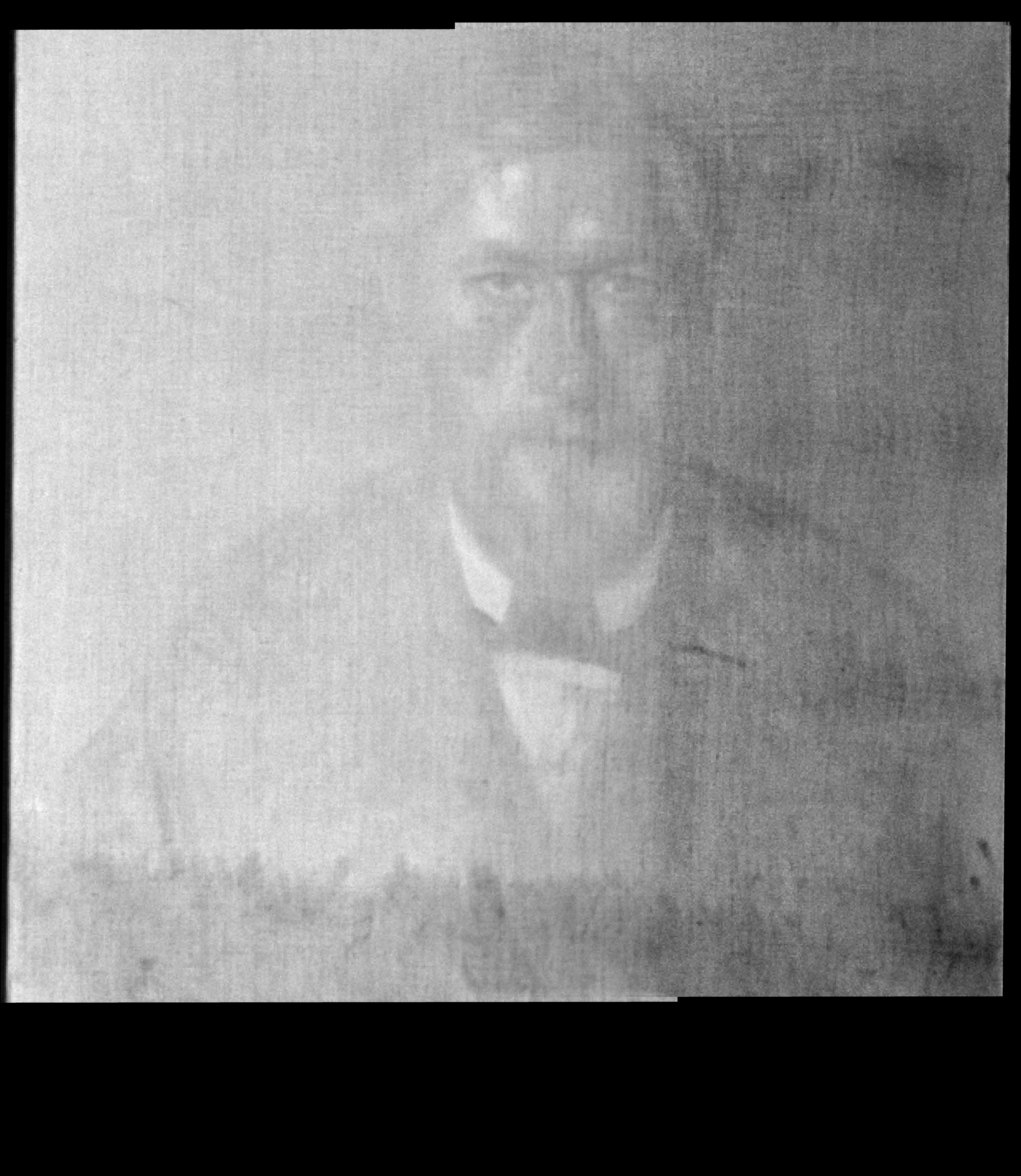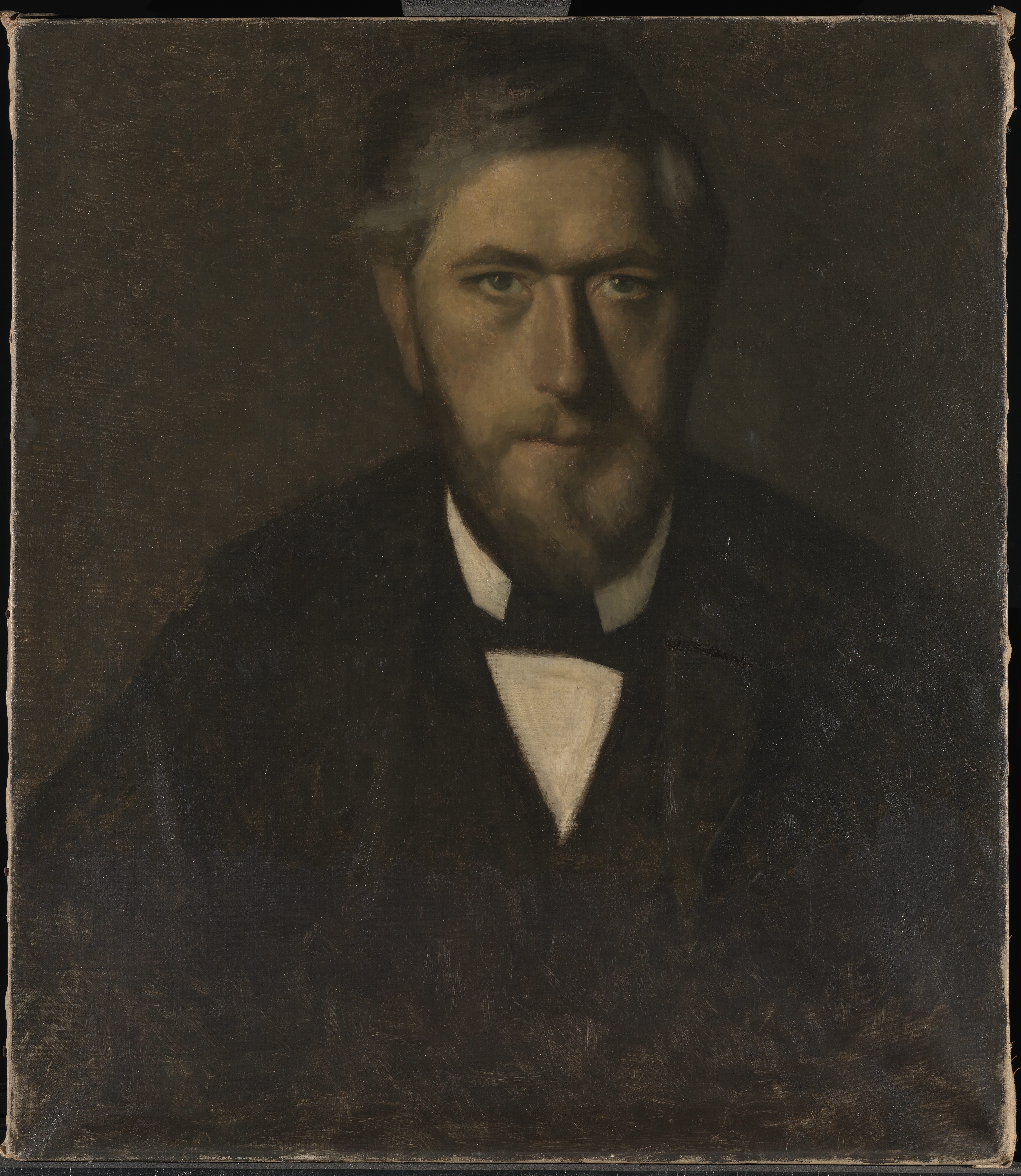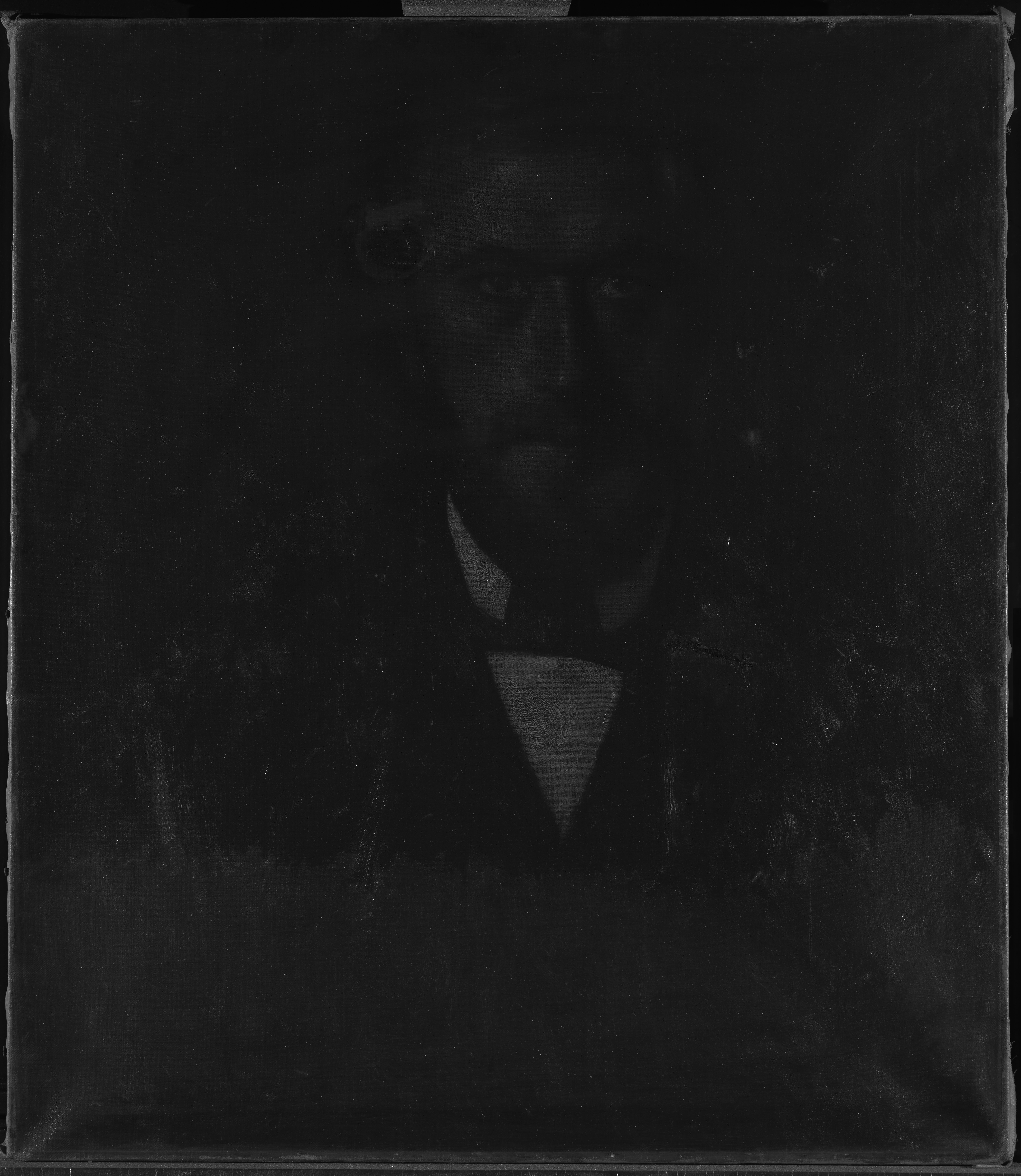 An inscription in black paint, in Willumsen's own hand, on the reverse of the canvas: "J.F. Willumsen malet af V. Hammershöj 1902" is at odds with the dating of the painting in the Bramsen (1918) p. 99 in which the date is a year earlier, i.e. the same as the “Fem portrætter”. J.F. Willumsen’s dating suggests that the portrait may be a repetition after the figure in the large group portrait, rather than a preliminary study. Maybe Willumsen himself requested a replica from Hammershøi? And furthermore Willumsen might have added paint himself at the bottom of the painting?
