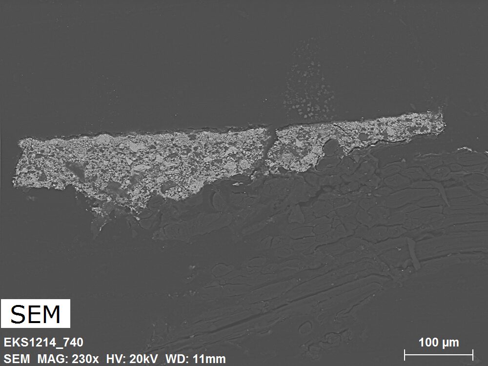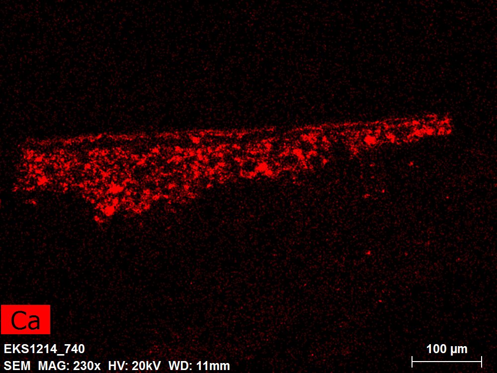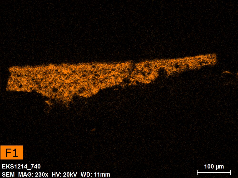 SEM-EDXS is a technique that provides highly detailed images at the microscopic level while simultaneously identifying the elemental composition of a sample. It is particularly valuable for studying the stratigraphy of paint cross sections at very fine scales, for the chemical characterisation of pigments, fillers and degradation products, and for detecting trace elements that may indicate very specific materials. Below, the elements listed in parentheses refer to minor elements whose relative abundance is below 10% of the total signal. The F1 map below represents the Pb M line. Read more under SEM-EDXS in the glossary.