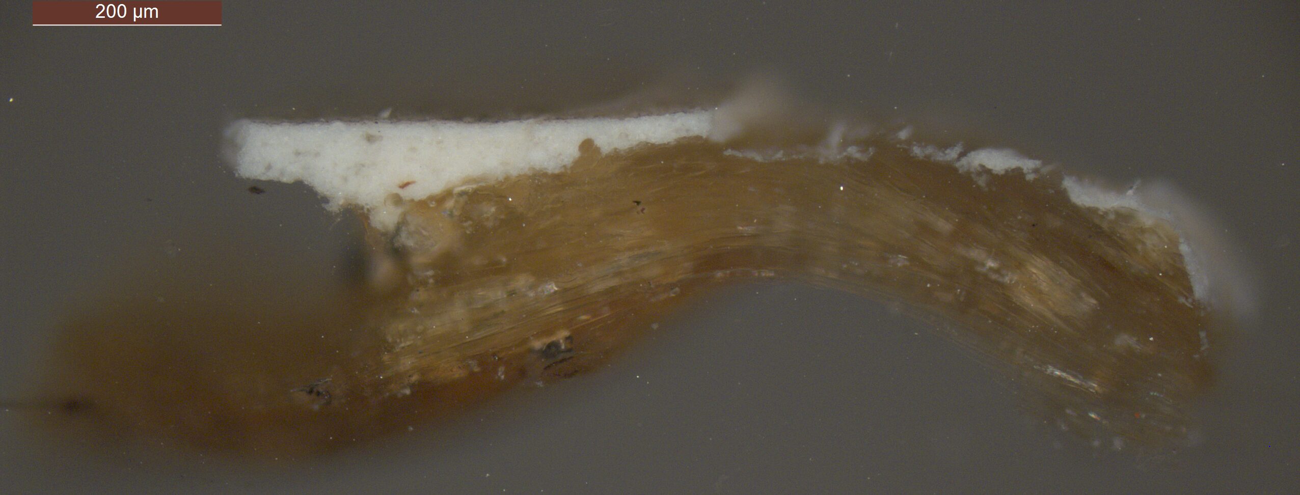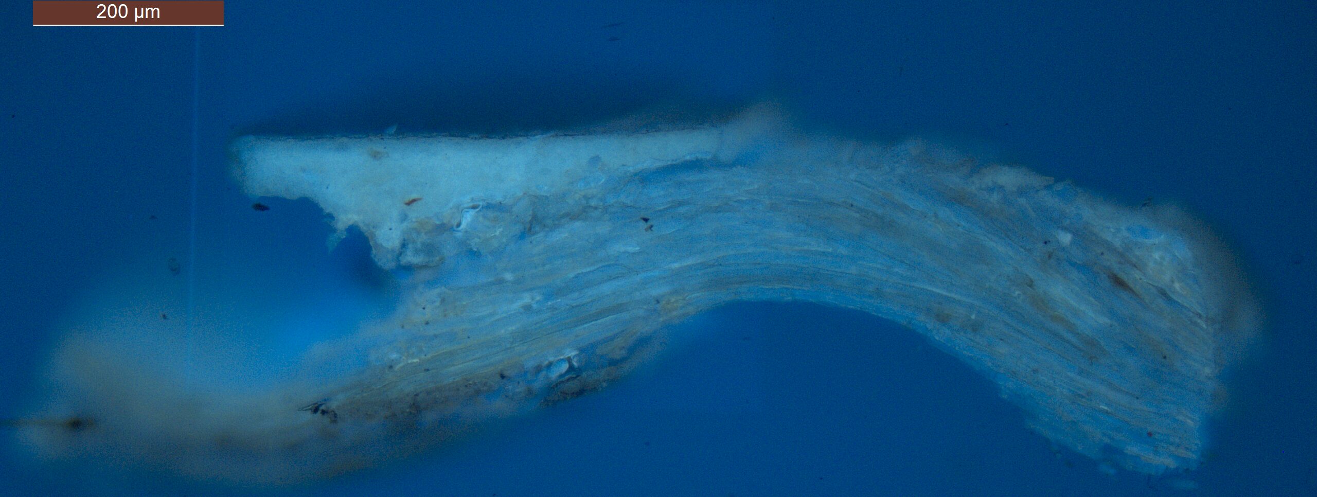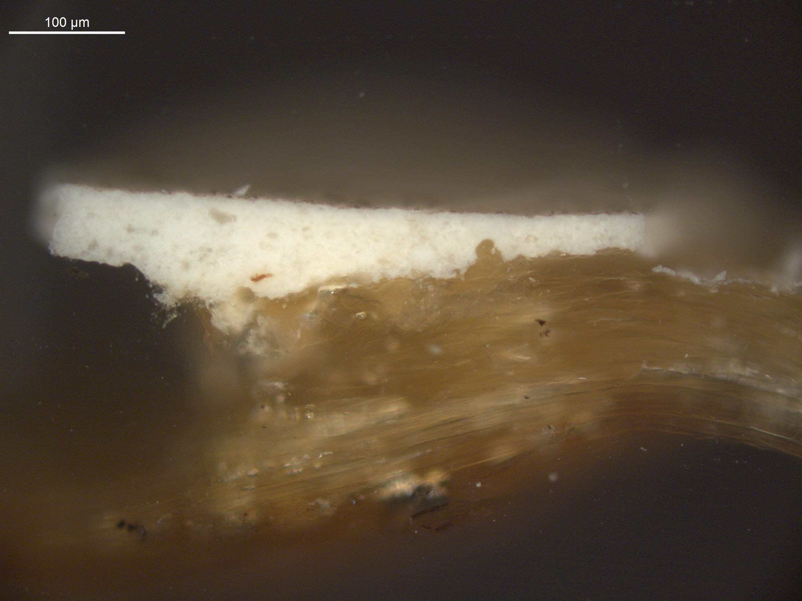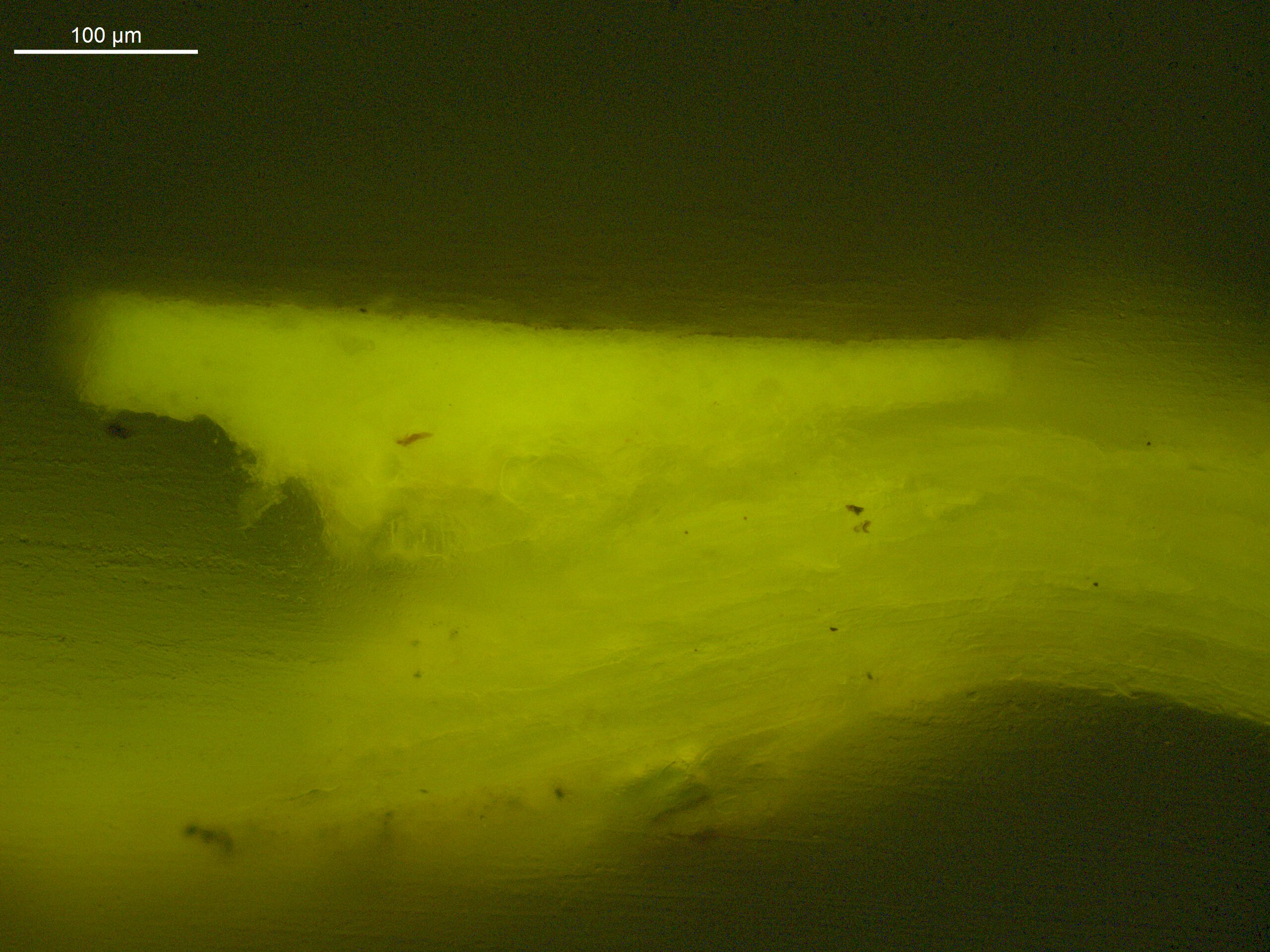 Optical microscopy uses visible light and lenses to magnify and examine the surface and structure of a painting. When applied to cross sections of paint samples, it allows for detailed observation of a painting’s stratigraphy (layer structure) and pigment particles. It is often employed with various illumination techniques, such as dark field and UV fluorescence, to enhance the analysis. Layer number 1 in the results section below the images refers to the layer at the bottom of the cross section.
