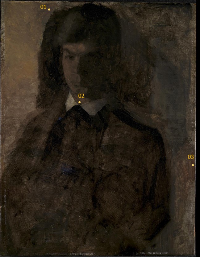 The ground layer is a preparatory layer applied directly to the support to create a smooth surface for painting. It is typically opaque and monochrome in color, providing a neutral base that influences the subsequent application of paint layers and the final appearance of the painting. The composition of the ground layer varies depending on the type of support and the historical period of the artwork. Hammershøi typically painted on white and industrially primed canvasses.