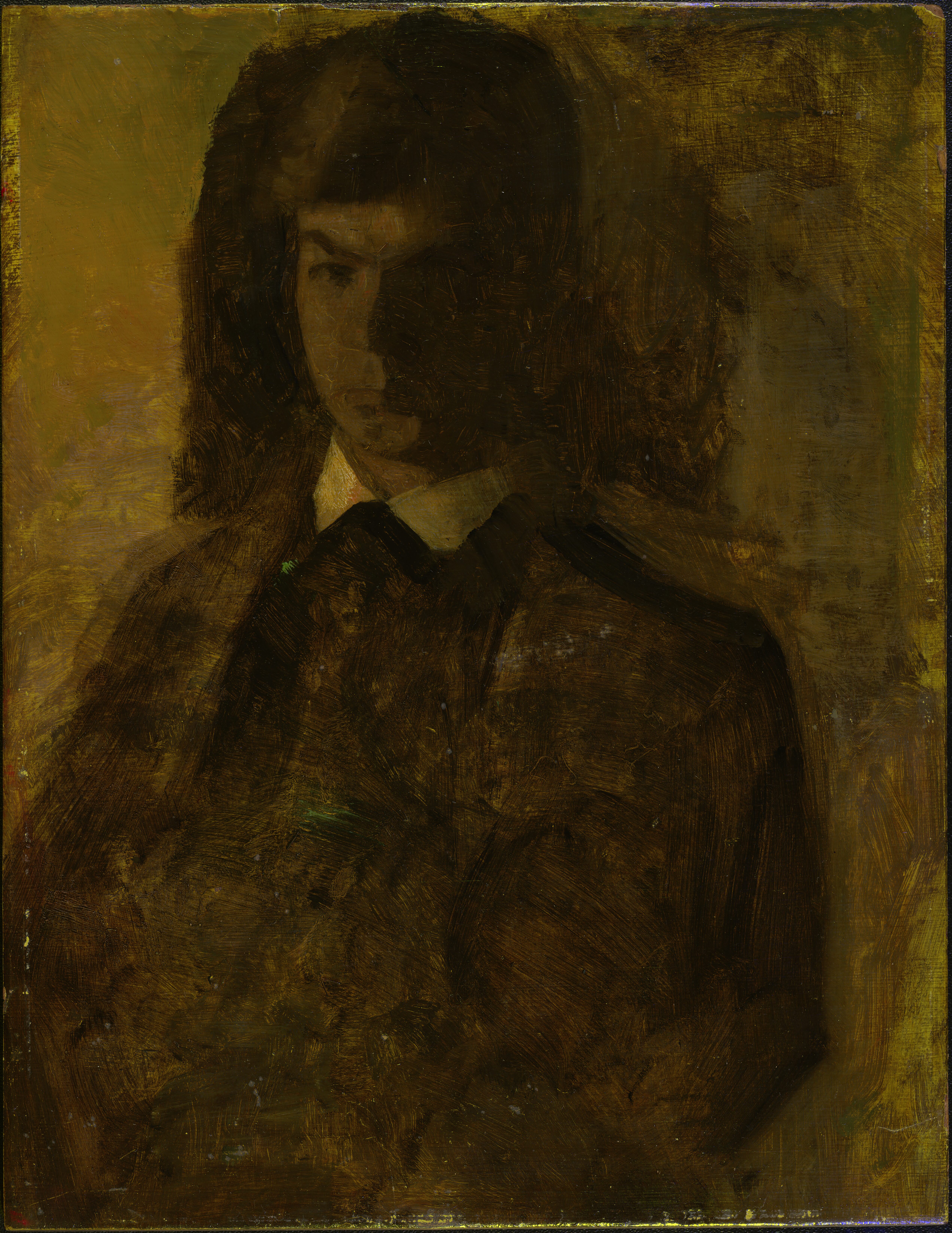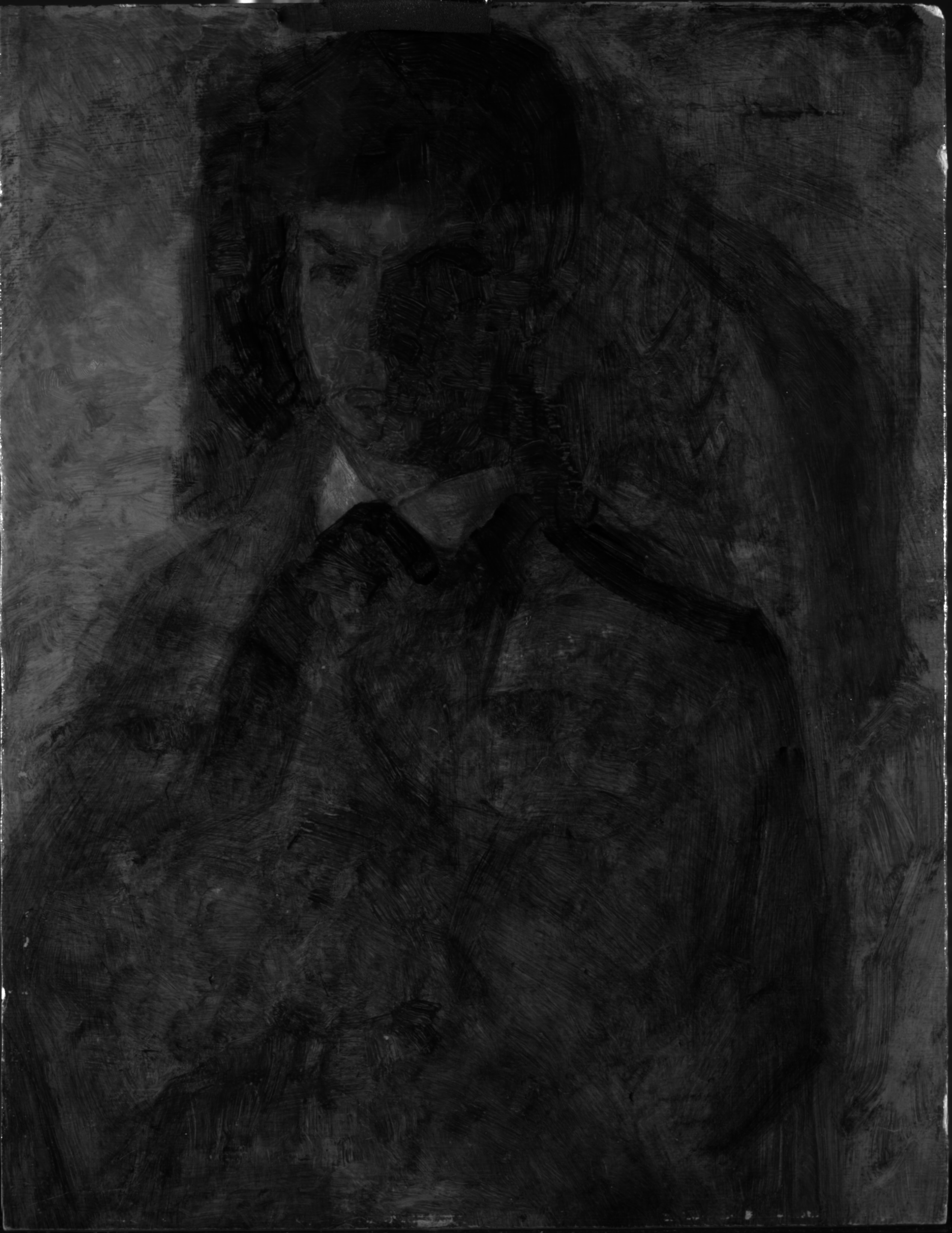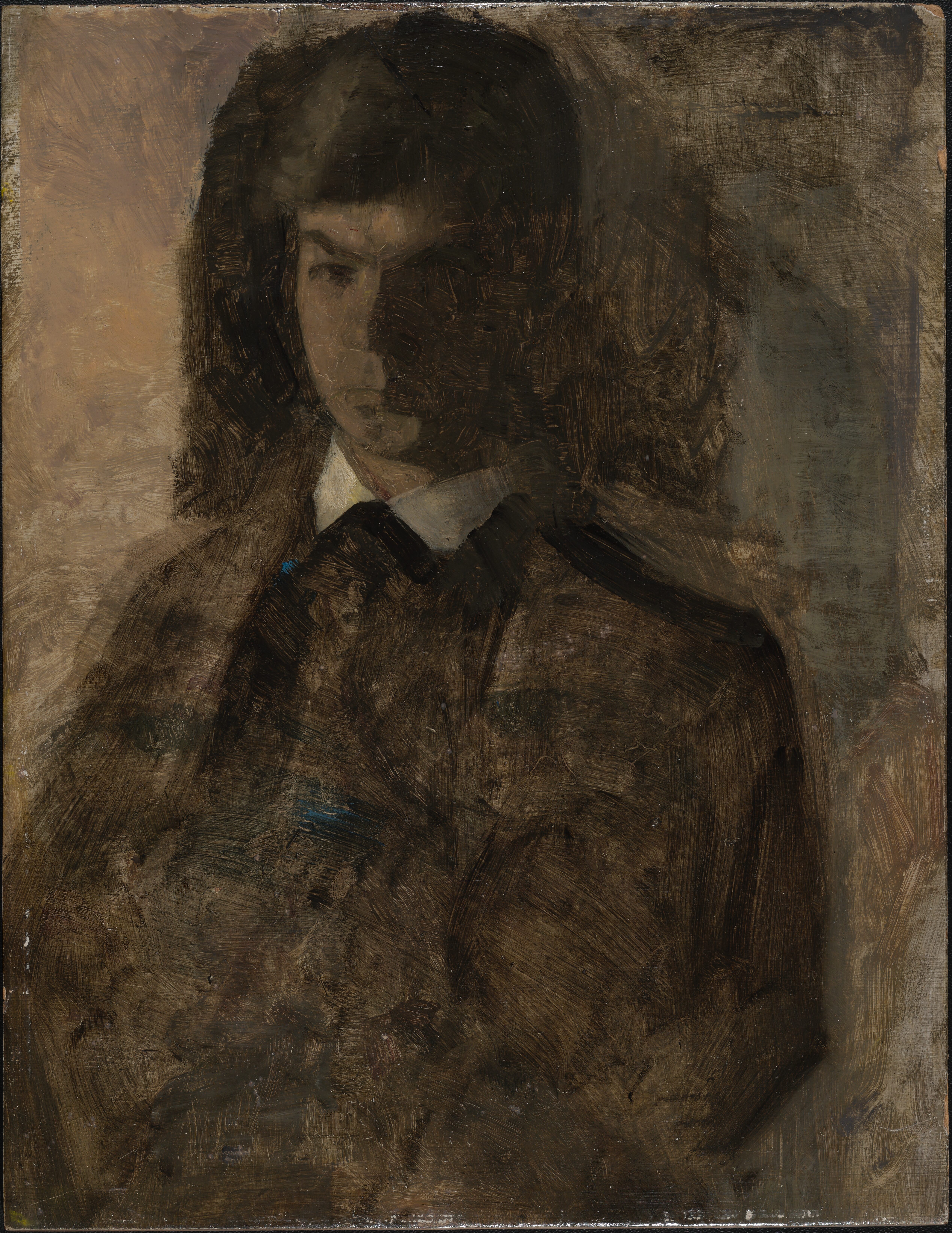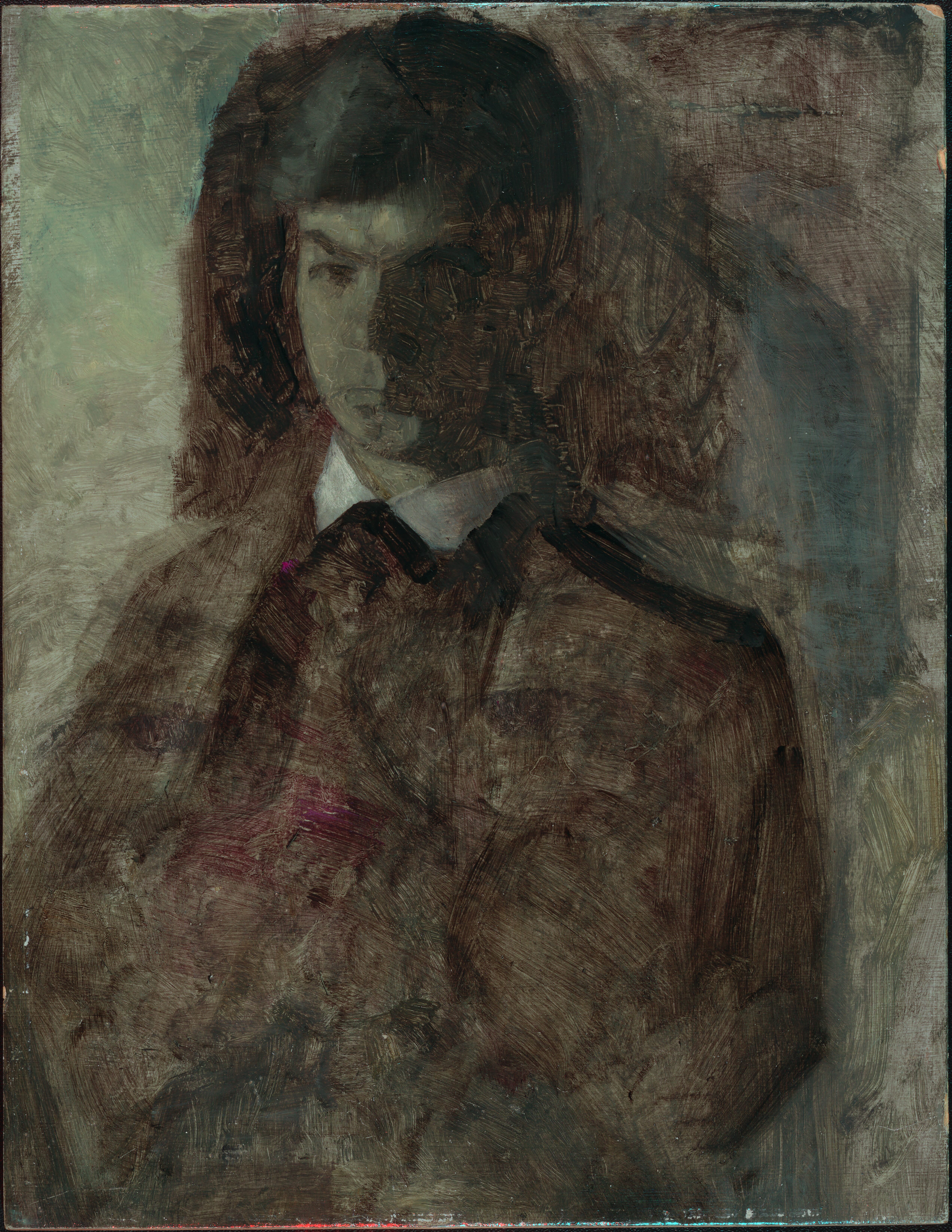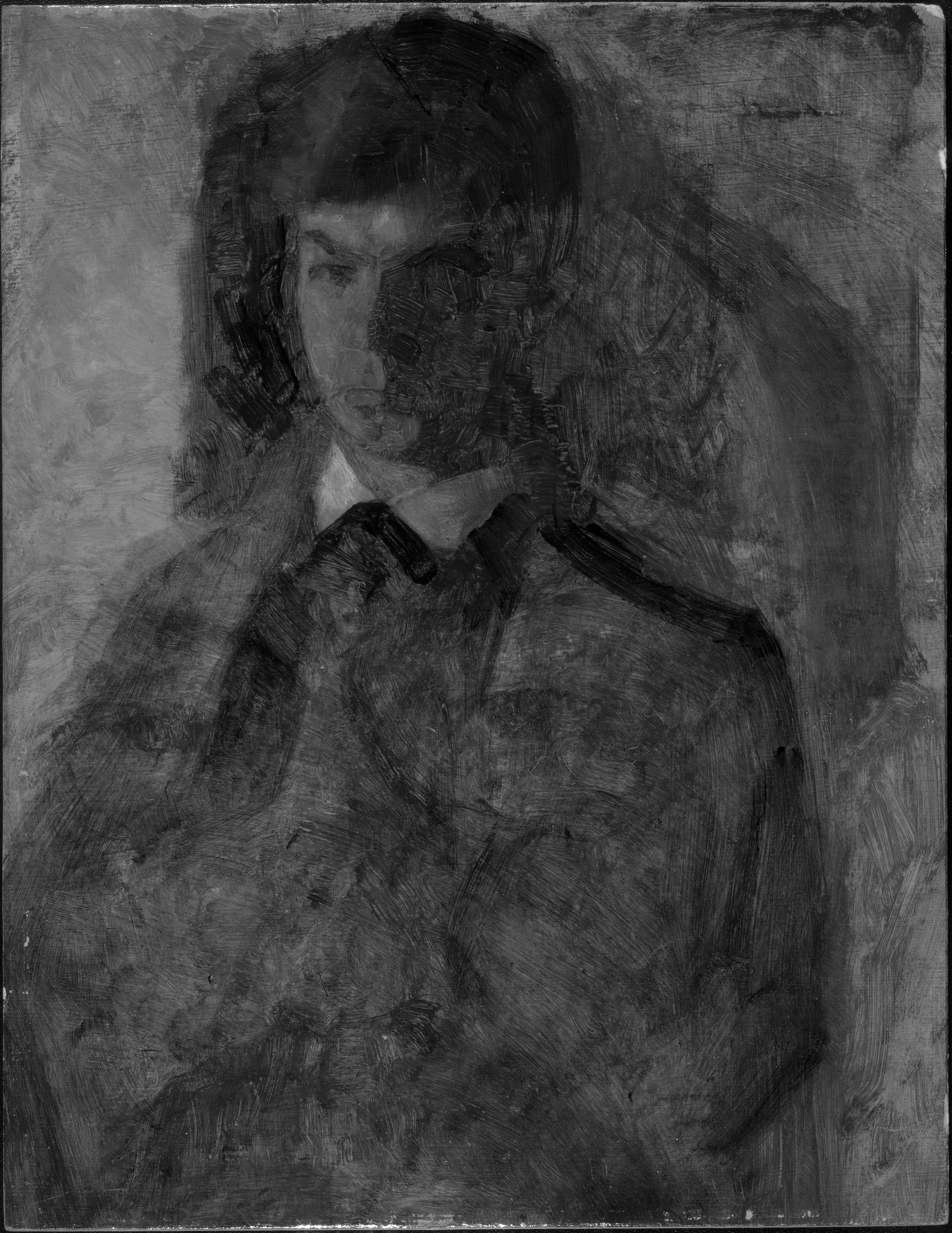 A thinly painted sketch on a board lined with a primed thin fabric. Portrait of Svend Hammershøi.
