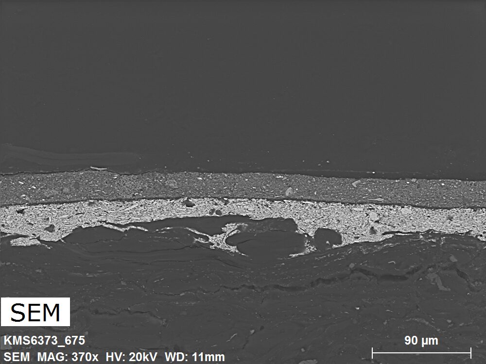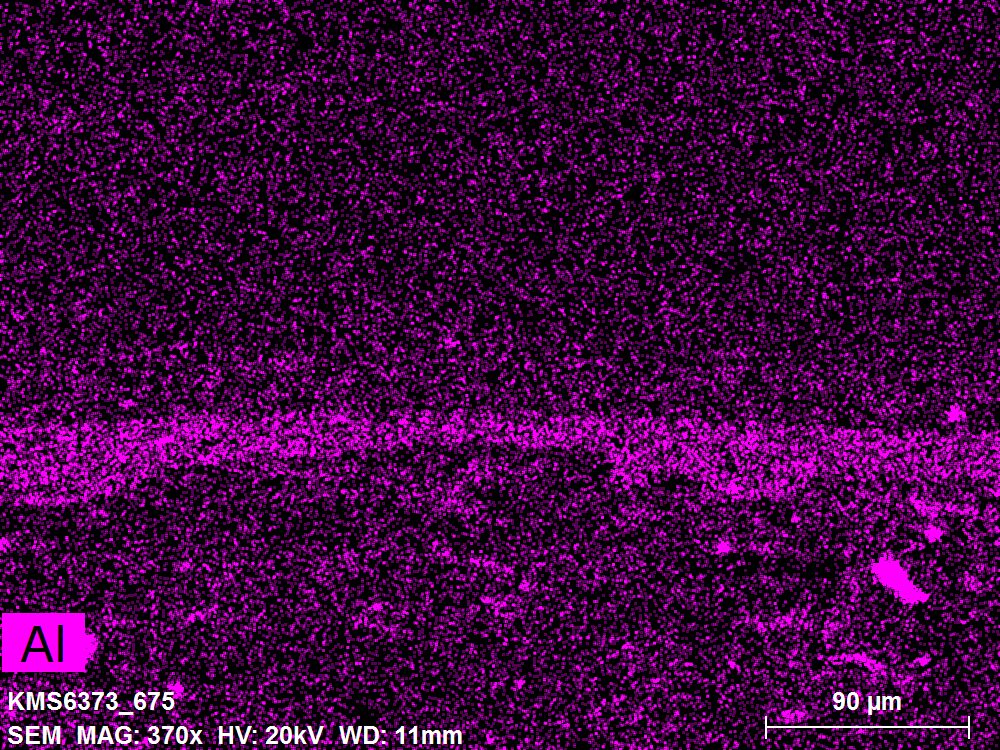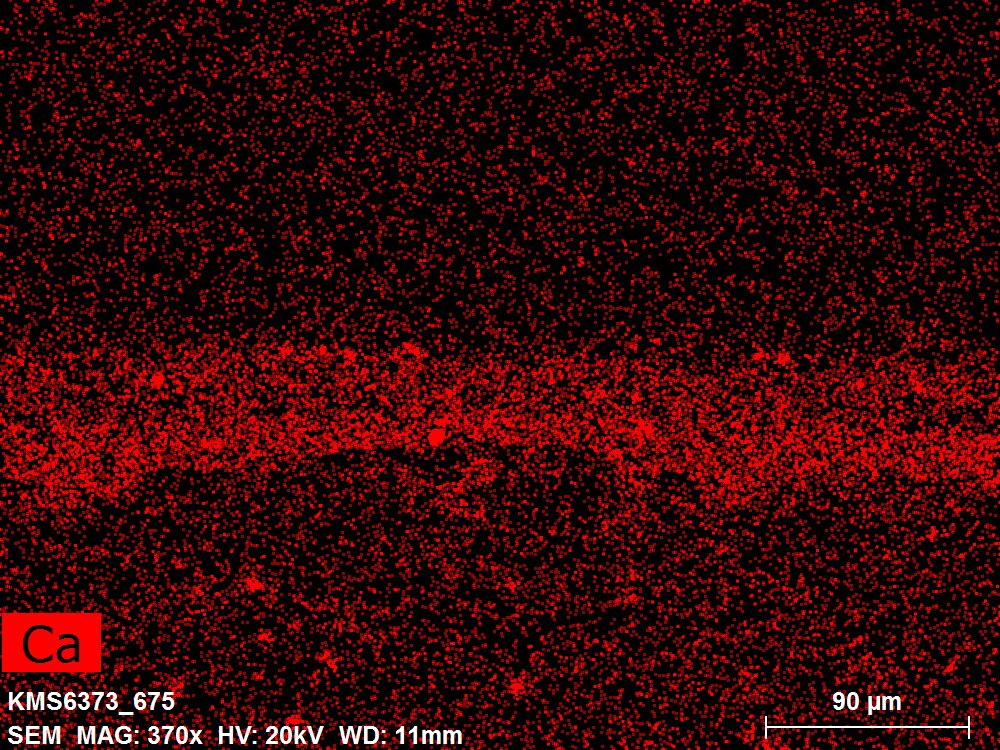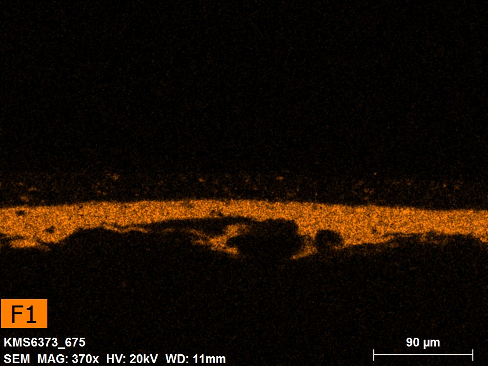 SEM-EDXS is a technique that provides highly detailed images at the microscopic level while simultaneously identifying the elemental composition of a sample. It is particularly valuable for studying the stratigraphy of paint cross sections at very fine scales, for the chemical characterisation of pigments, fillers and degradation products, and for detecting trace elements that may indicate very specific materials. Below, the elements listed in parentheses refer to minor elements whose relative abundance is below 10% of the total signal. The F1 map below represents the Pb M line. Read more under SEM-EDXS in the glossary.