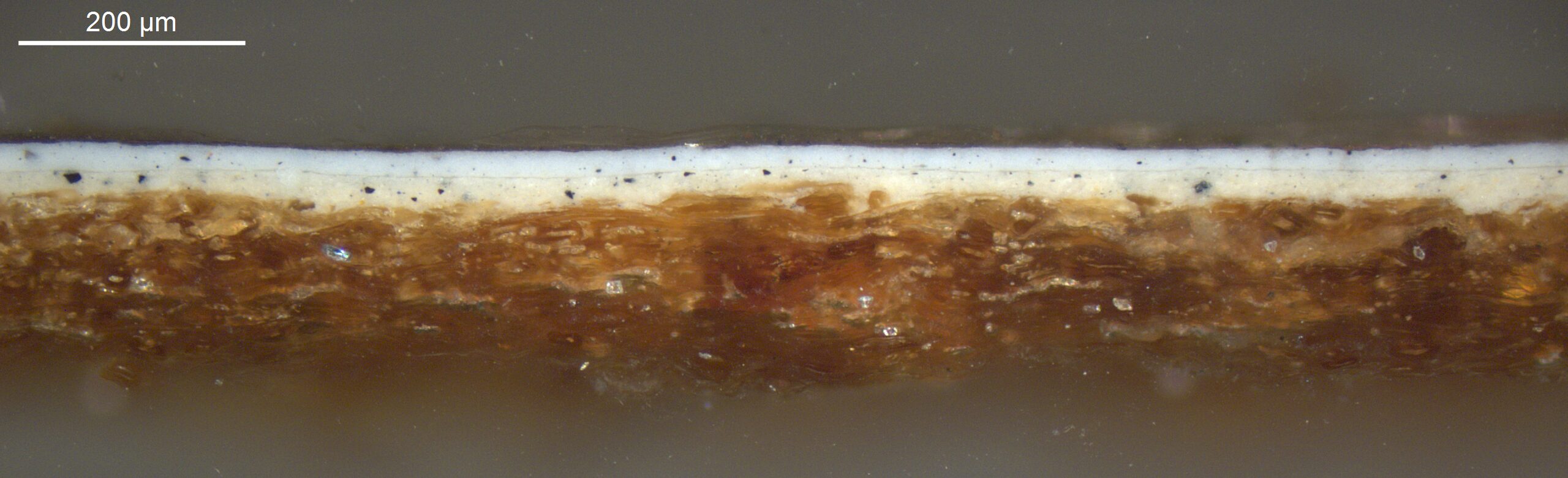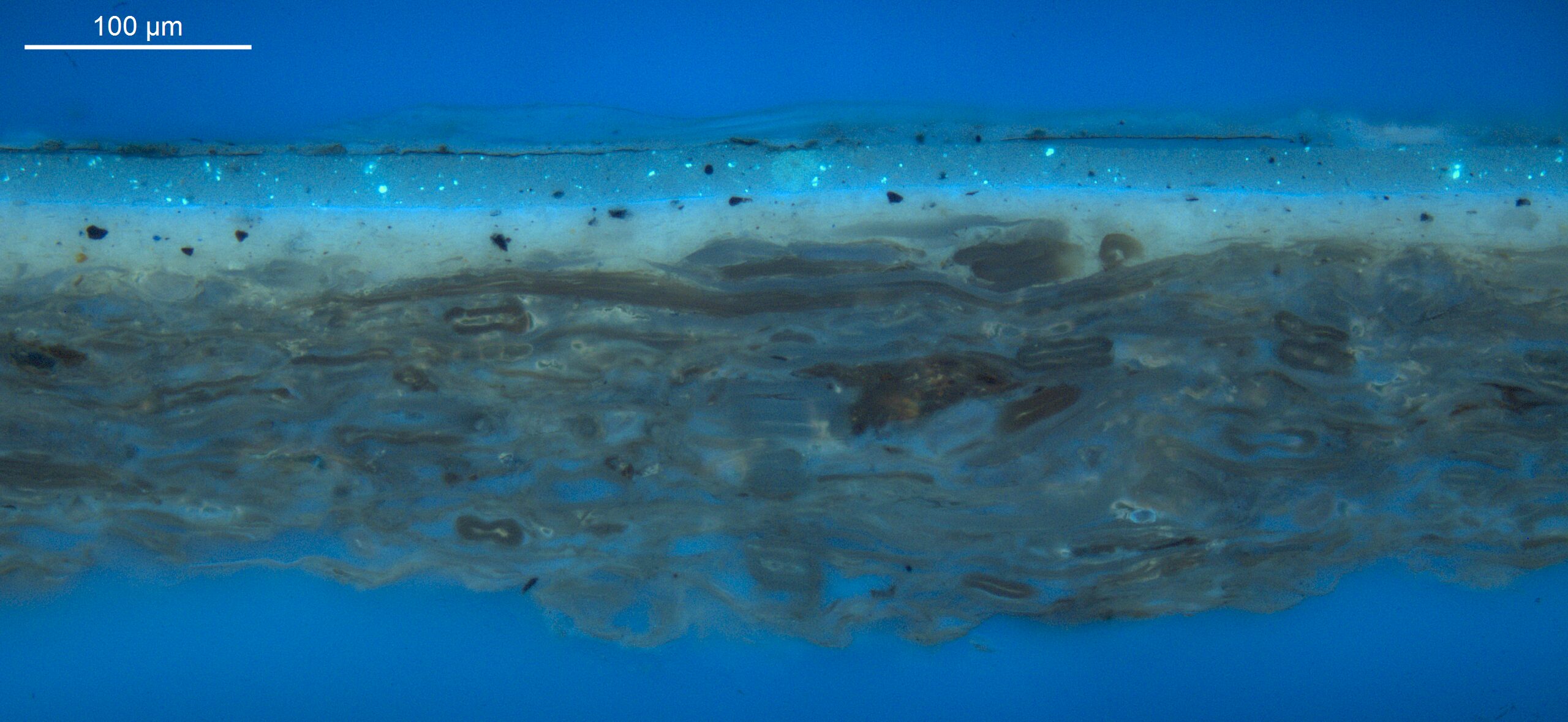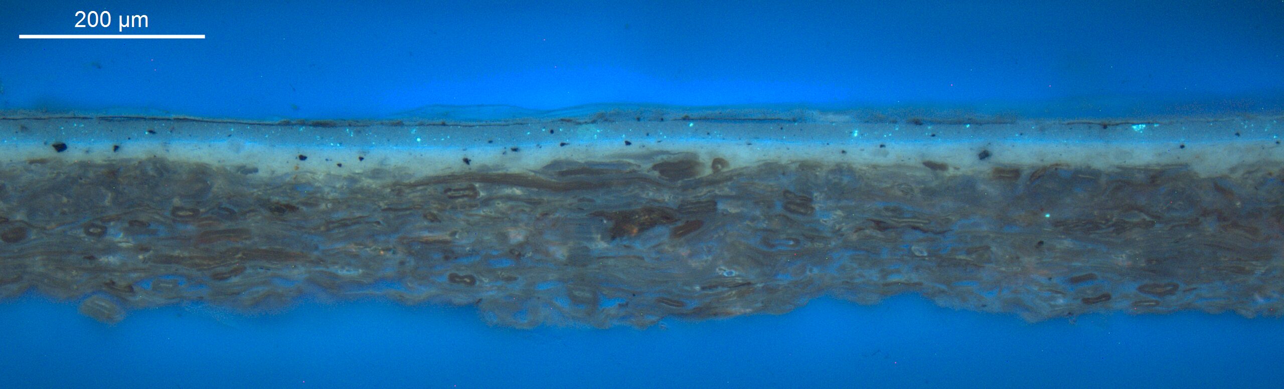 Optical microscopy uses visible light and lenses to magnify and examine the surface and structure of a painting. When applied to cross sections of paint samples, it allows for detailed observation of a painting’s stratigraphy (layer structure) and pigment particles. It is often employed with various illumination techniques, such as dark field and UV fluorescence, to enhance the analysis. Layer number 1 in the results section below the images refers to the layer at the bottom of the cross section.
