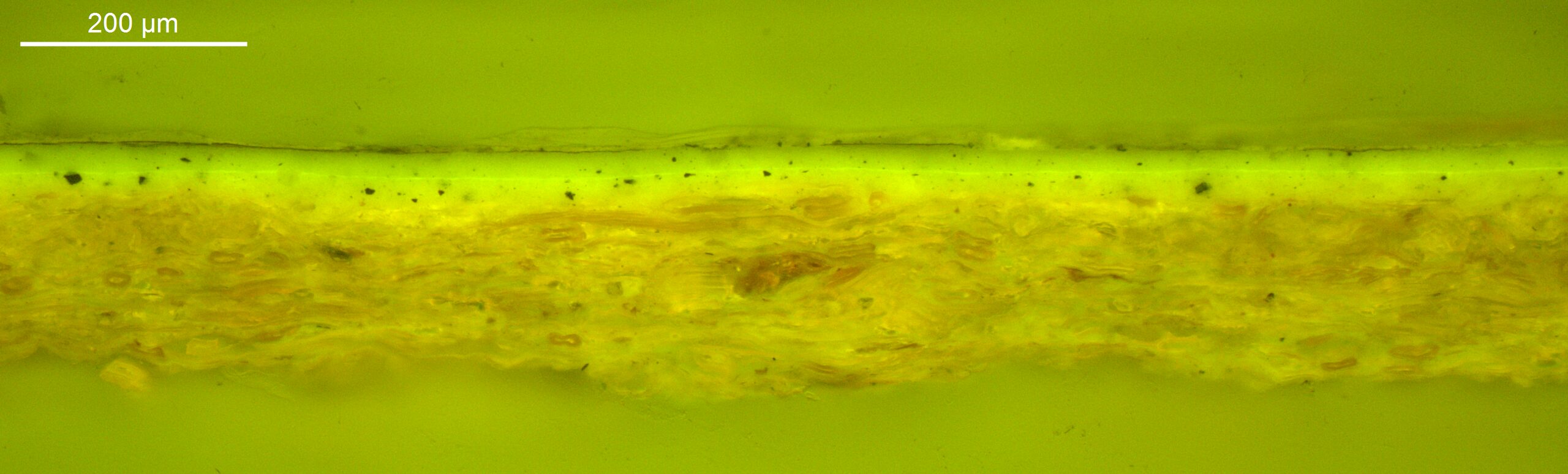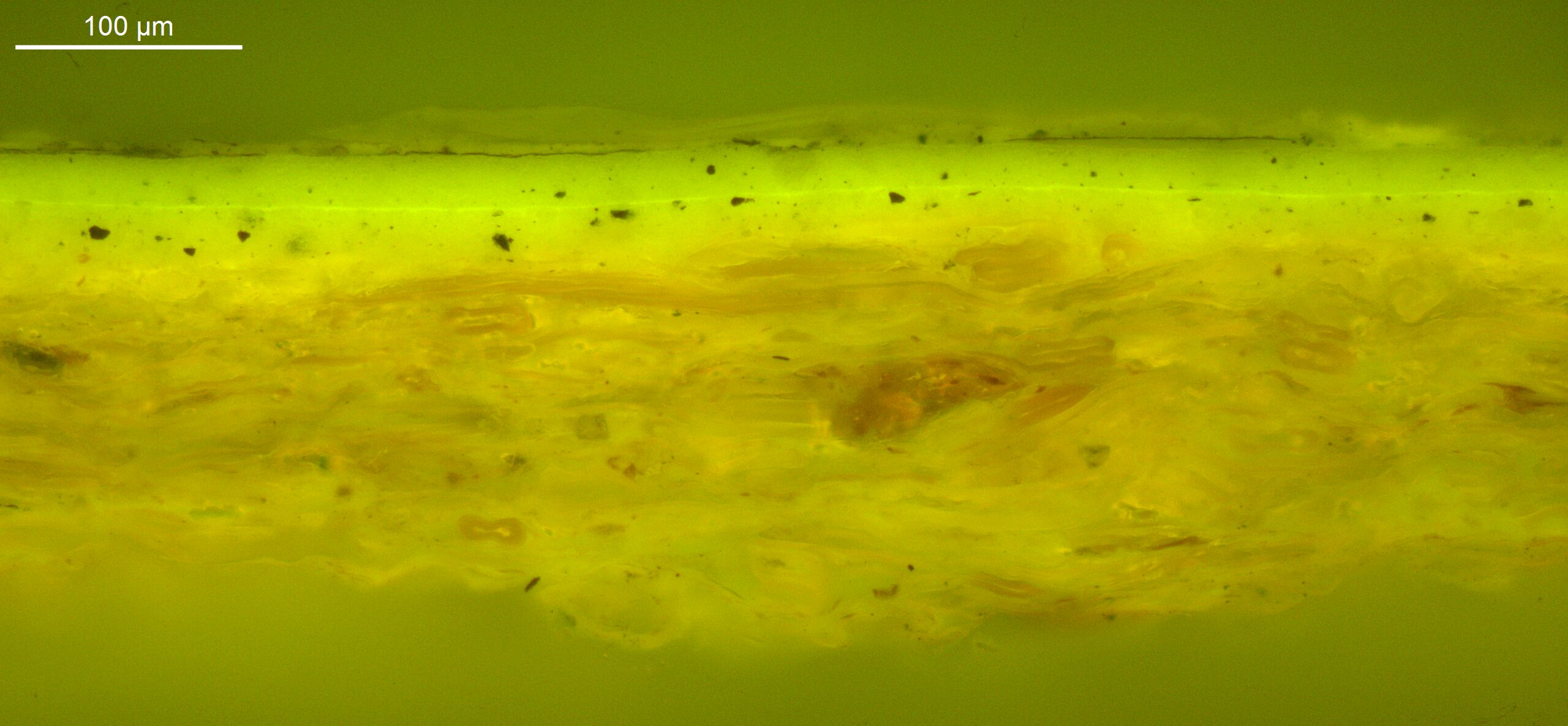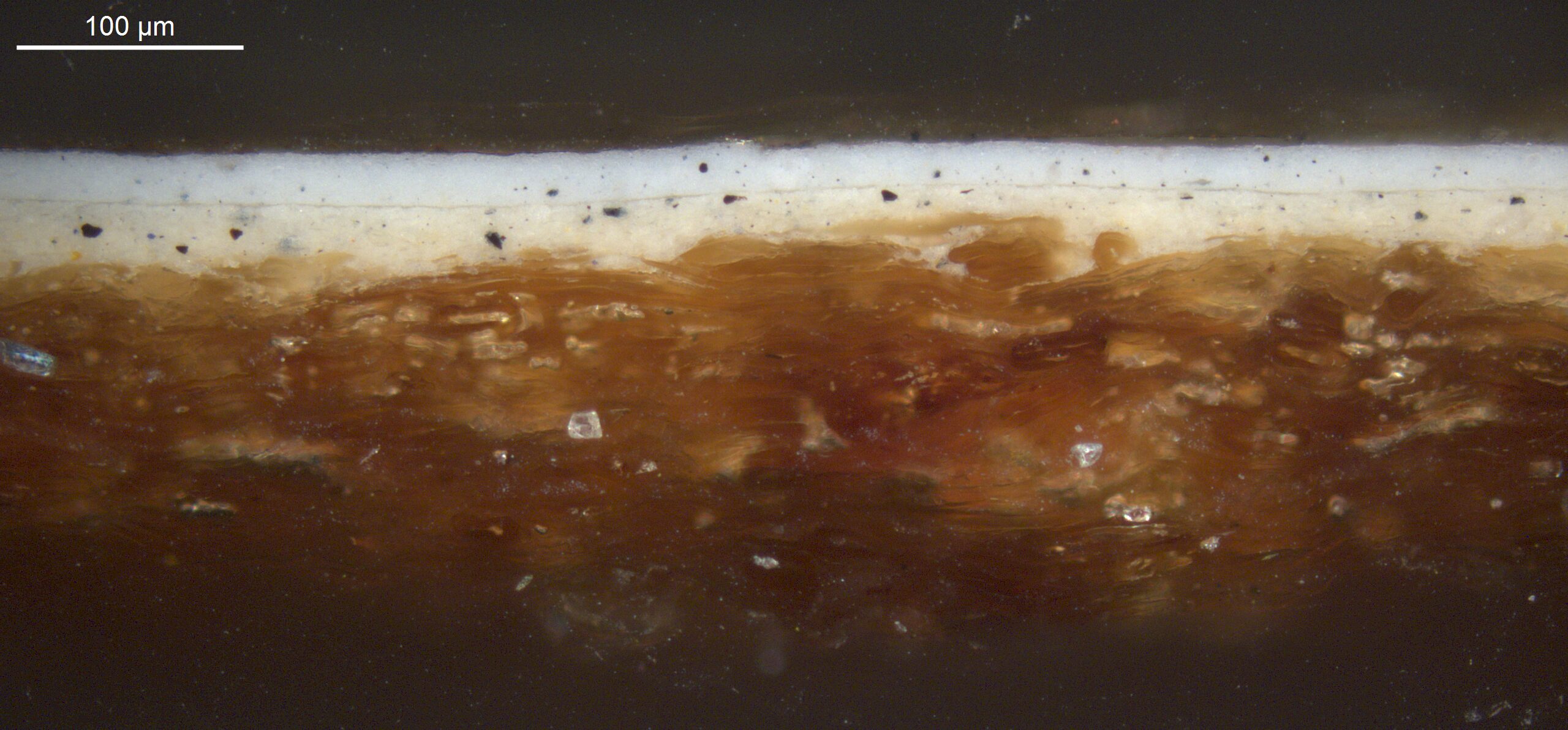 Optical microscopy uses visible light and lenses to magnify and examine the surface and structure of a painting. When applied to cross sections of paint samples, it allows for detailed observation of a painting’s stratigraphy (layer structure) and pigment particles. It is often employed with various illumination techniques, such as dark field and UV fluorescence, to enhance the analysis. Layer number 1 in the results section below the images refers to the layer at the bottom of the cross section.