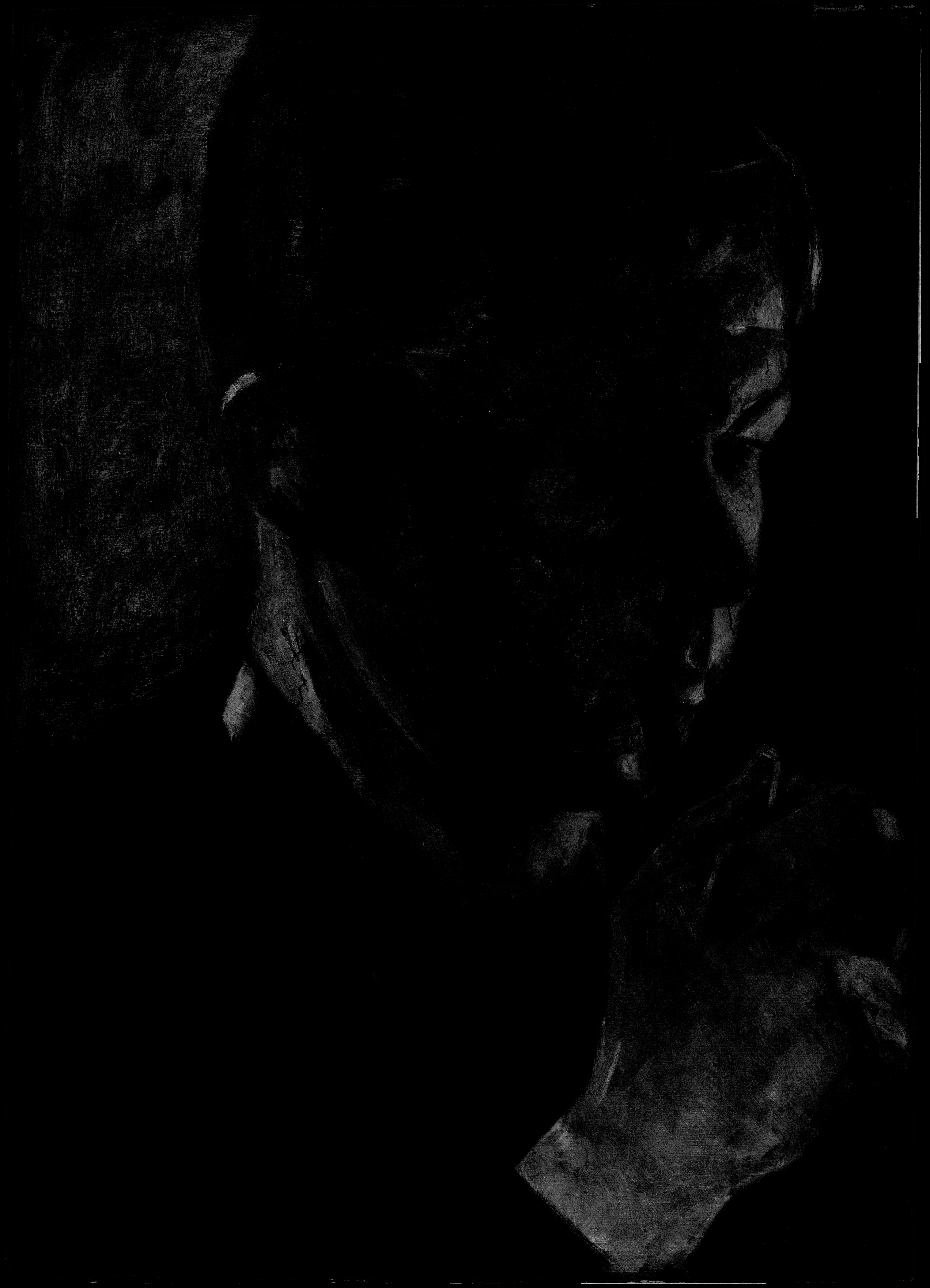 The paint was applied modelling the figure predominantly from dark to light. The top paint layer is thin and semi-covering, leaving the darker paint and – in places the ground underneath - discernible in, and between the brush strokes.