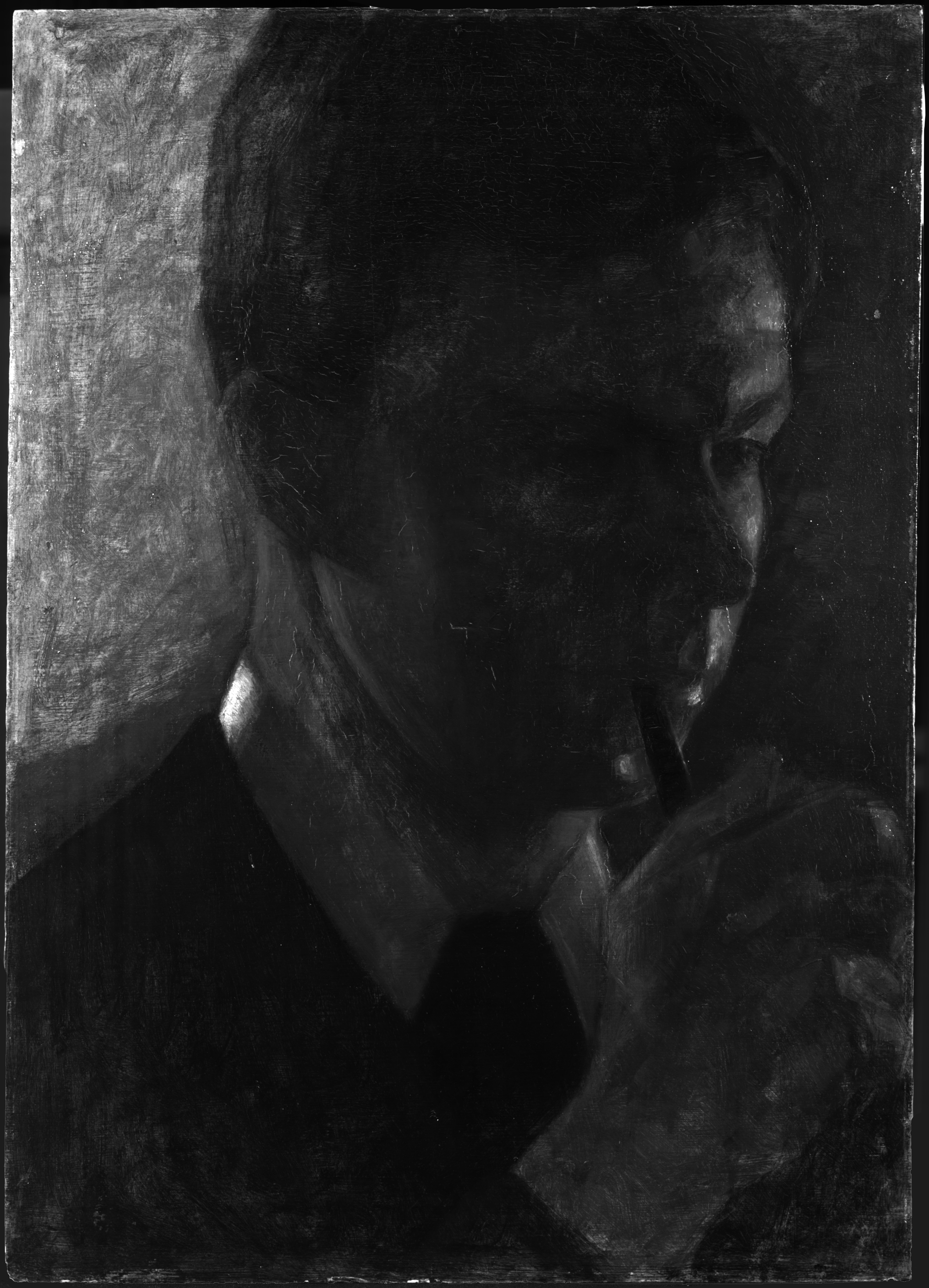 (Transl.): PORTRAIT. .Svend Hammershøi. Head and shoulders portrait with a hand. Life-size. Preliminary study for “Five Portraits” No. 216. He is smoking a pipe, held in the hollow of his hand.