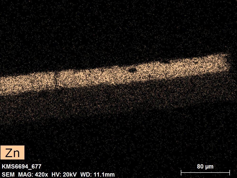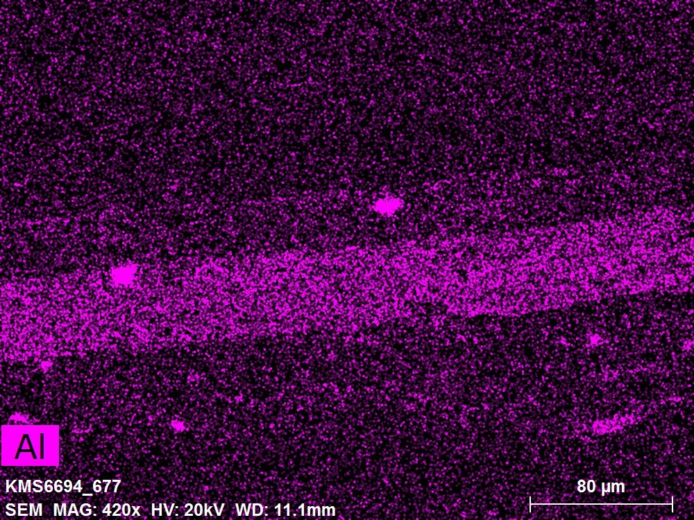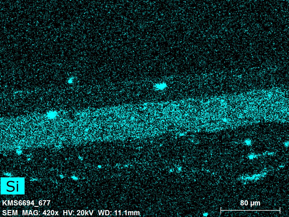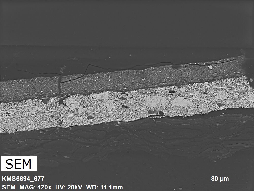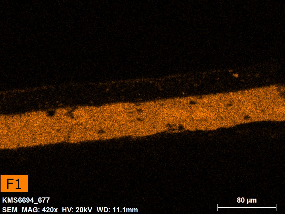 SEM-EDXS is a technique that provides highly detailed images at the microscopic level while simultaneously identifying the elemental composition of a sample. It is particularly valuable for studying the stratigraphy of paint cross sections at very fine scales, for the chemical characterisation of pigments, fillers and degradation products, and for detecting trace elements that may indicate very specific materials. Below, the elements listed in parentheses refer to minor elements whose relative abundance is below 10% of the total signal. The F1 map below represents the Pb M line. Read more under SEM-EDXS in the glossary.