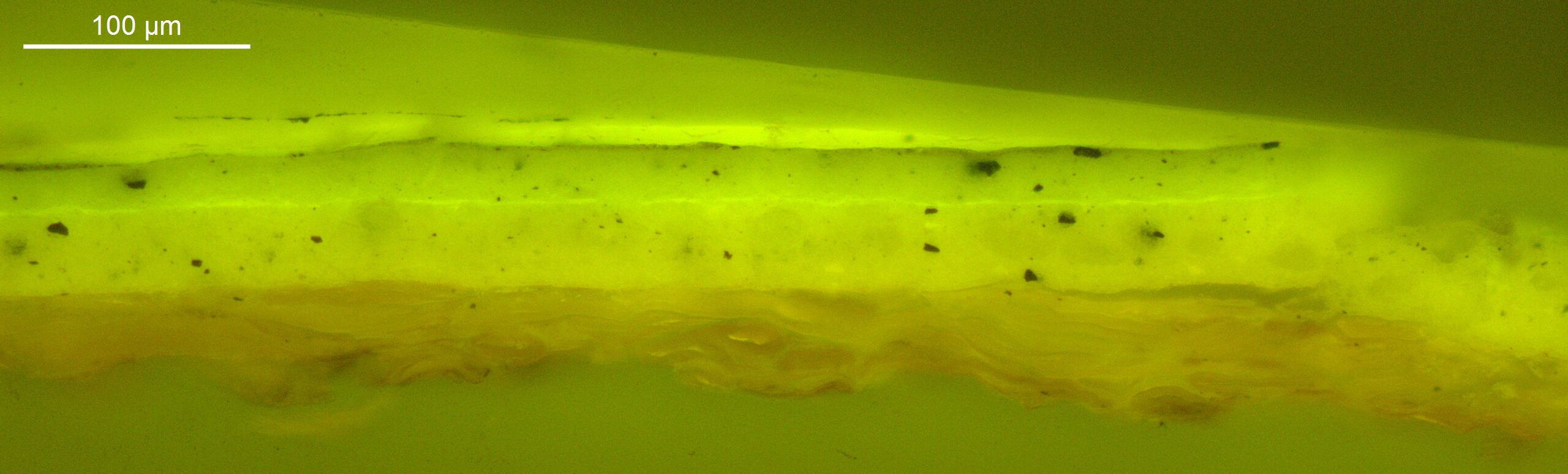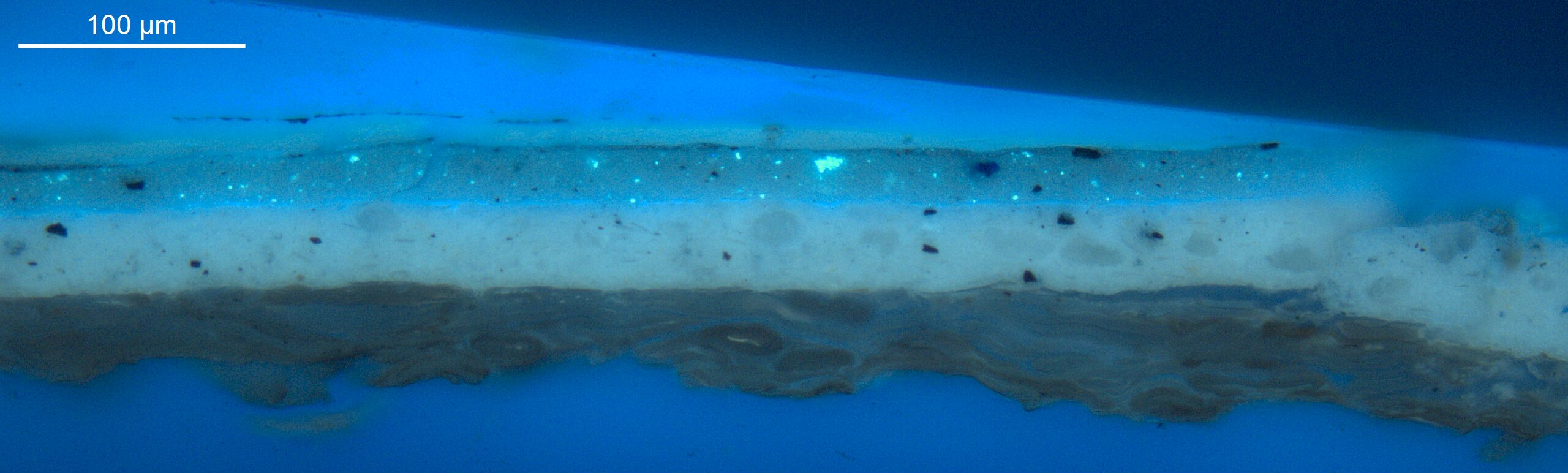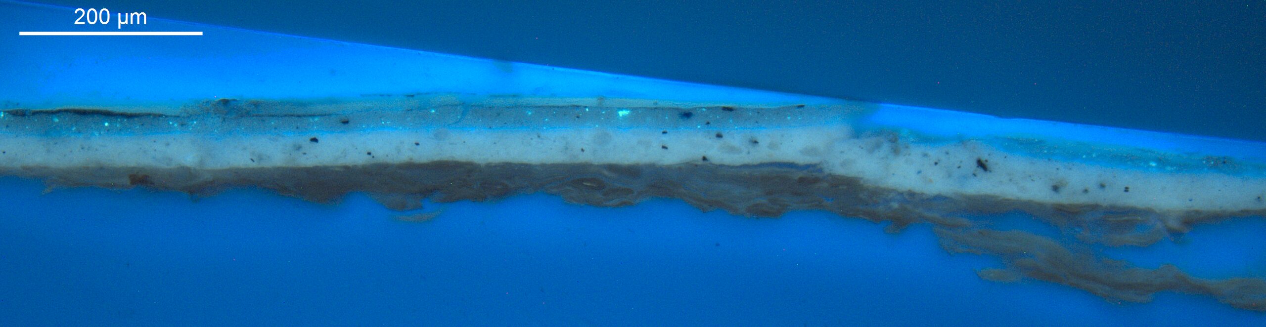 Optical microscopy uses visible light and lenses to magnify and examine the surface and structure of a painting. When applied to cross sections of paint samples, it allows for detailed observation of a painting’s stratigraphy (layer structure) and pigment particles. It is often employed with various illumination techniques, such as dark field and UV fluorescence, to enhance the analysis. Layer number 1 in the results section below the images refers to the layer at the bottom of the cross section.