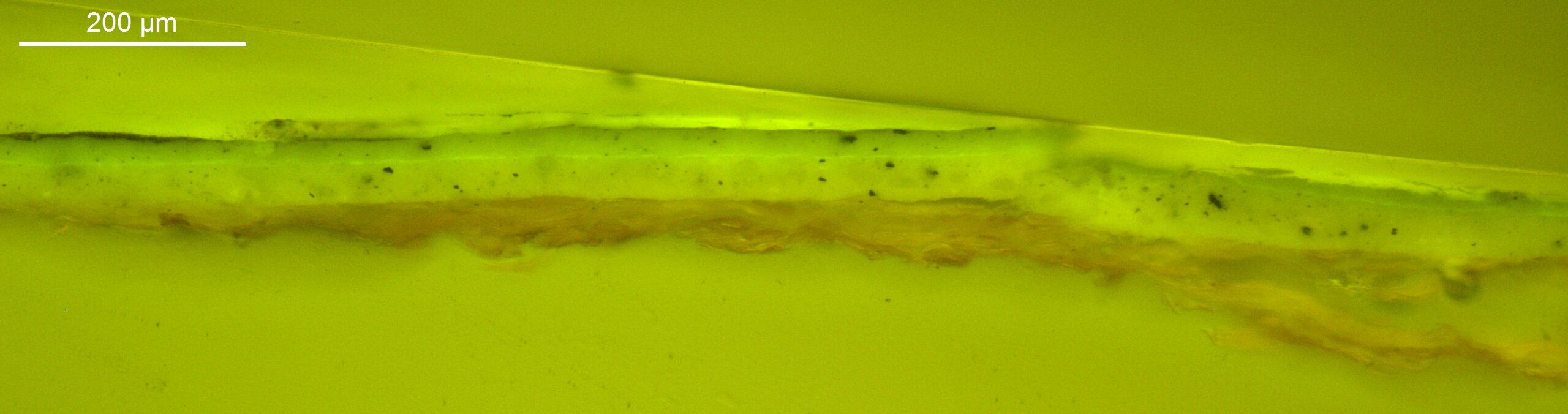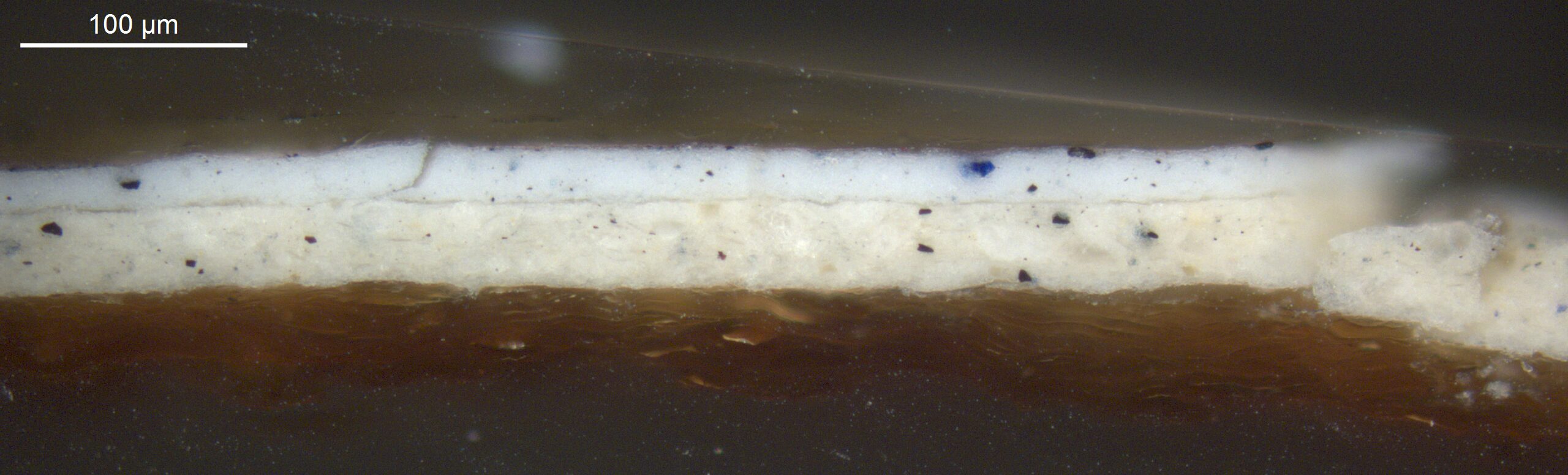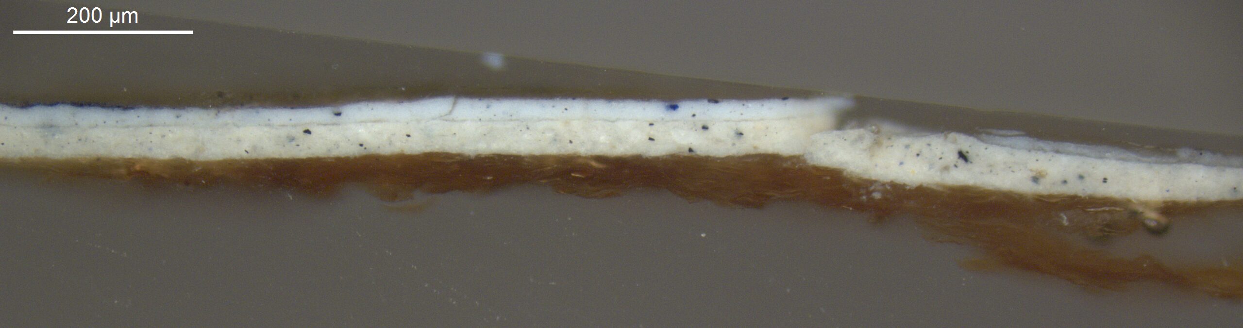 Optical microscopy uses visible light and lenses to magnify and examine the surface and structure of a painting. When applied to cross sections of paint samples, it allows for detailed observation of a painting’s stratigraphy (layer structure) and pigment particles. It is often employed with various illumination techniques, such as dark field and UV fluorescence, to enhance the analysis. Layer number 1 in the results section below the images refers to the layer at the bottom of the cross section.