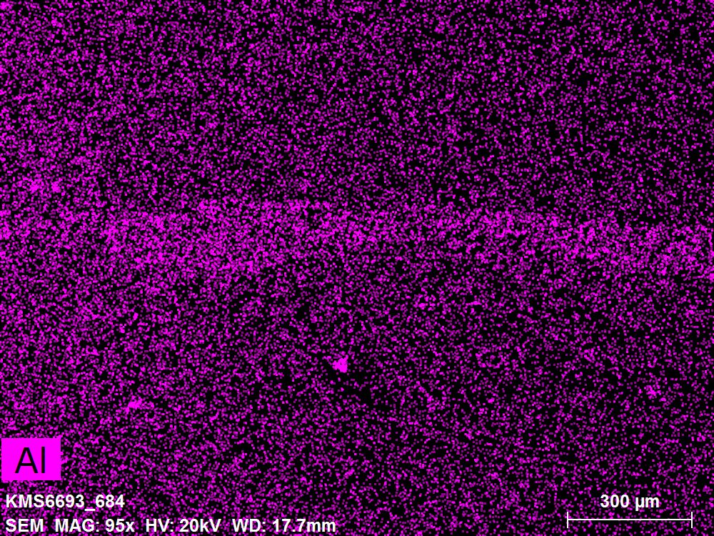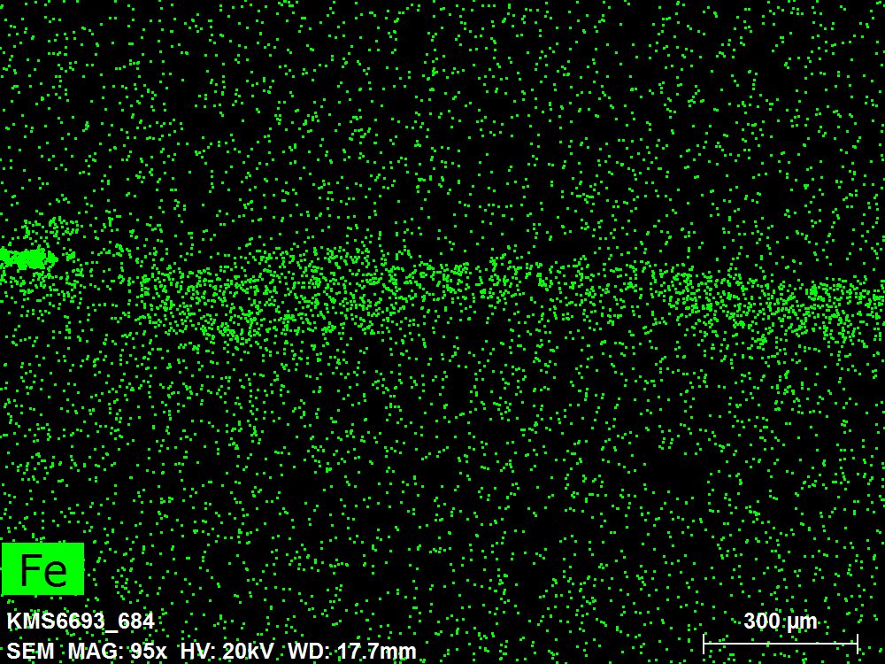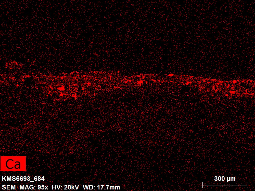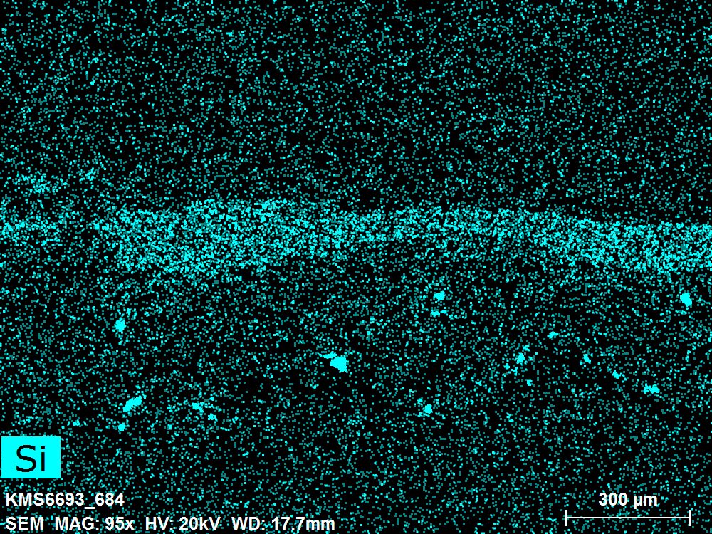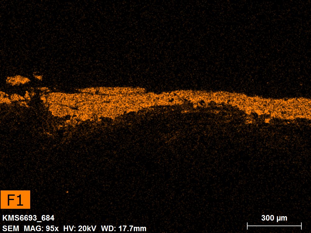 SEM-EDXS is a technique that provides highly detailed images at the microscopic level while simultaneously identifying the elemental composition of a sample. It is particularly valuable for studying the stratigraphy of paint cross sections at very fine scales, for the chemical characterisation of pigments, fillers and degradation products, and for detecting trace elements that may indicate very specific materials. Below, the elements listed in parentheses refer to minor elements whose relative abundance is below 10% of the total signal. The F1 map below represents the Pb M line. Read more under SEM-EDXS in the glossary.