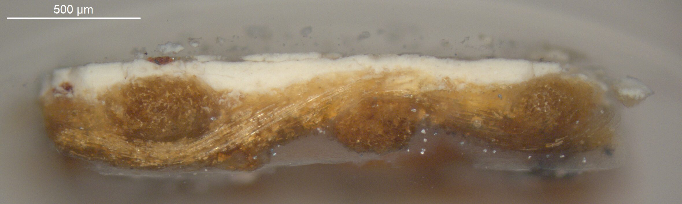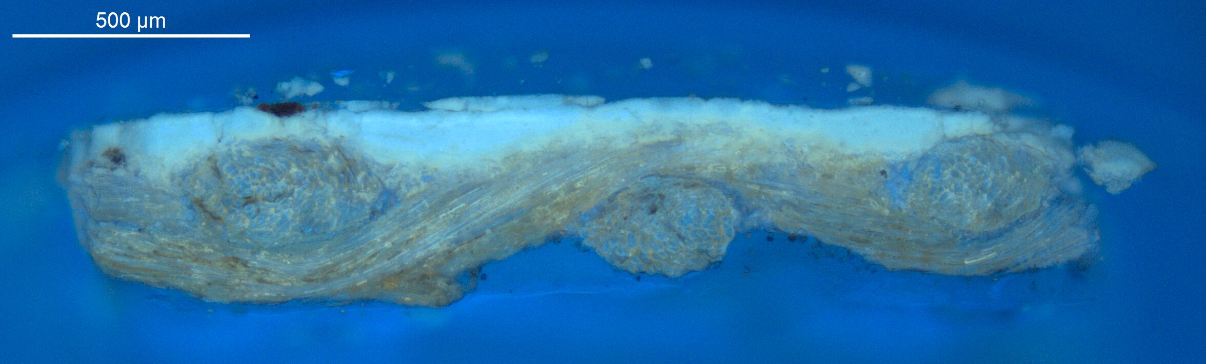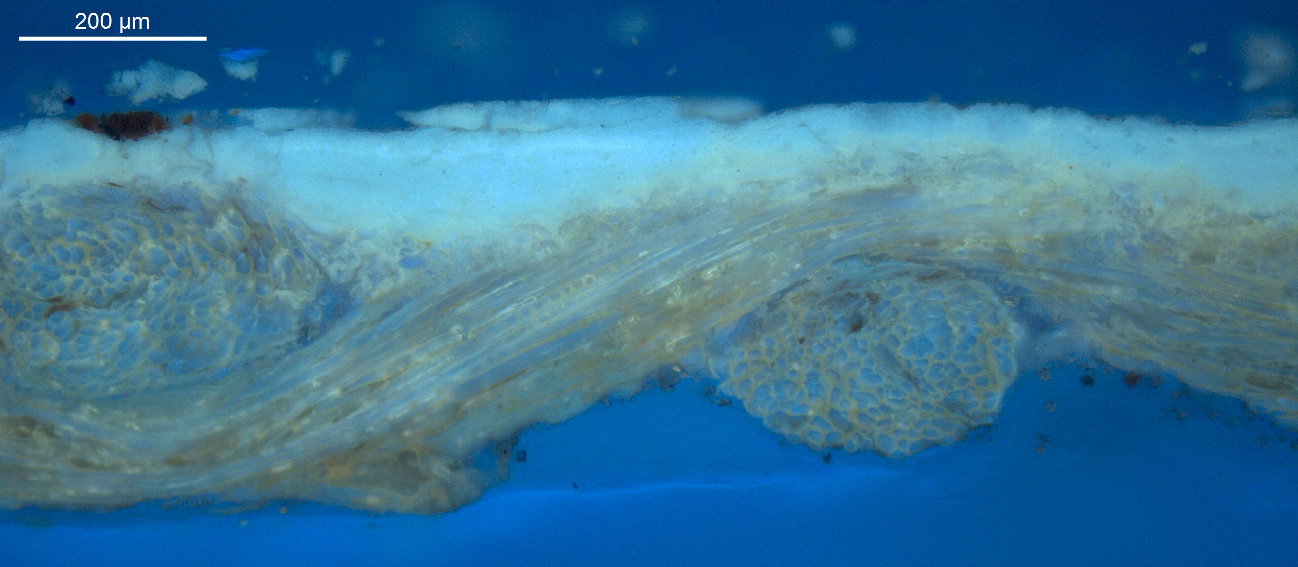 Optical microscopy uses visible light and lenses to magnify and examine the surface and structure of a painting. When applied to cross sections of paint samples, it allows for detailed observation of a painting’s stratigraphy (layer structure) and pigment particles. It is often employed with various illumination techniques, such as dark field and UV fluorescence, to enhance the analysis. Layer number 1 in the results section below the images refers to the layer at the bottom of the cross section.