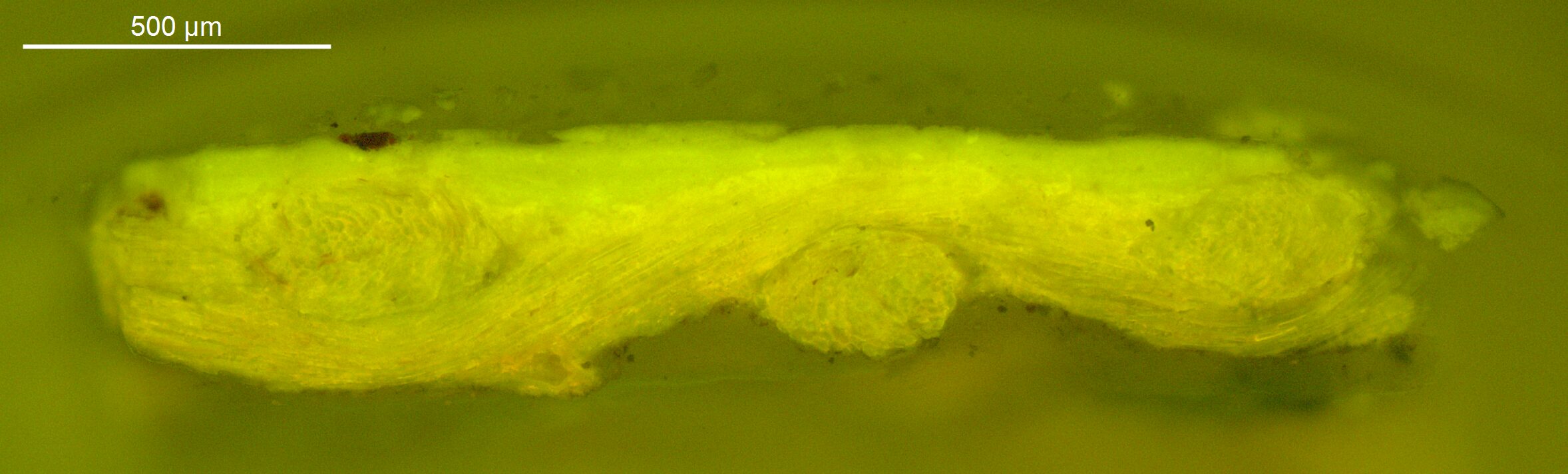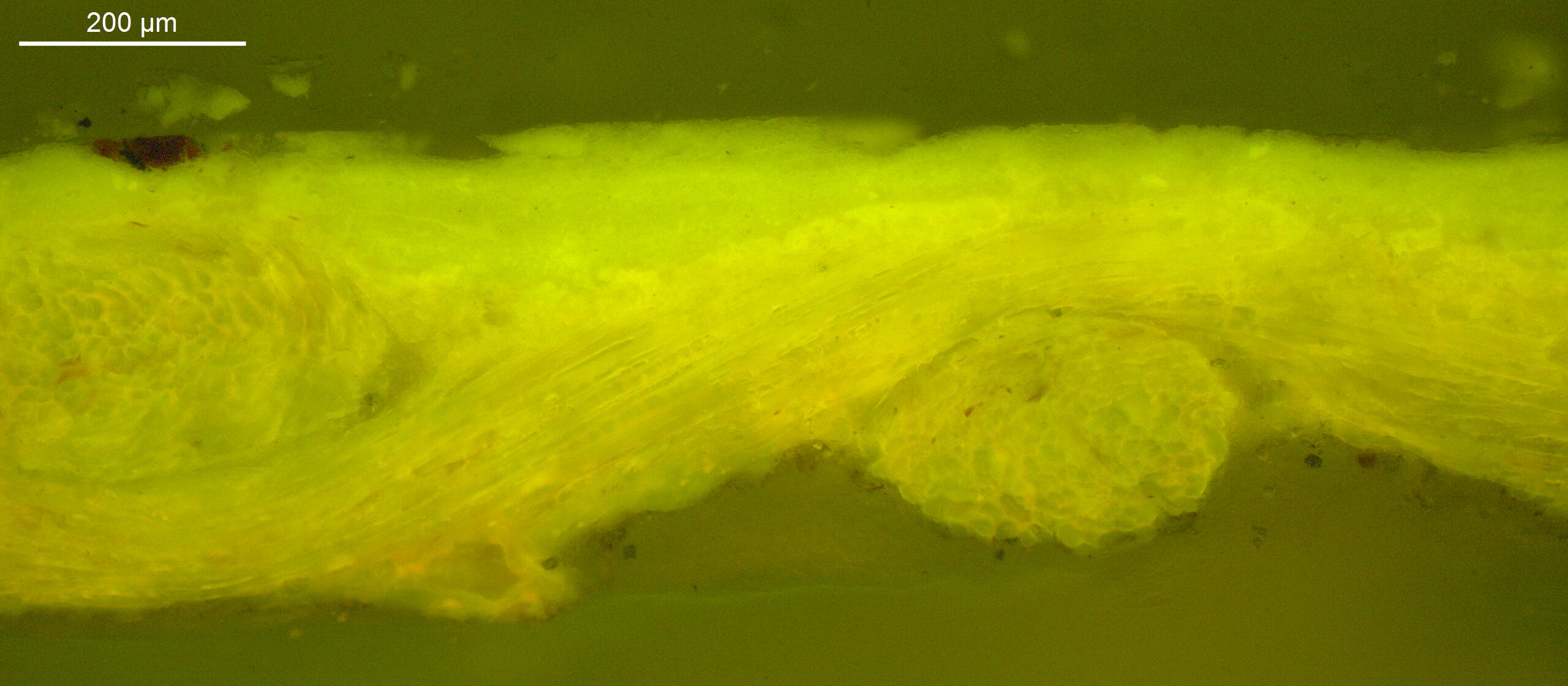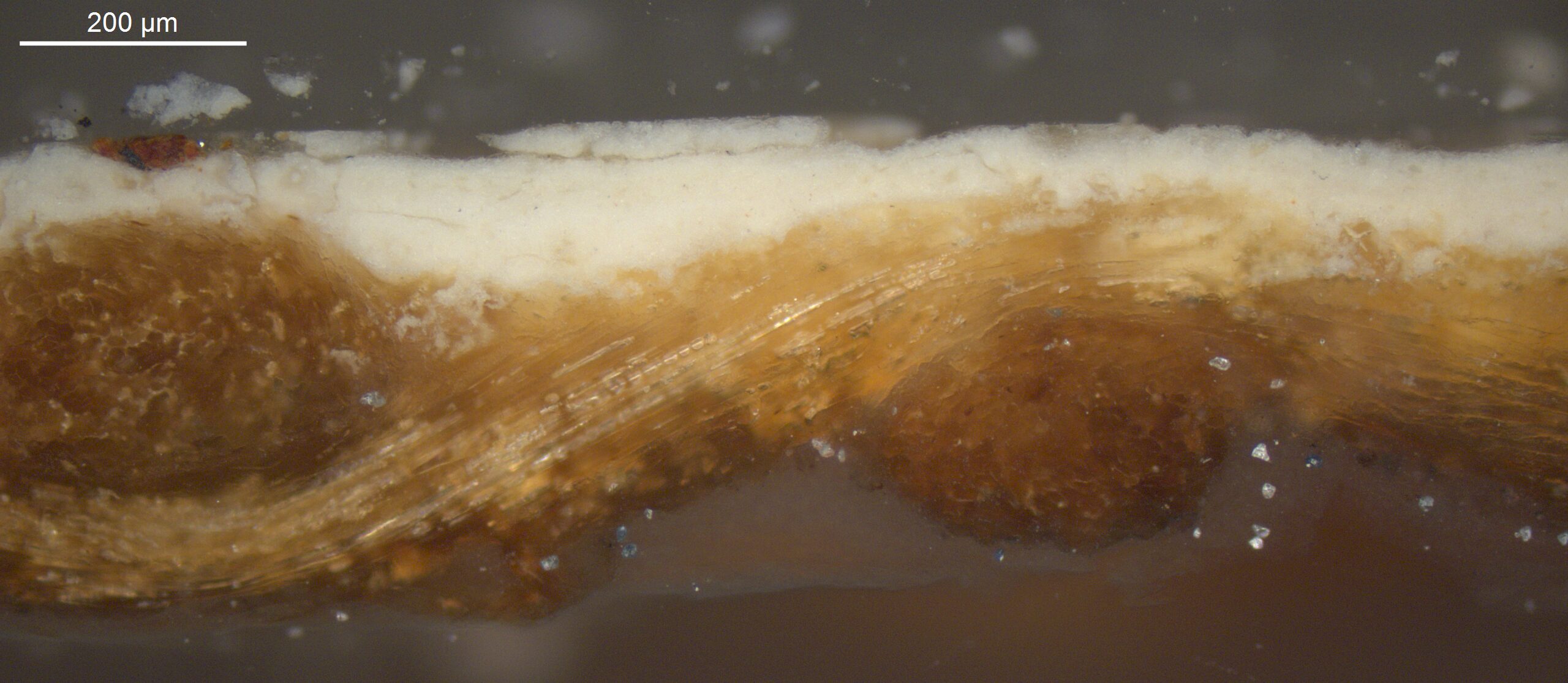 Optical microscopy uses visible light and lenses to magnify and examine the surface and structure of a painting. When applied to cross sections of paint samples, it allows for detailed observation of a painting’s stratigraphy (layer structure) and pigment particles. It is often employed with various illumination techniques, such as dark field and UV fluorescence, to enhance the analysis. Layer number 1 in the results section below the images refers to the layer at the bottom of the cross section.