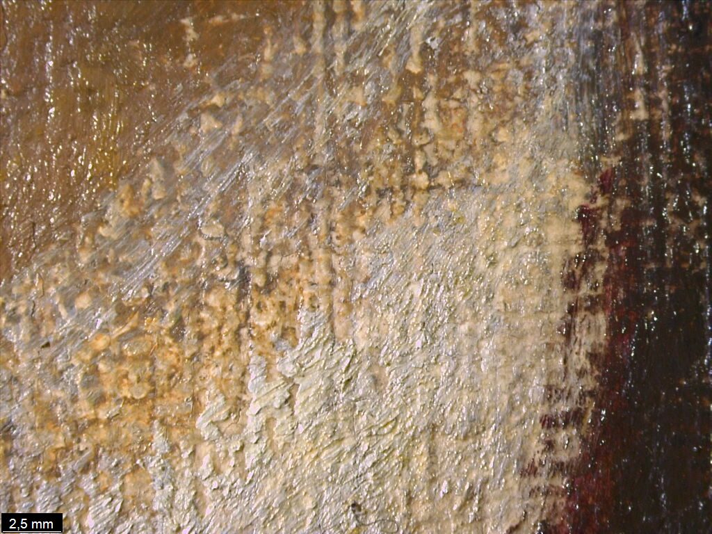 The paint varies in thickness but has a simple stratigraphy with generally no more than a couple of layers in the head and the background. The bottom part of the figure was executed with a few brush strokes in a single layer.