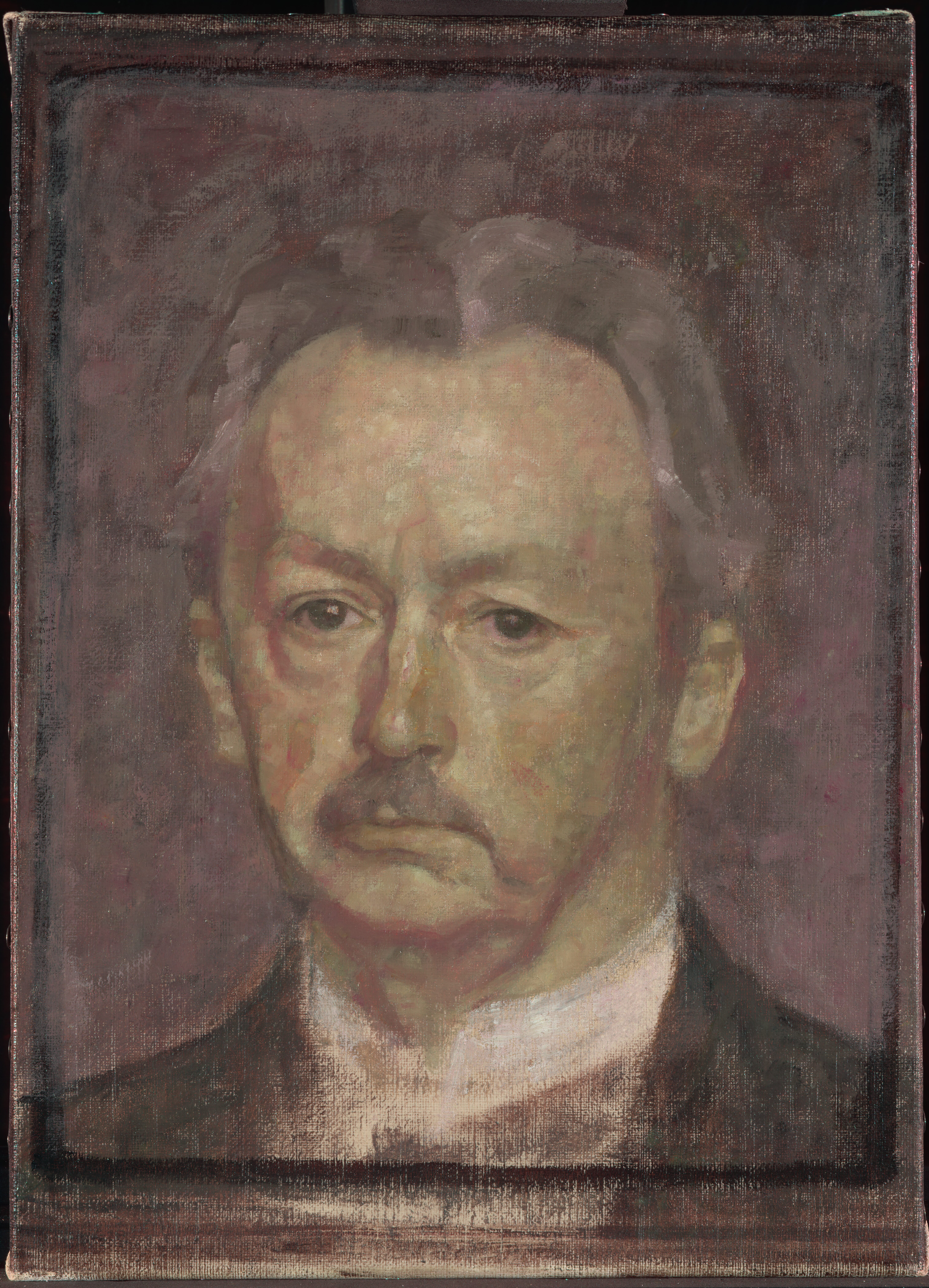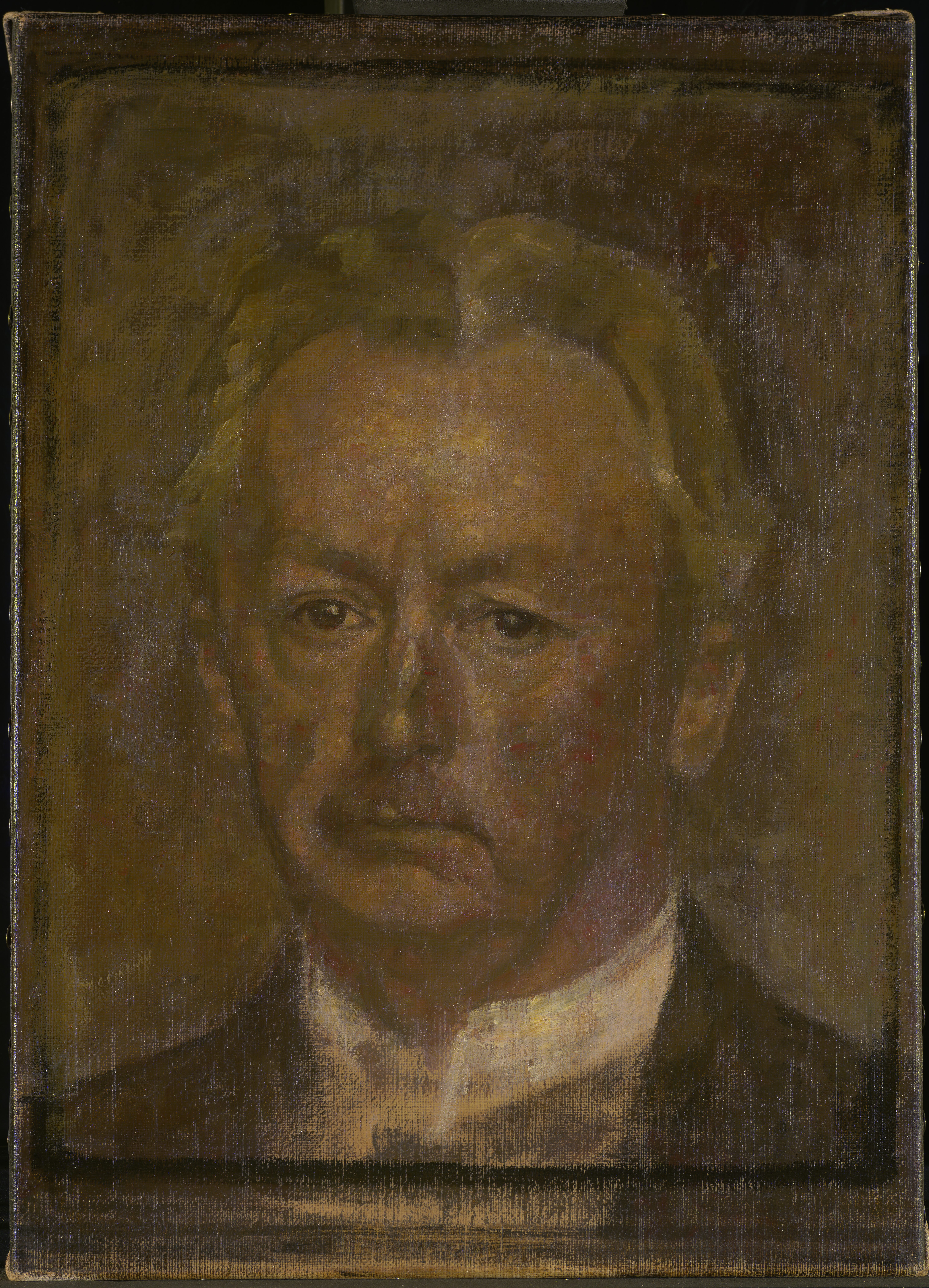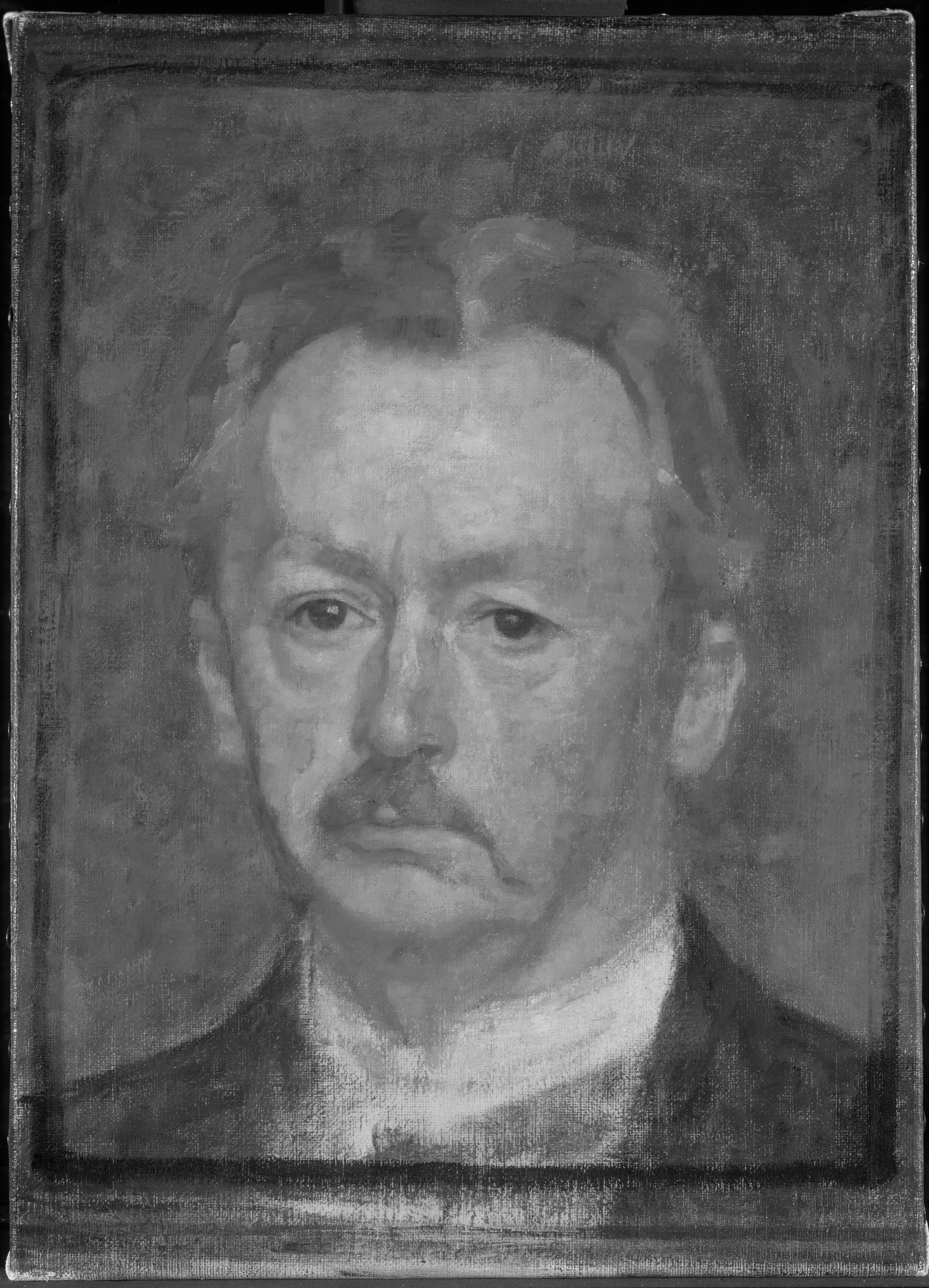 According to Bramsen (1918) p.113 this is the last portrait Hammershøi ever painted - a selfportrait with a sad or melancholy expression as Bramsen puts it. Hammershøi is marked by a long-term illness with throat cancer from which he died the following year on February 13th 1916.