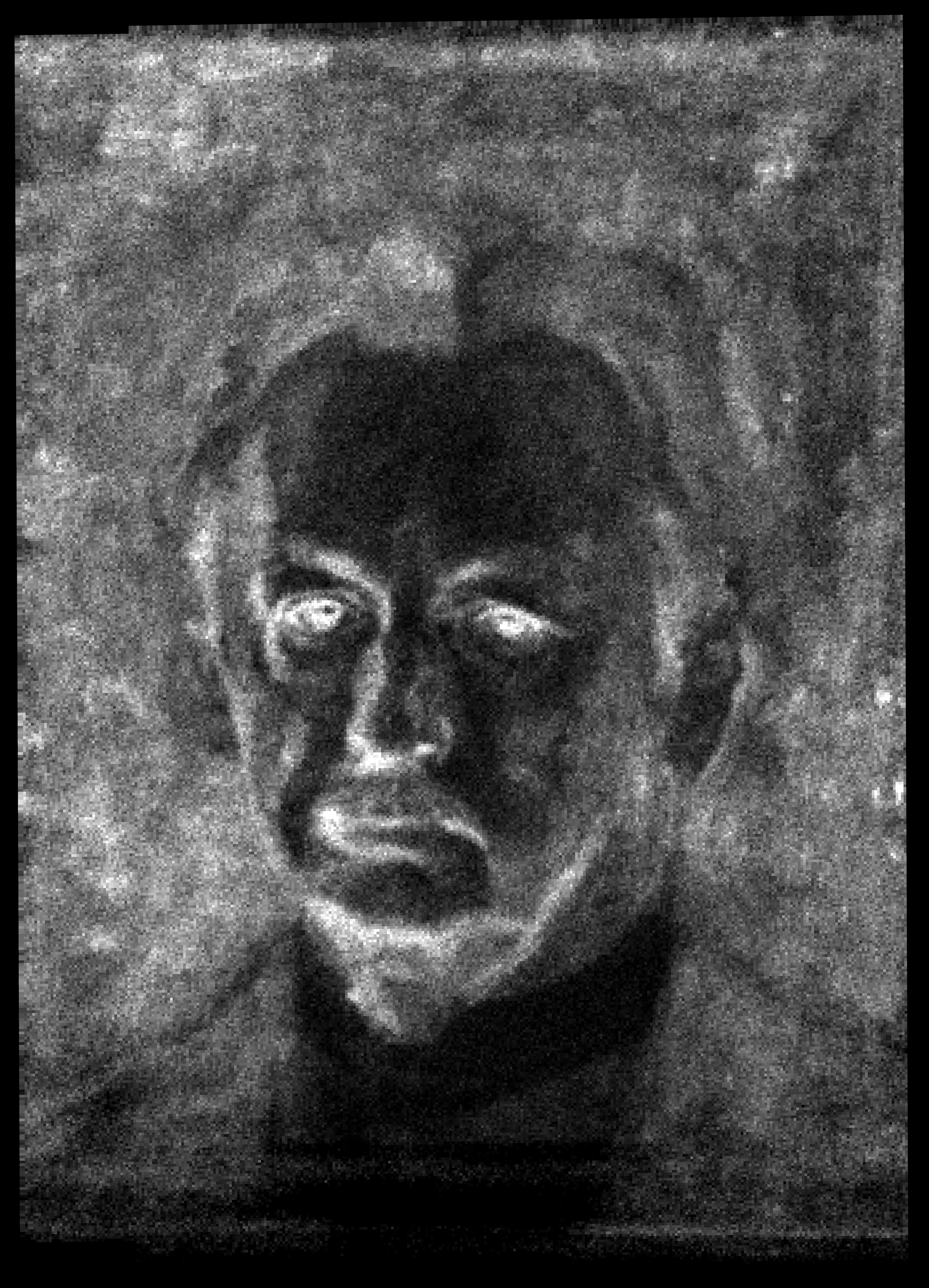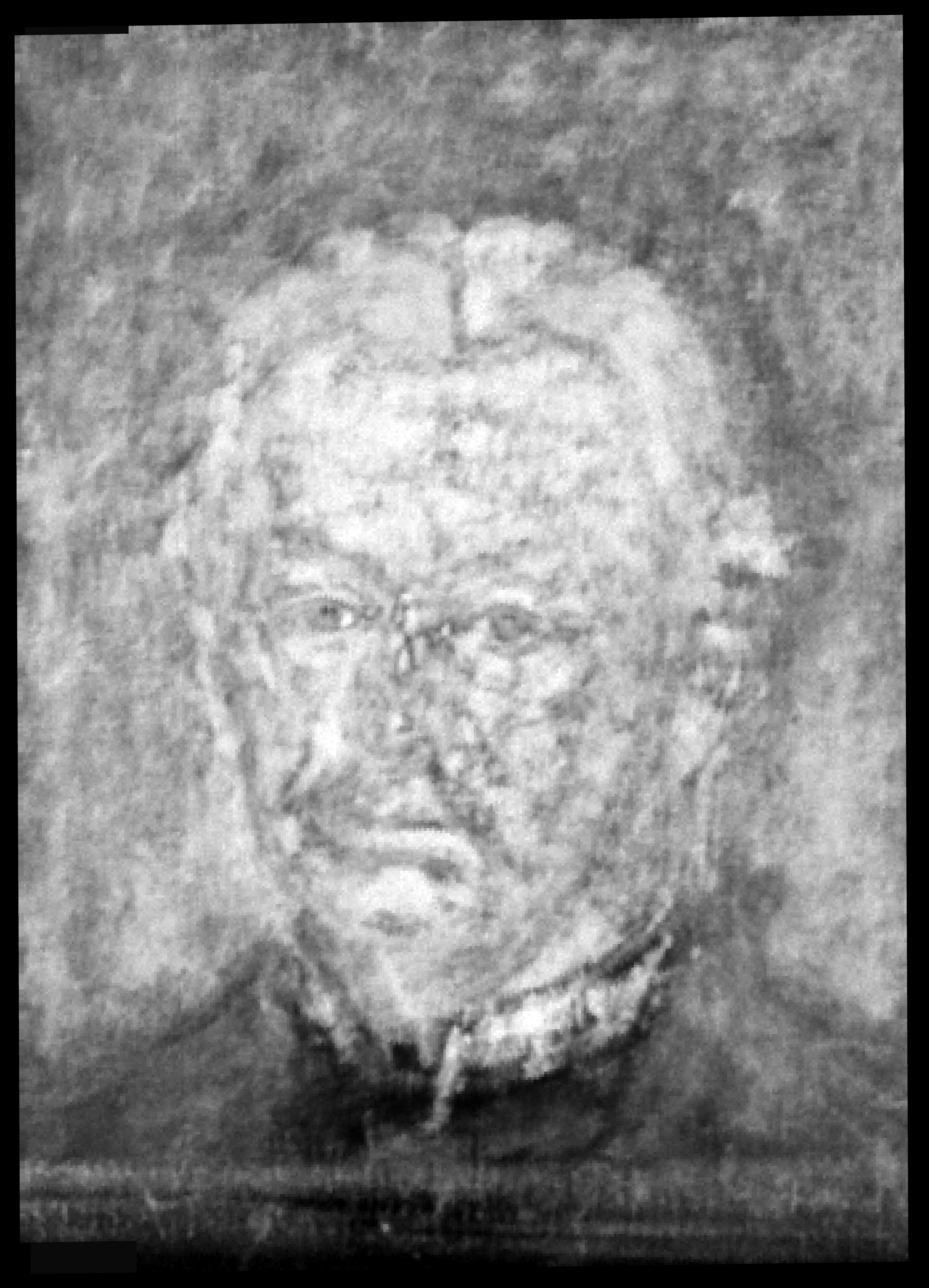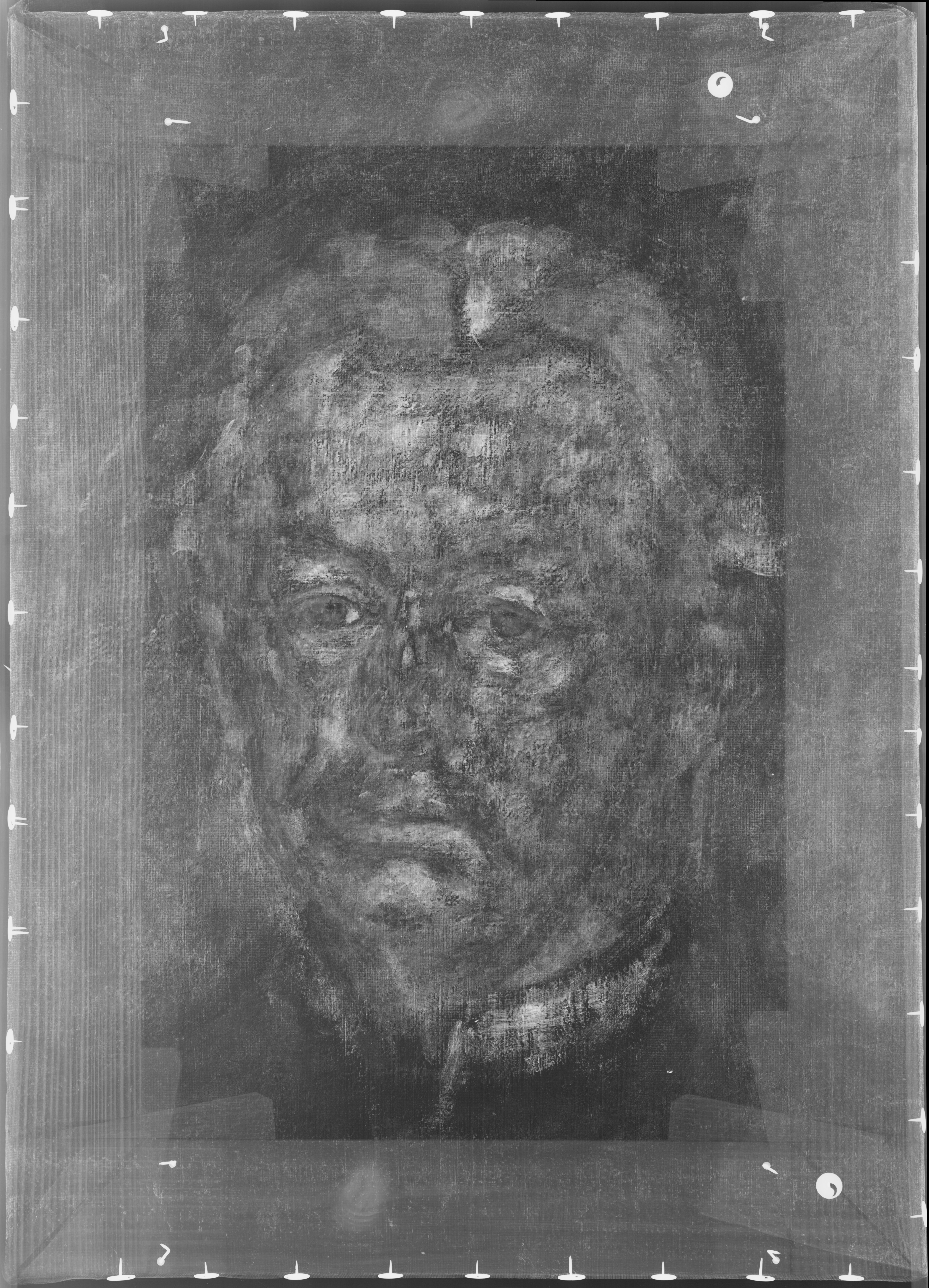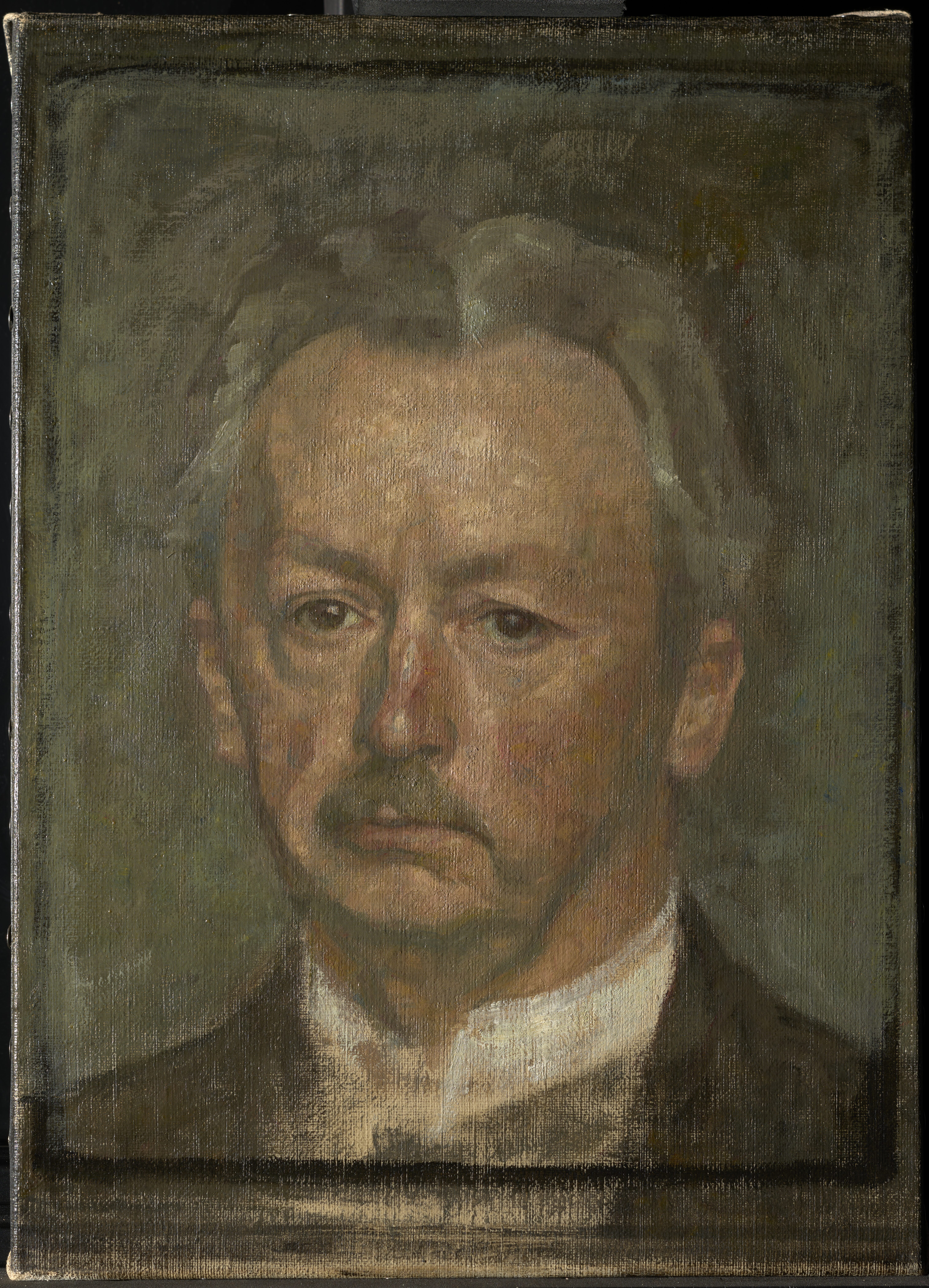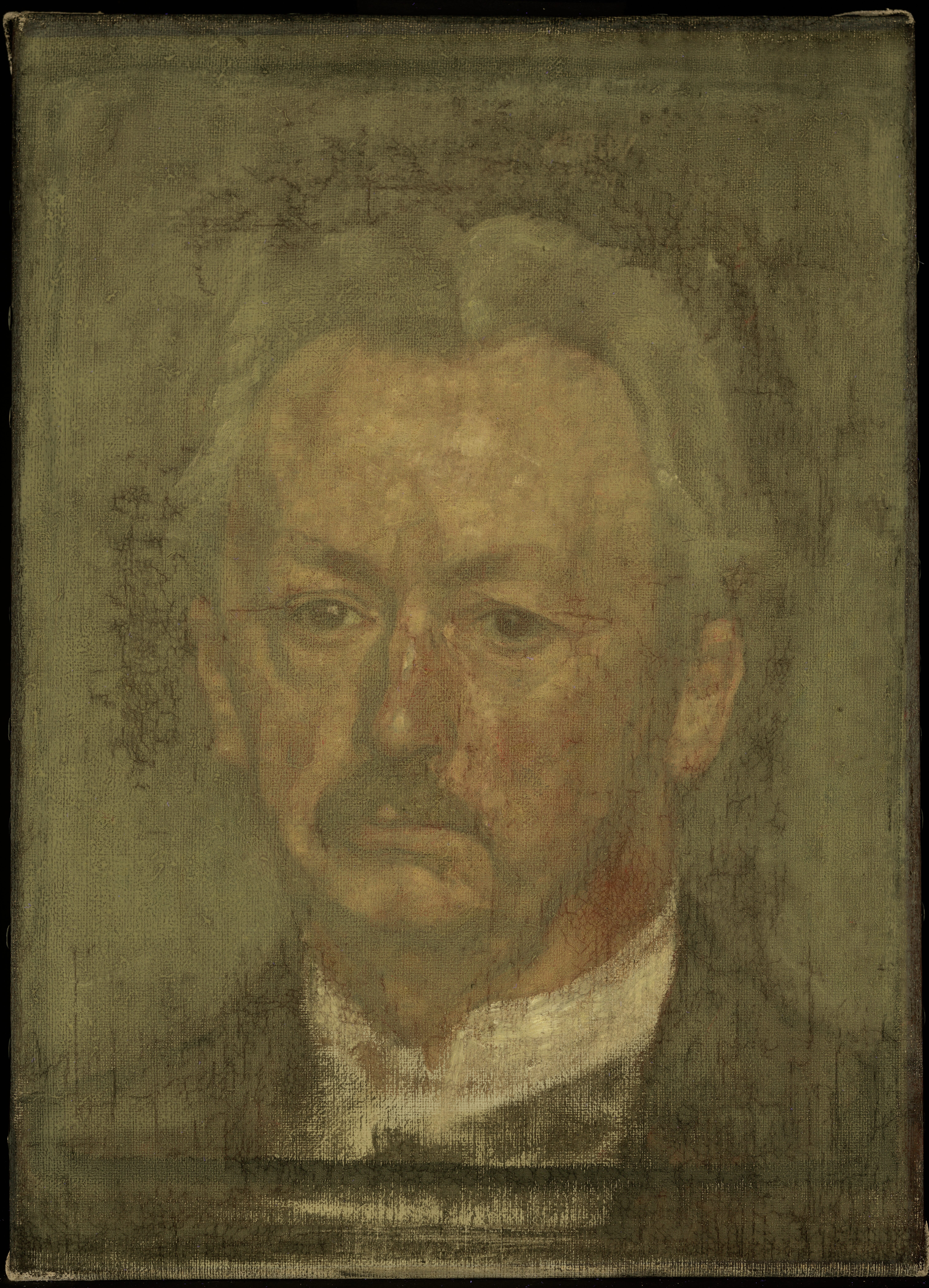 (Transl.): SELF-PORTRAIT. Head. Larger than life-size. En face. Grizzled hair. White upright shirt collar. Sad expression.