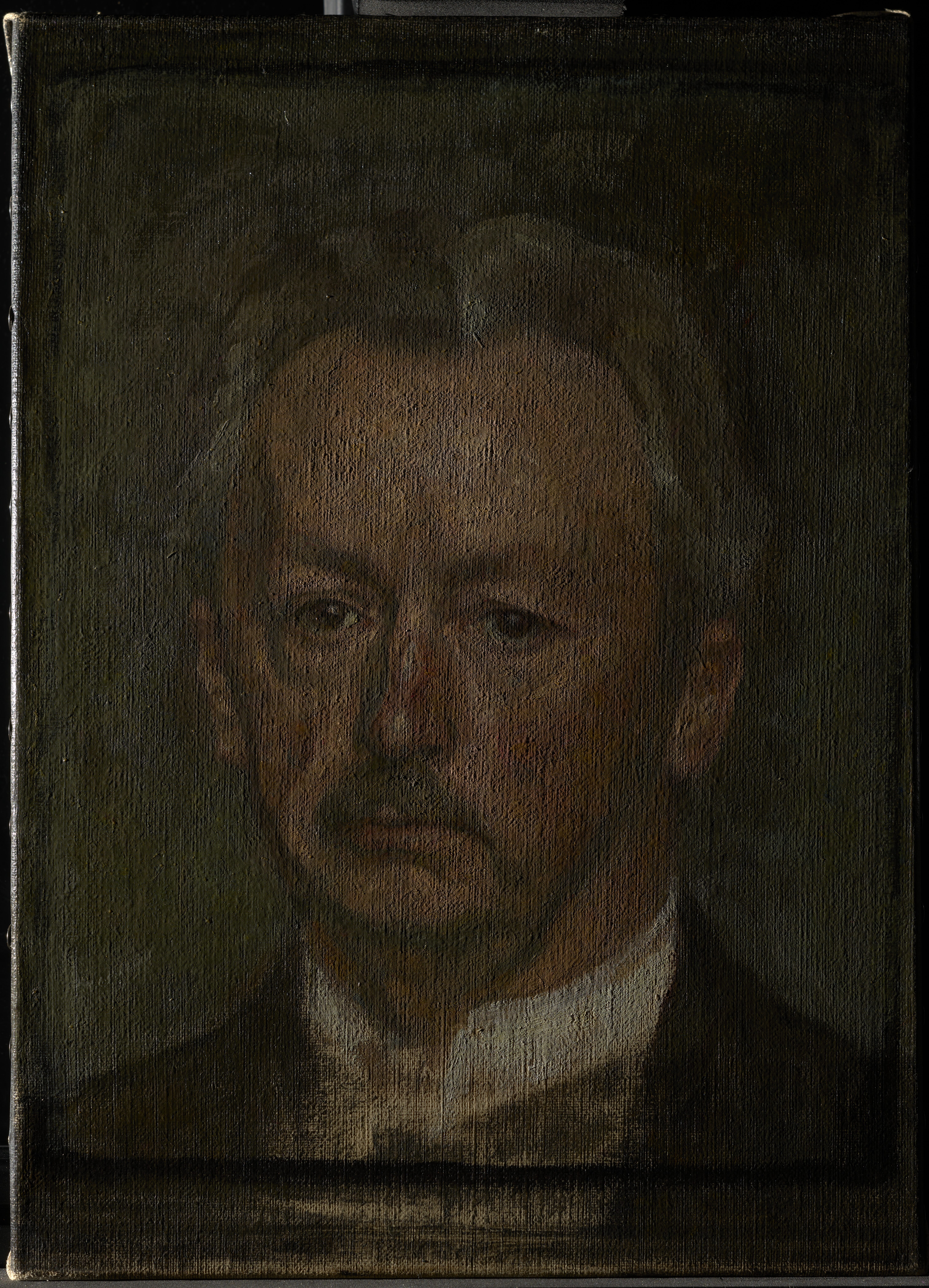 The ground is visible on the reverse of the canvas, through the paint layers in the background and in the lower part of the painting where the shirt and jacket have been left in a seemingly unfinished state.