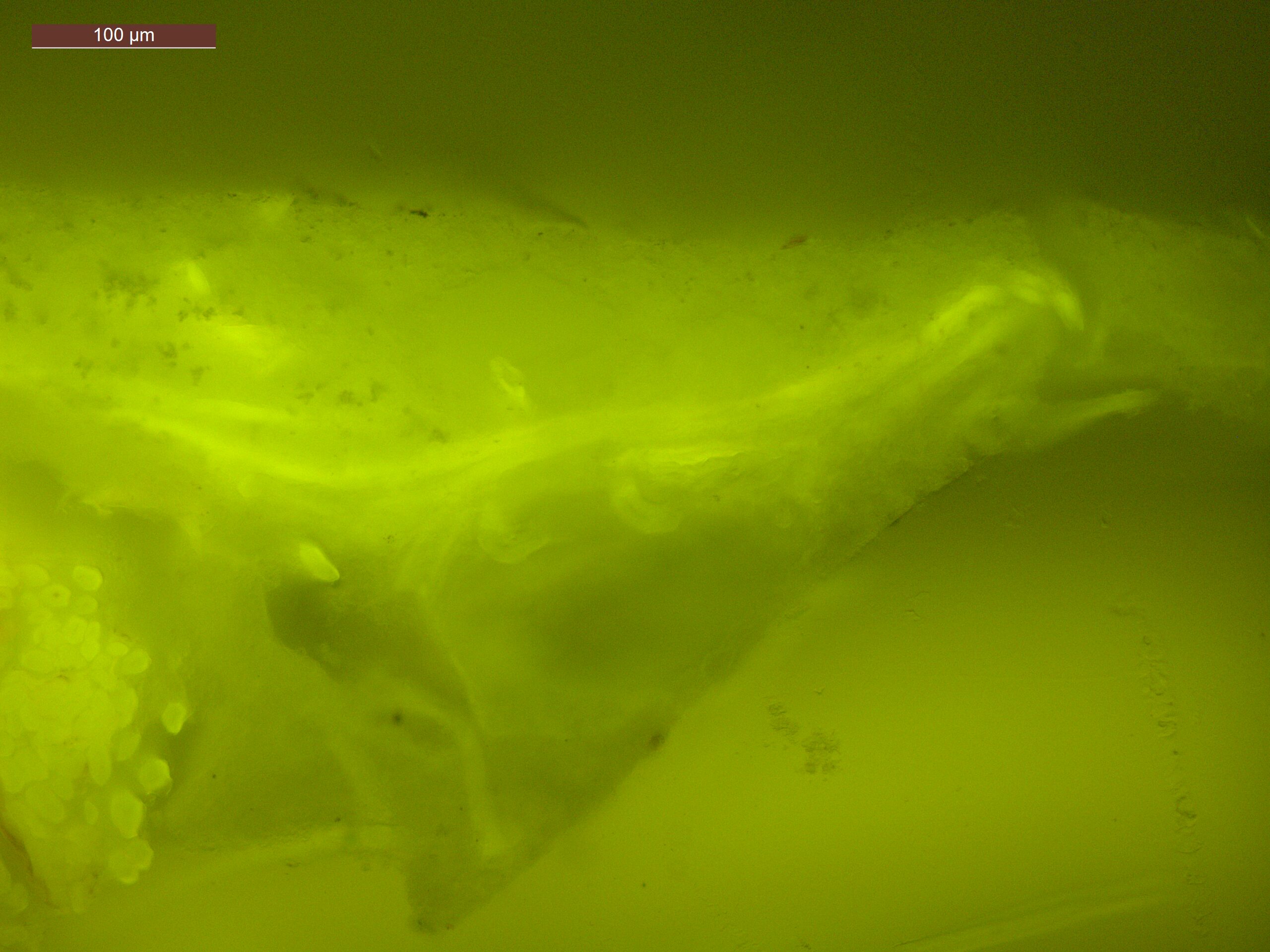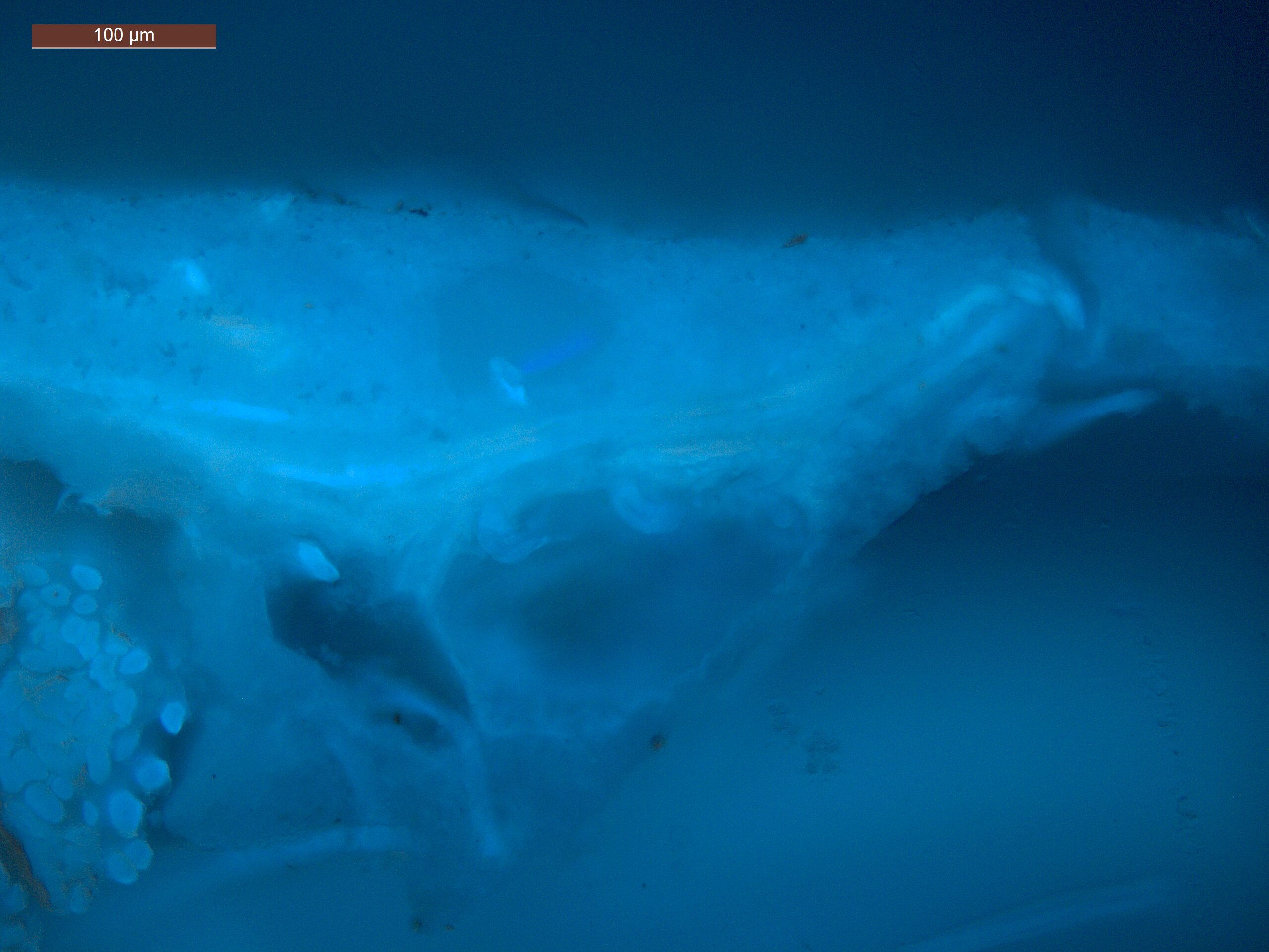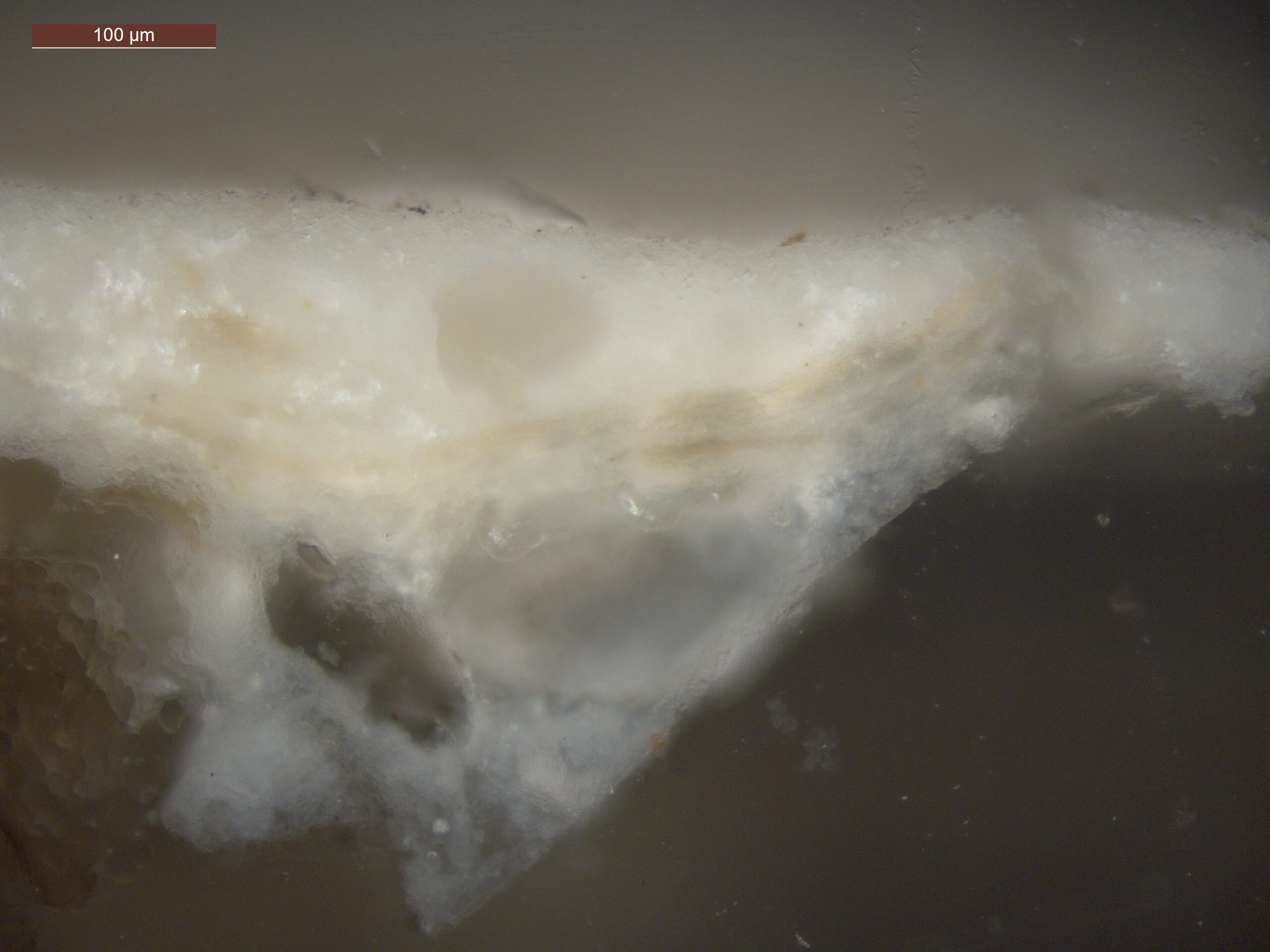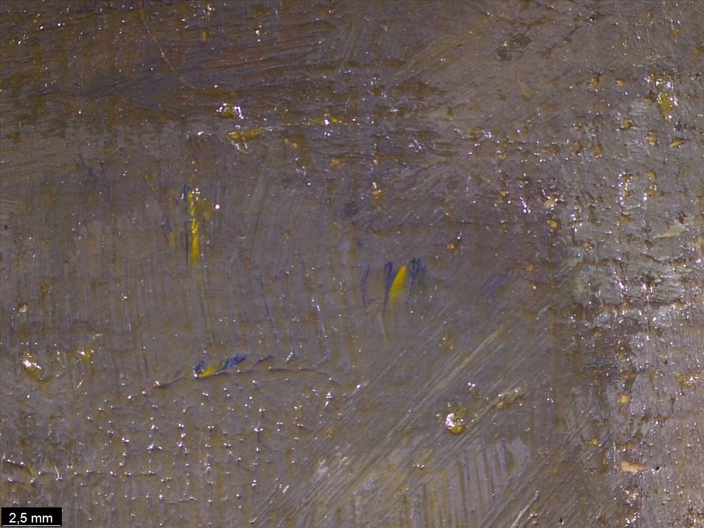 Optical microscopy uses visible light and lenses to magnify and examine the surface and structure of a painting. When applied to cross sections of paint samples, it allows for detailed observation of a painting’s stratigraphy (layer structure) and pigment particles. It is often employed with various illumination techniques, such as dark field and UV fluorescence, to enhance the analysis. Layer number 1 in the results section below the images refers to the layer at the bottom of the cross section.