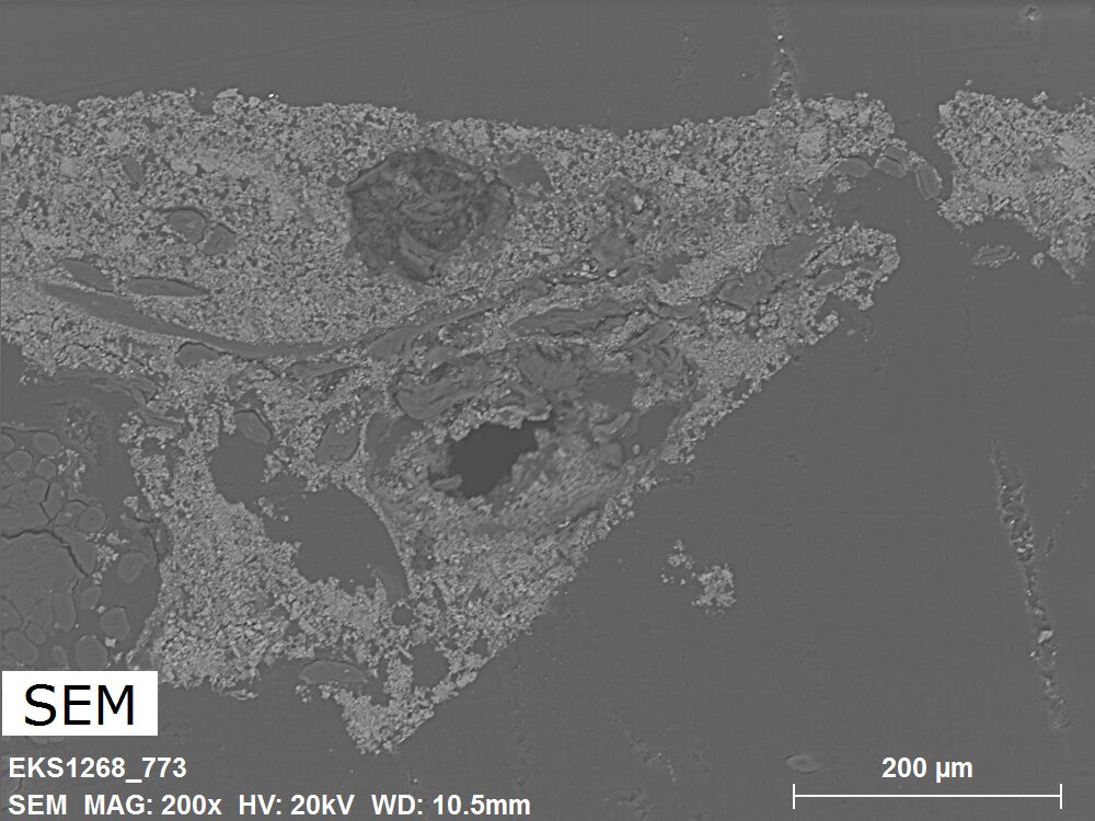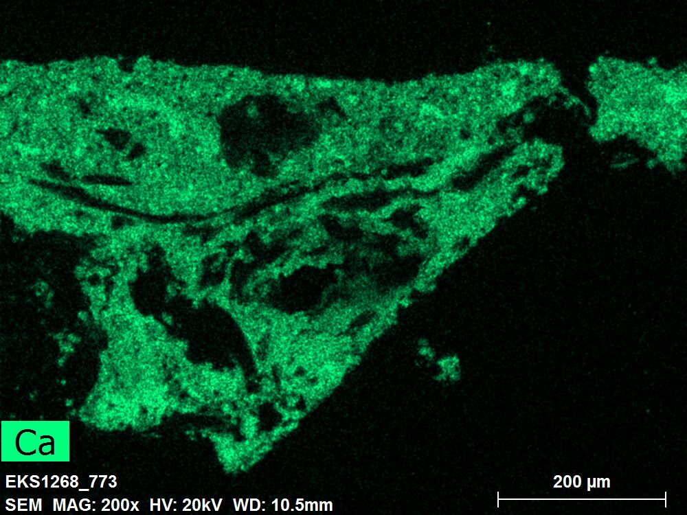 SEM-EDXS is a technique that provides highly detailed images at the microscopic level while simultaneously identifying the elemental composition of a sample. It is particularly valuable for studying the stratigraphy of paint cross sections at very fine scales, for the chemical characterisation of pigments, fillers and degradation products, and for detecting trace elements that may indicate very specific materials. Below, the elements listed in parentheses refer to minor elements whose relative abundance is below 10% of the total signal. The F1 map below represents the Pb M line. Read more under SEM-EDXS in the glossary.