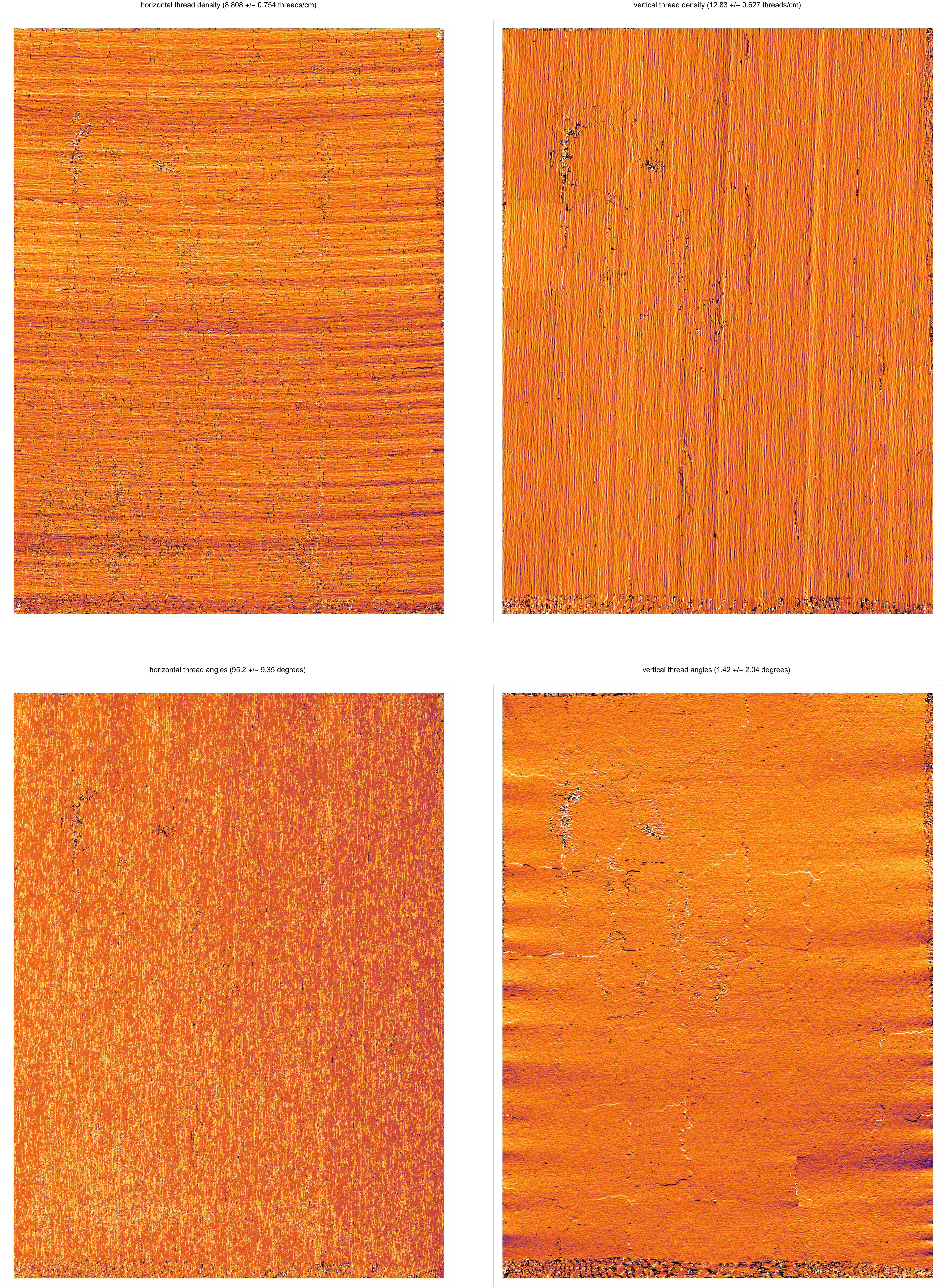 Weave maps are detailed visualisations of the thread patterns in a canvas, created by applying thread counting on high-resolution x-radiographs. These are used for analysing the structure of the canvas and to compare canvases used in different paintings. A comparison between weave maps can sometimes determine if two or more pieces of canvas derive from the same batch and thereby shed light on the place and period in which a painting has been created.