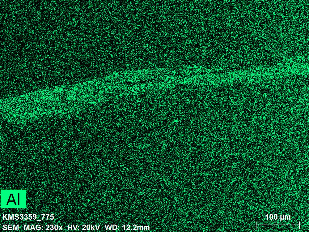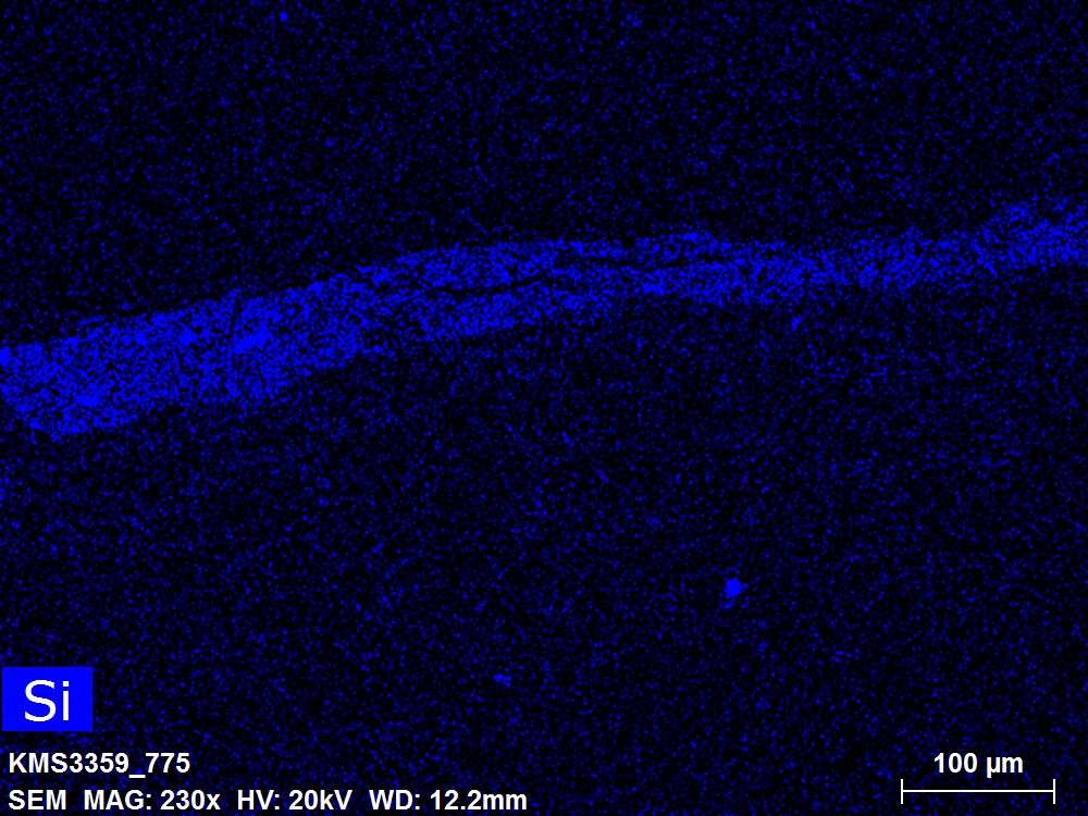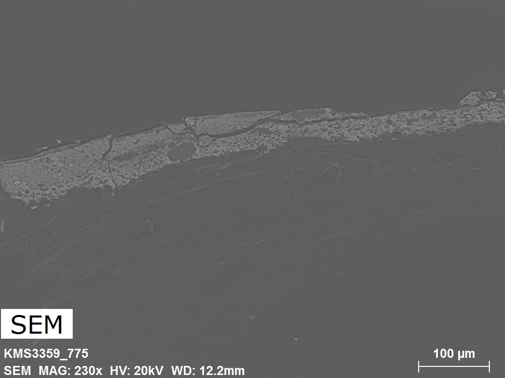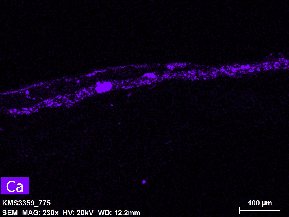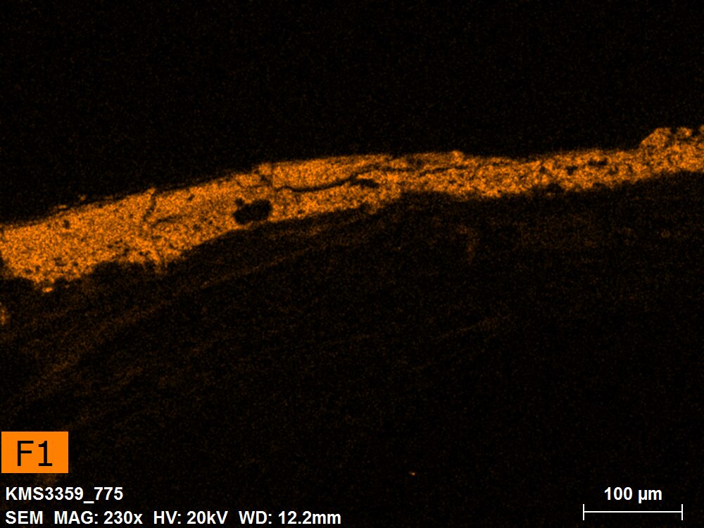 SEM-EDXS is a technique that provides highly detailed images at the microscopic level while simultaneously identifying the elemental composition of a sample. It is particularly valuable for studying the stratigraphy of paint cross sections at very fine scales, for the chemical characterisation of pigments, fillers and degradation products, and for detecting trace elements that may indicate very specific materials. Below, the elements listed in parentheses refer to minor elements whose relative abundance is below 10% of the total signal. The F1 map below represents the Pb M line. Read more under SEM-EDXS in the glossary.