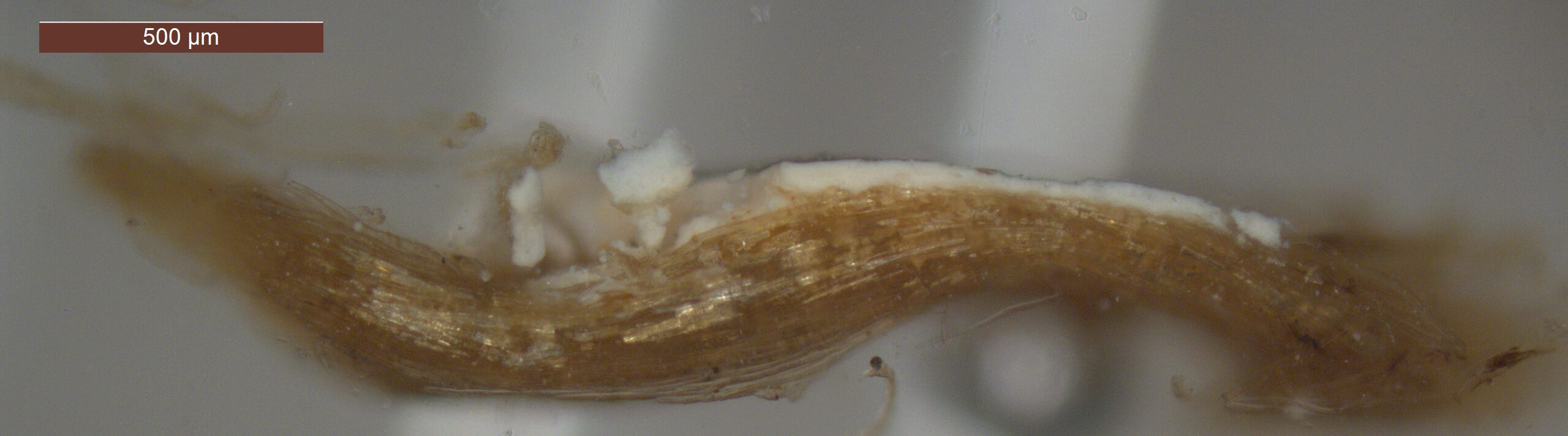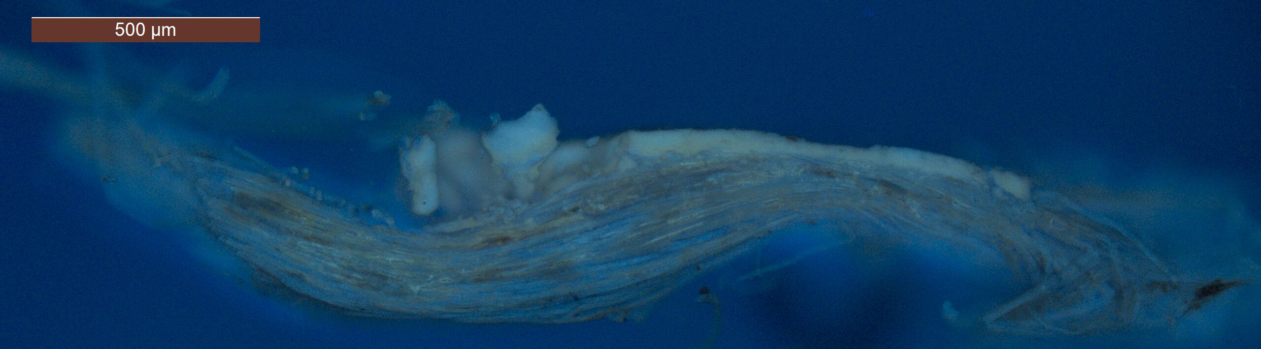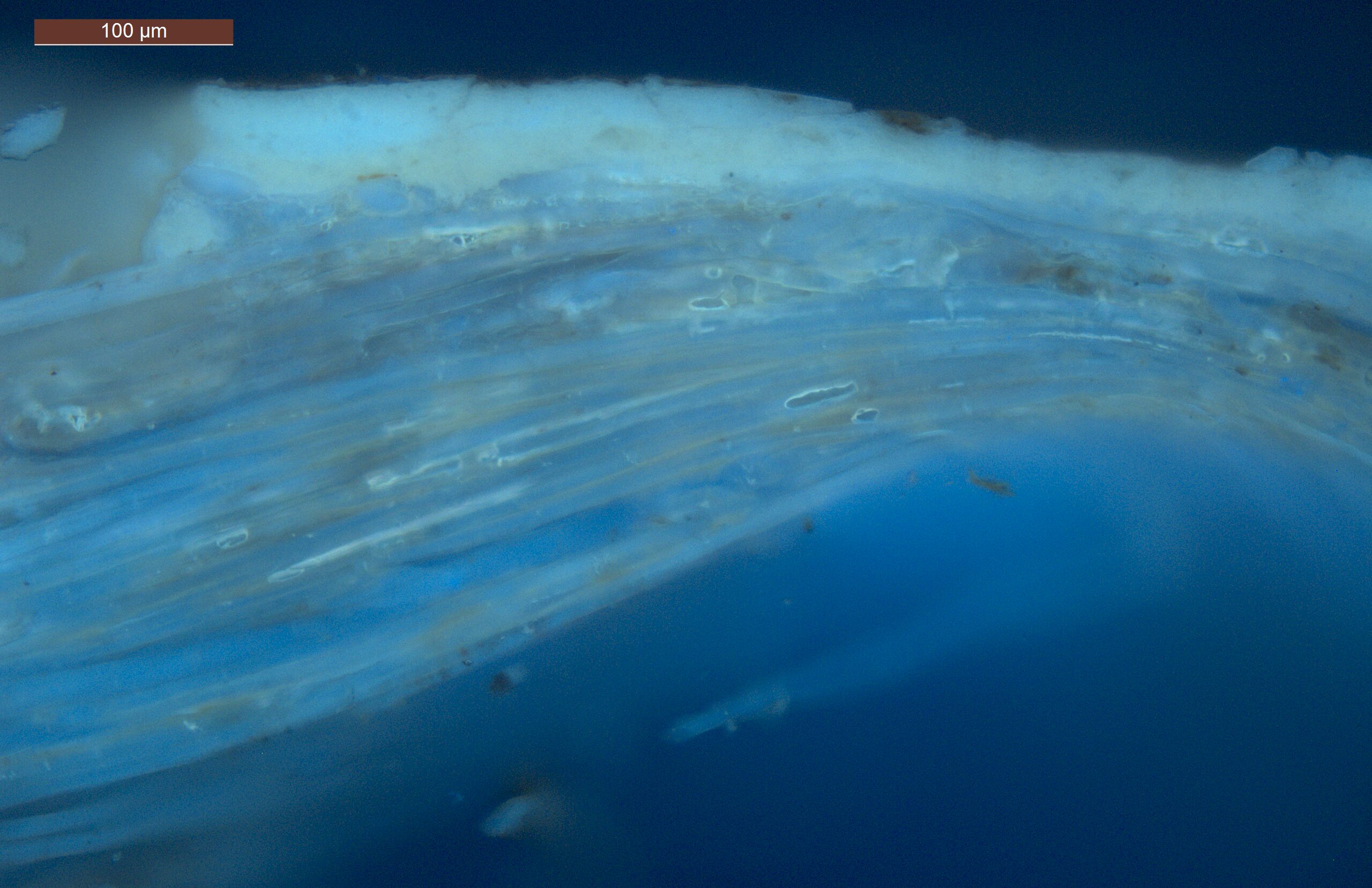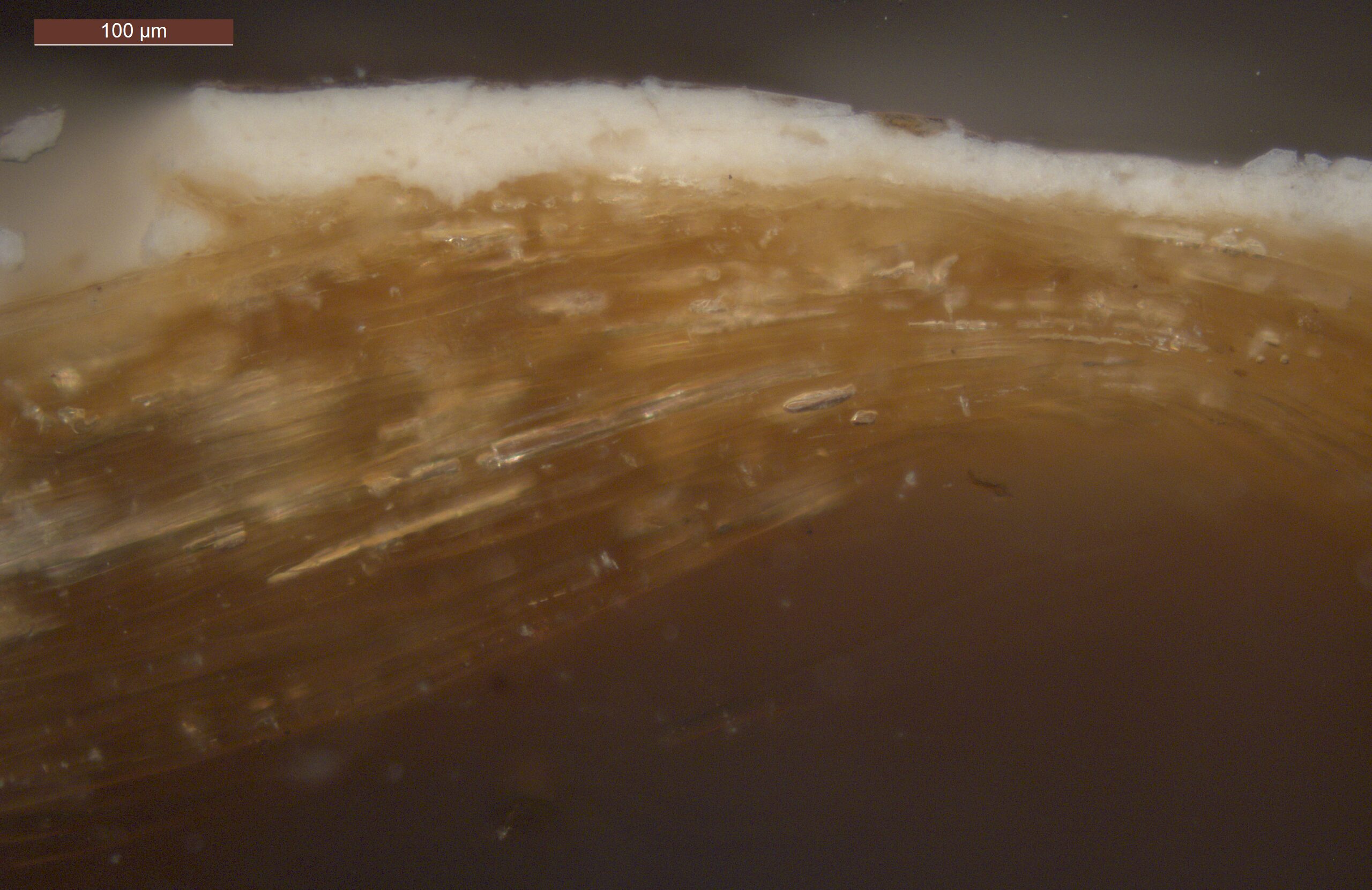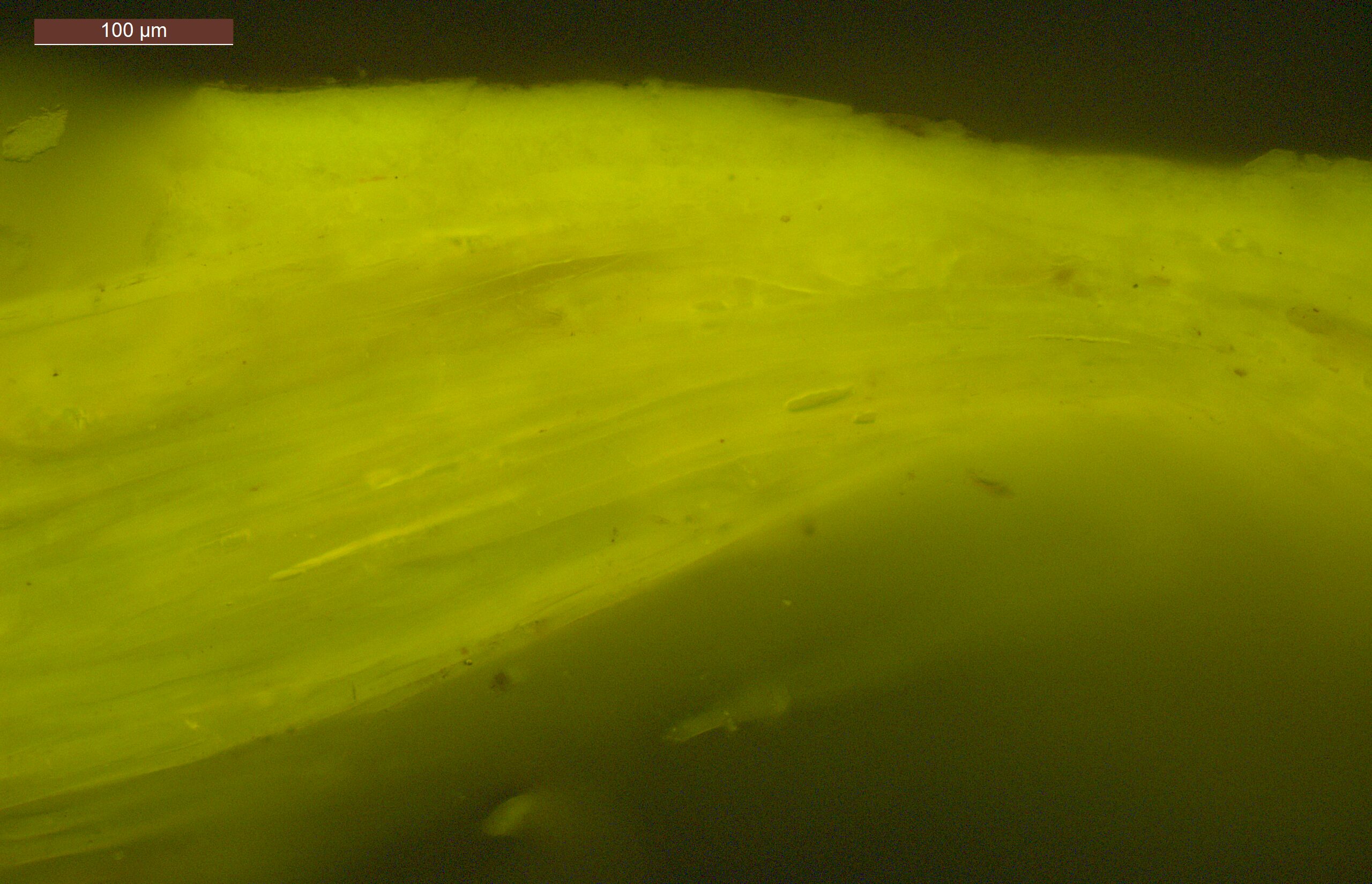 Optical microscopy uses visible light and lenses to magnify and examine the surface and structure of a painting. When applied to cross sections of paint samples, it allows for detailed observation of a painting’s stratigraphy (layer structure) and pigment particles. It is often employed with various illumination techniques, such as dark field and UV fluorescence, to enhance the analysis. Layer number 1 in the results section below the images refers to the layer at the bottom of the cross section.