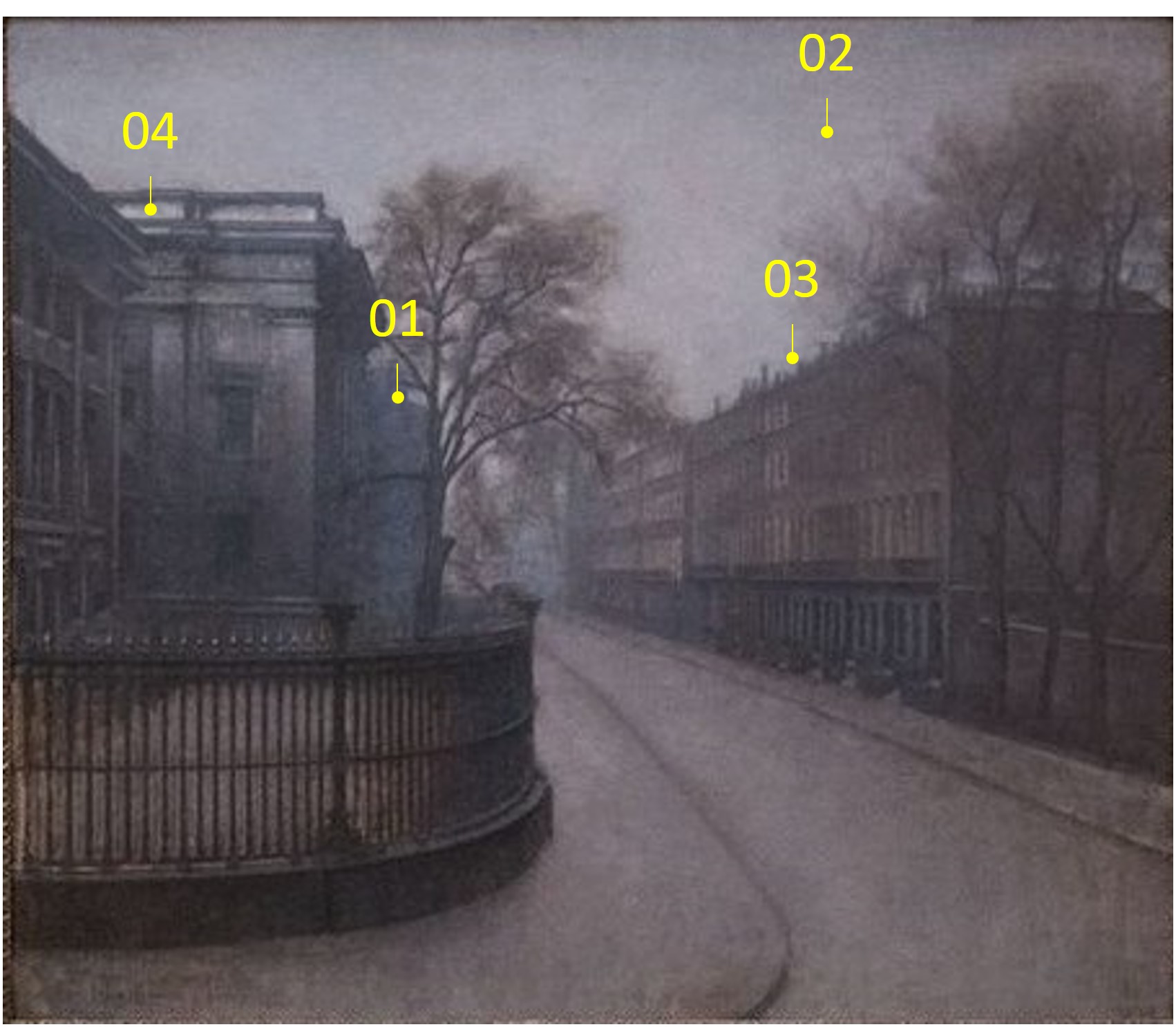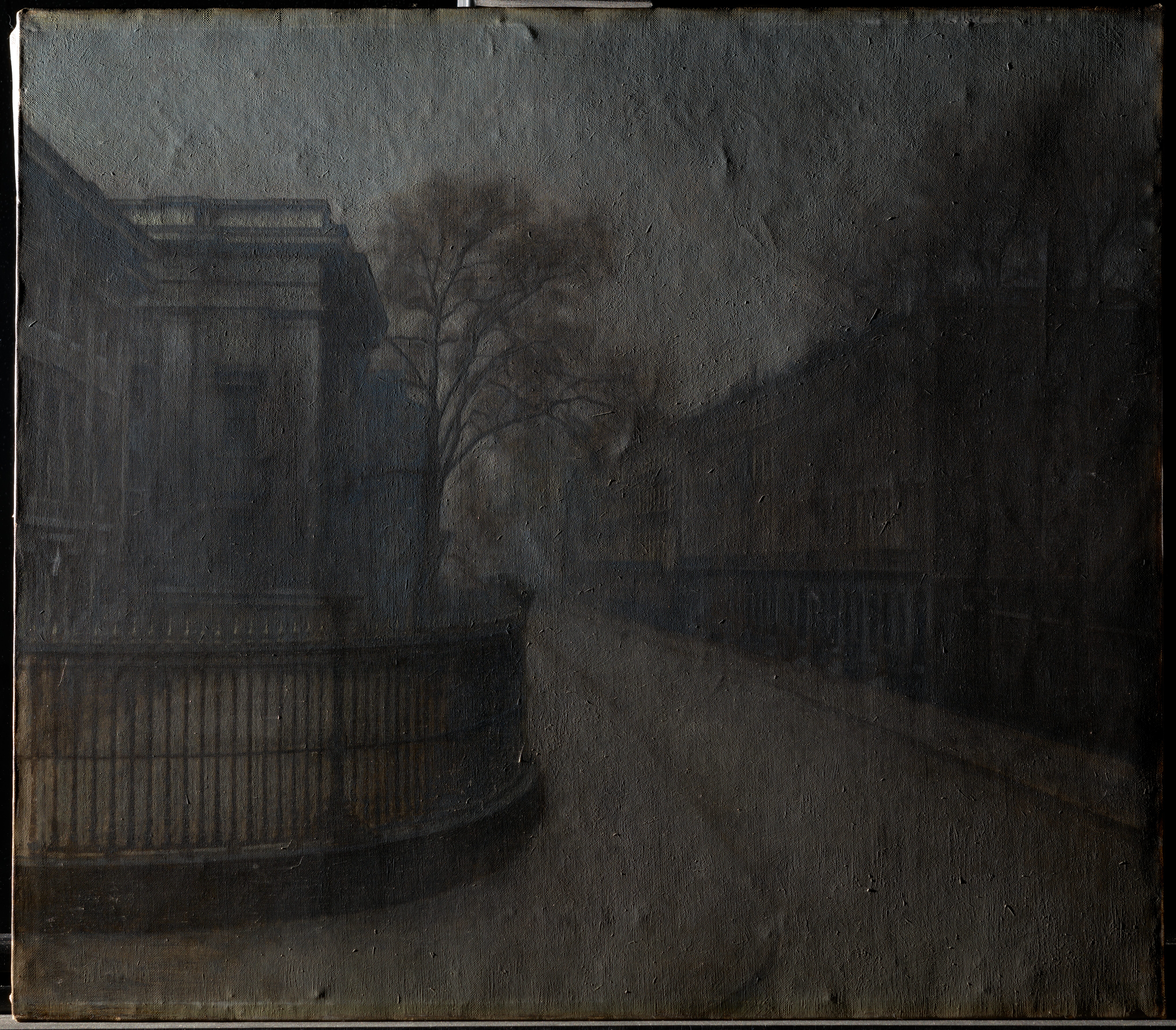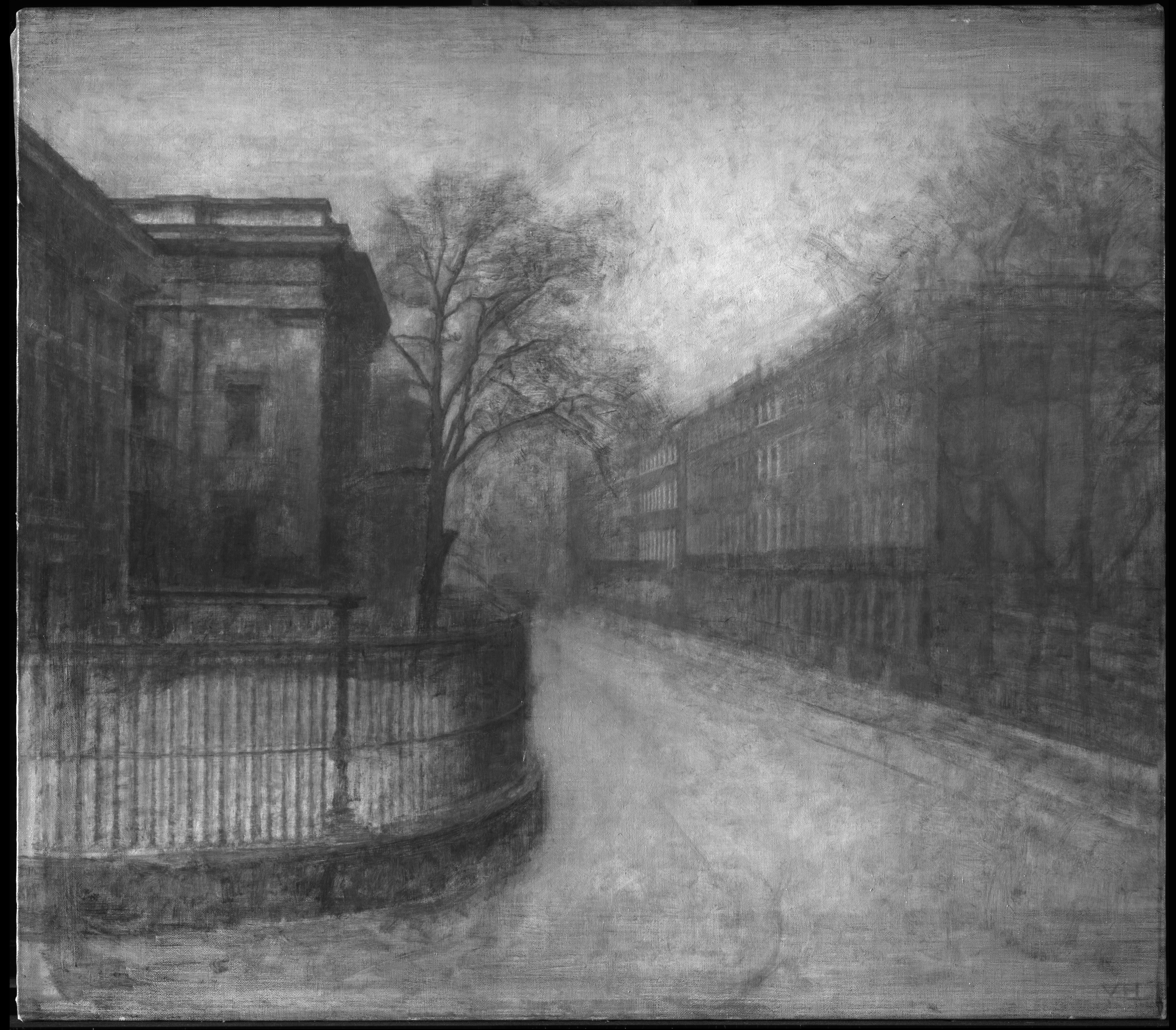 The brushwork in the buildings, especially the left-hand museum building, to some extent follows the shape and outlines of the architectural elements. This applies to the final layers, whereas underlying paint in some cases was applied in diverging directions. In several places, however, longer narrow lines of the buildings were applied in very short brushstrokes perpendicular to the longitudinal direction. This applies also to the interstices between the bars in the foreground railings. The brushwork in the paint of the sky and the street has no general direction. In the street and the pavements, the brushwork is increasingly open and loose towards the bottom of the composition, i.e. the closer it gets to the foreground. Here, as between the bars of the railings on the left, the ground is perceptible in many places. The same applies to the tree crowns, where the loose handling leaves the off-white underpaint visible. The light windows, seen foreshortened in the houses on the right as well as in the museum building facade near the tree, were created by scratching or scraping in the wet paint.