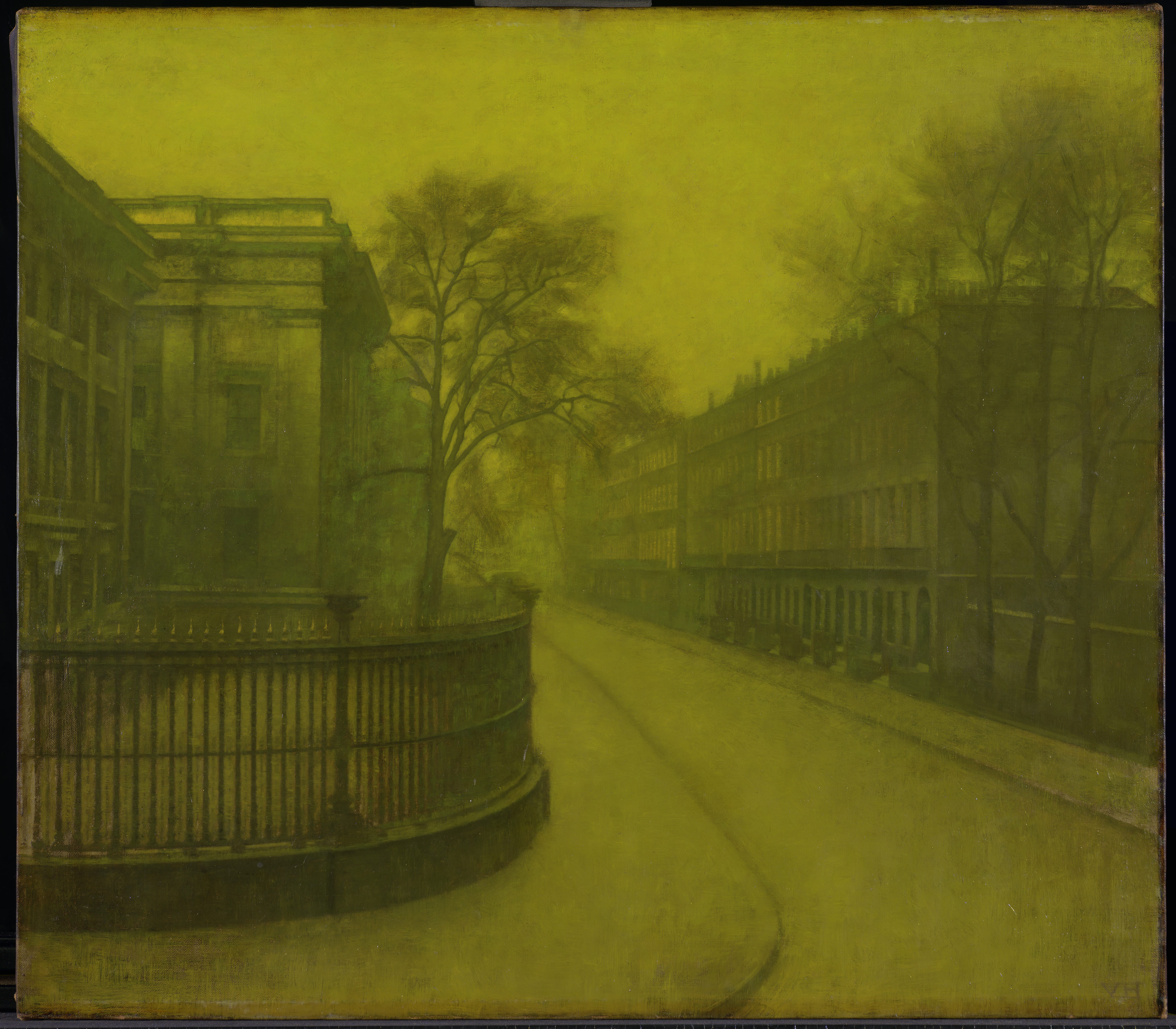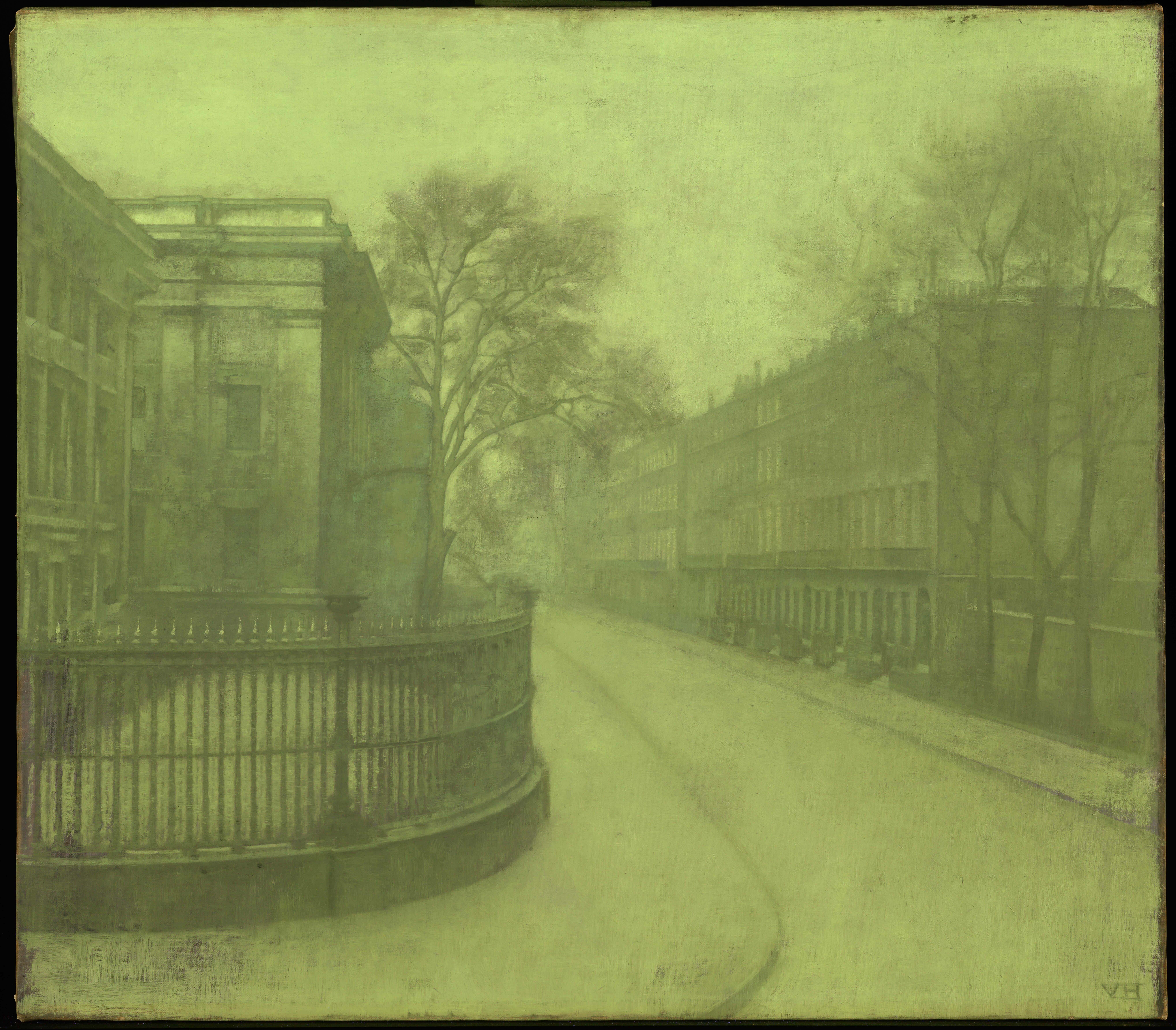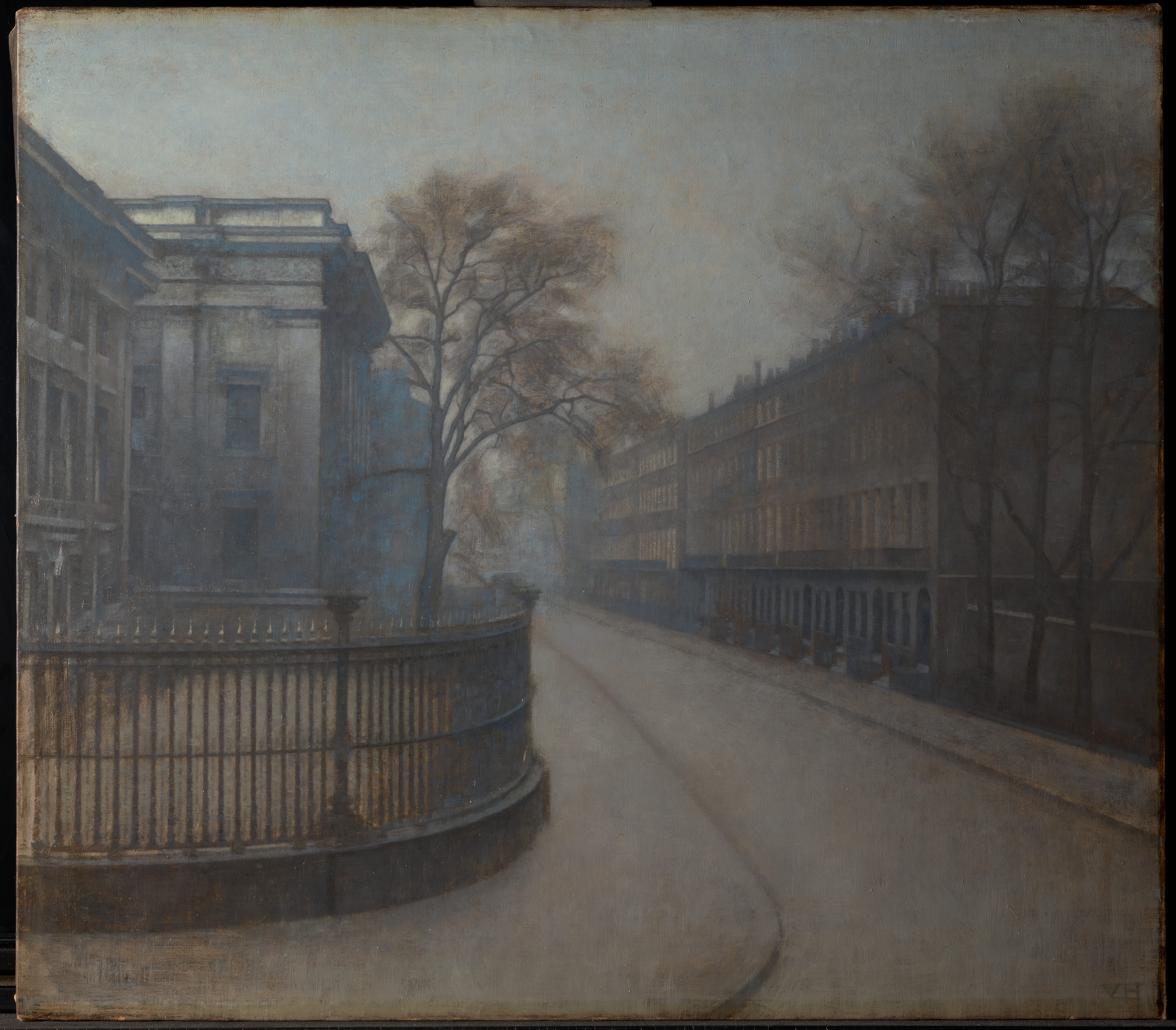 Ida and Vilhelm Hammershøi travelled to London together six times during his life. This streetview was painted during their third trip to the city in 1905-1906. In a letter to Frederikke Hammershøi from December 8. 1905 Ida described how Vilhelm painted the street while looking out from their window on 1st floor: "Vilhelm er ogsaa glad for sit Motiv han maler her set fra Vinduet Træer og Huse, som vi har lige udenfor os. Vi bor på 1ste Sal, saa vi kan ogsaa følge med alt paa Gaden…" / " Vilhelm is also pleased with his motif he is painting here seen from the window trees and houses, that we have right outside. We live on the 1st floor and are able to follow everything on the street…" (letter in Den Hirschsprungske Samlings Arkiv cited in Hvidt and Oelsner, 2018, p. 354).