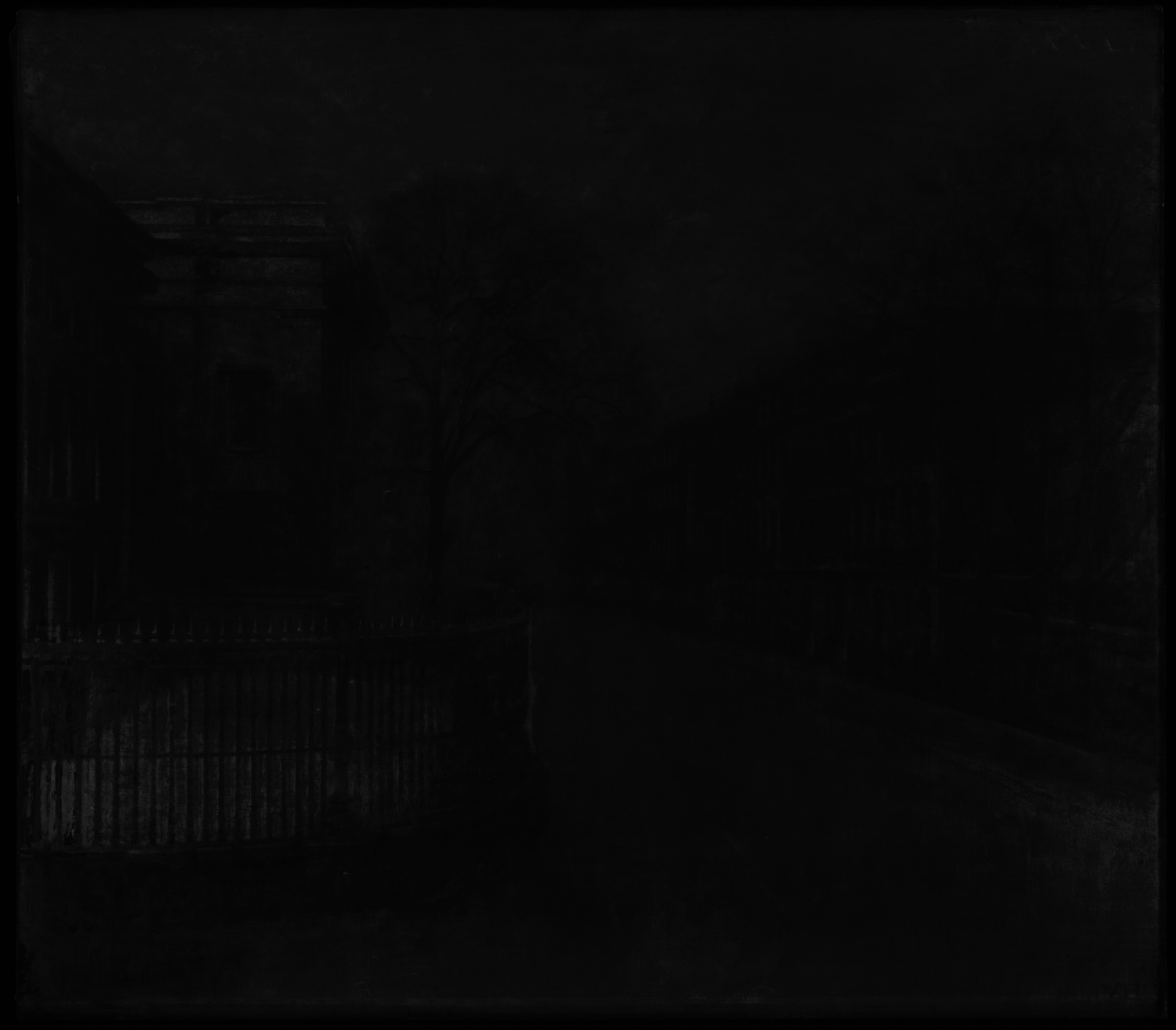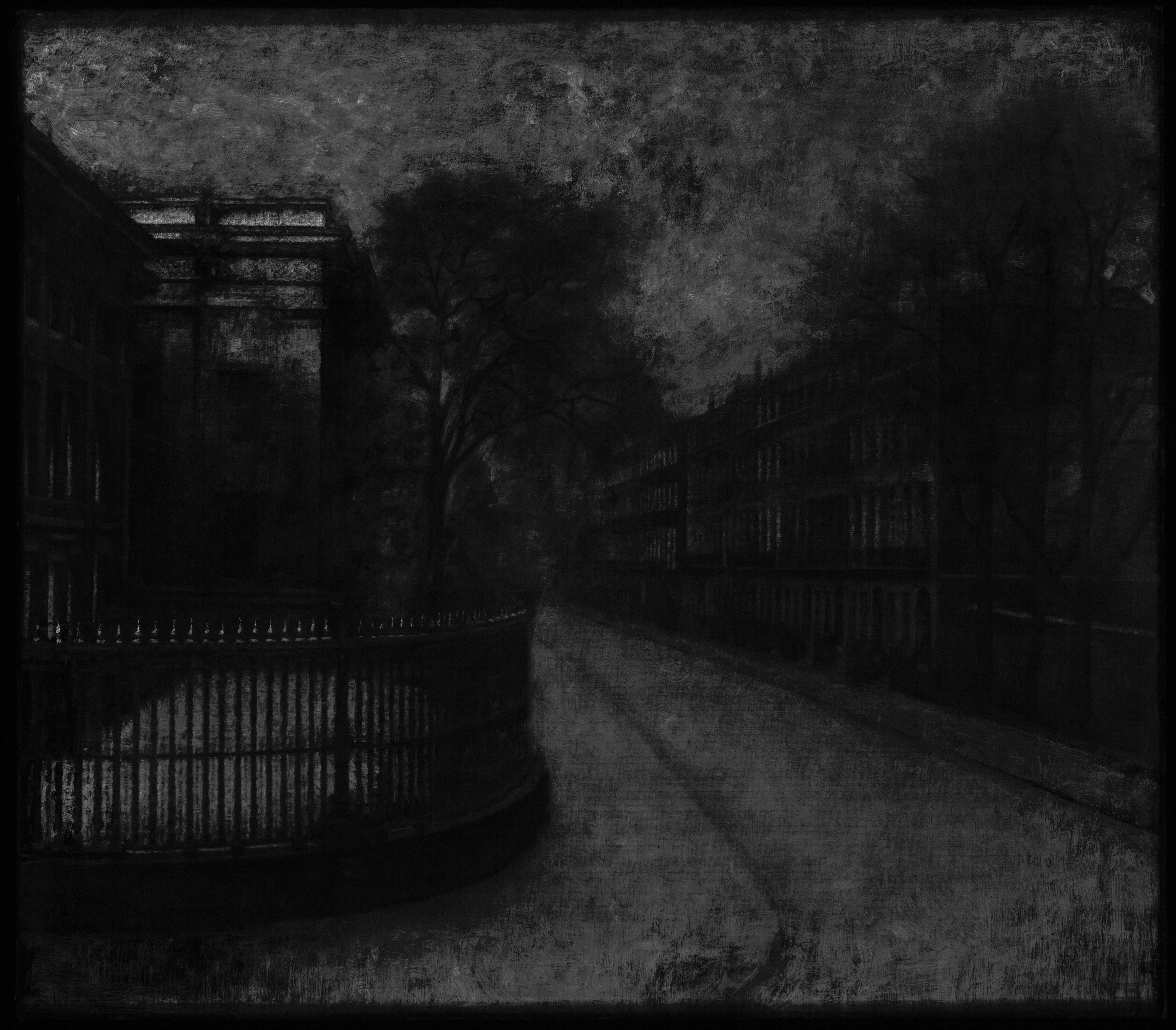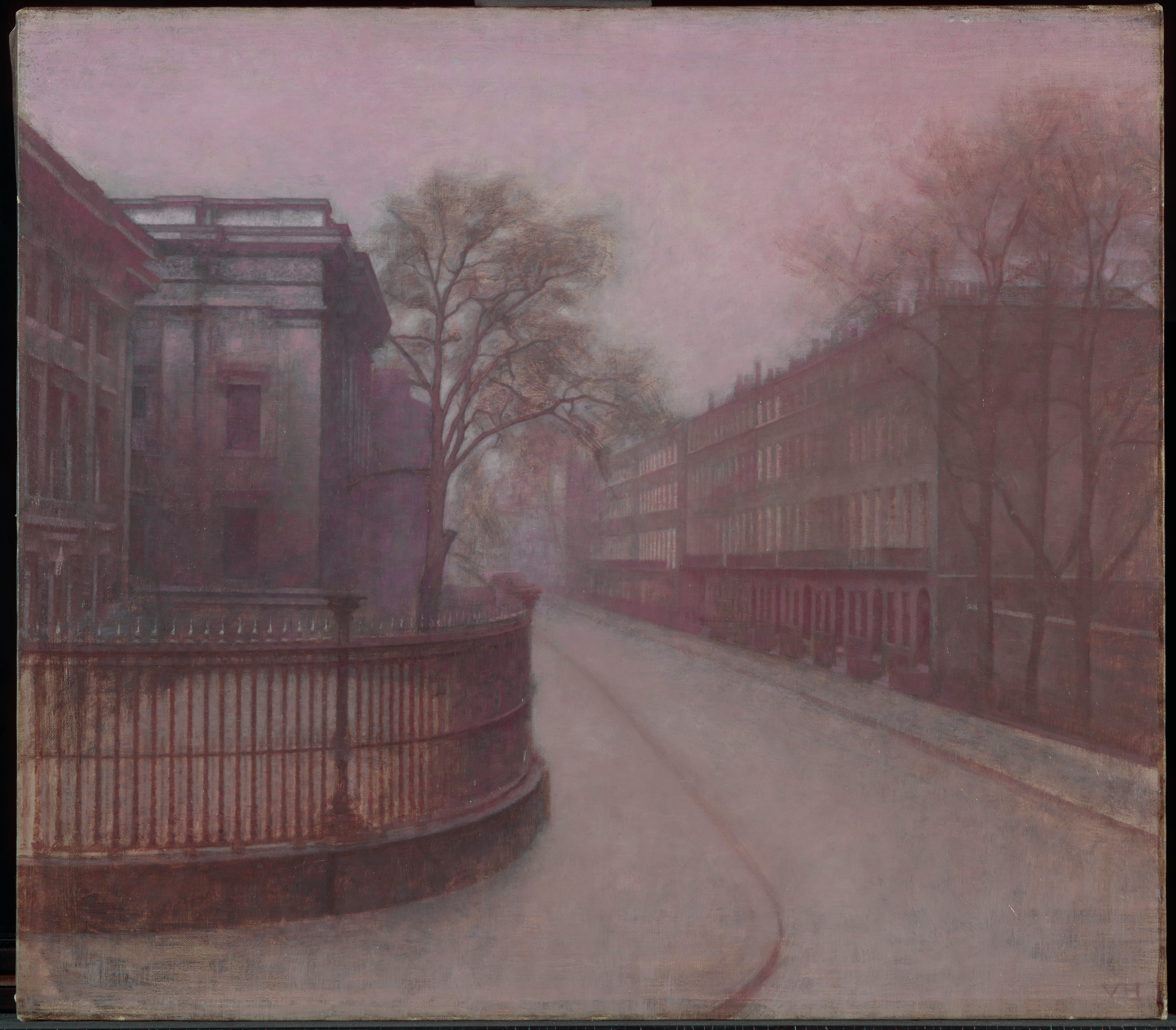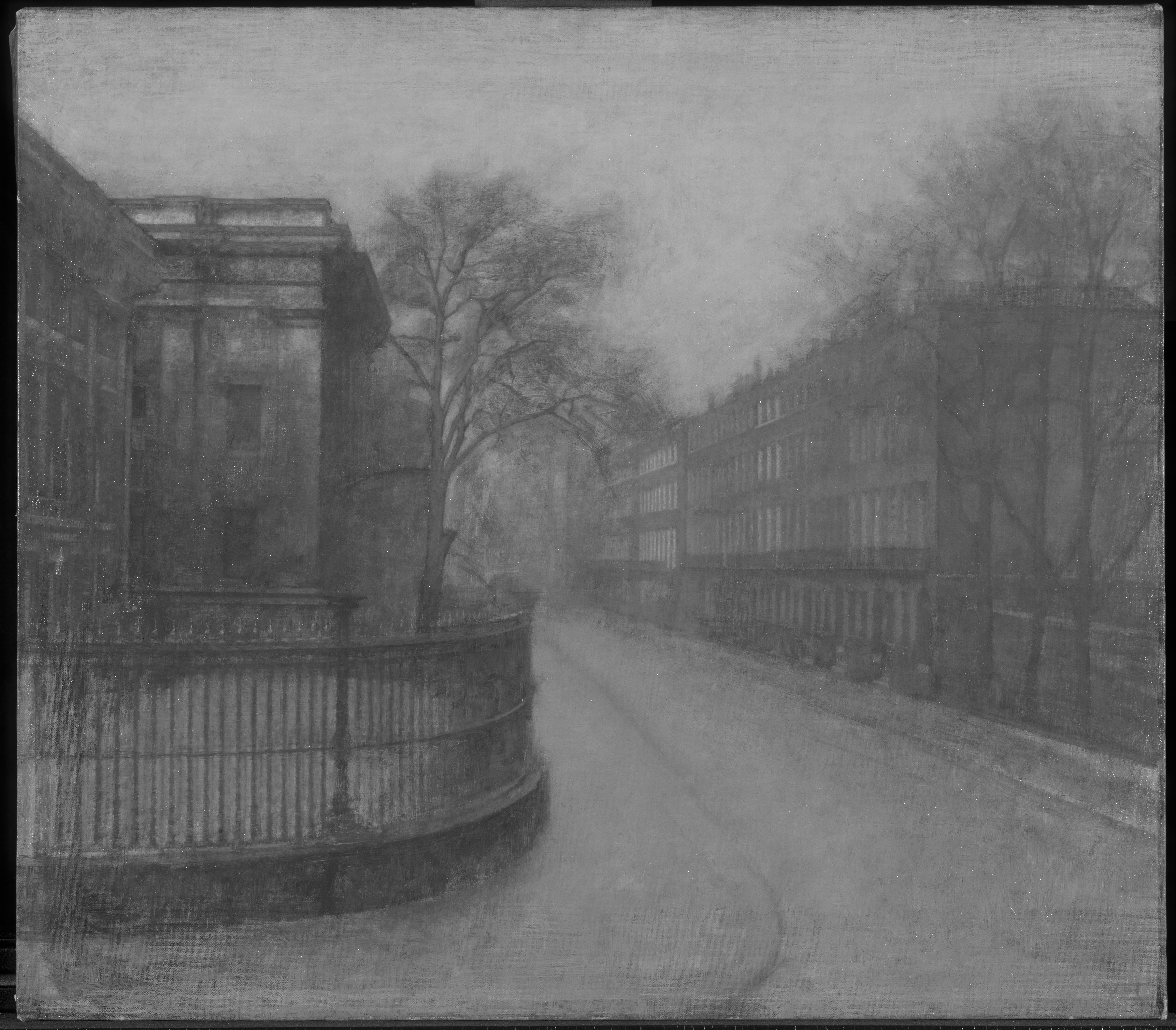 Ida and Vilhelm Hammershøi travelled to London together six times during his life. This streetview was painted during their third trip to the city in 1905-1906. In a letter to Frederikke Hammershøi from December 8. 1905 Ida described how Vilhelm painted the street while looking out from their window on 1st floor: "Vilhelm er ogsaa glad for sit Motiv han maler her set fra Vinduet Træer og Huse, som vi har lige udenfor os. Vi bor på 1ste Sal, saa vi kan ogsaa følge med alt paa Gaden…" / " Vilhelm is also pleased with his motif he is painting here seen from the window trees and houses, that we have right outside. We live on the 1st floor and are able to follow everything on the street…" (letter in Den Hirschsprungske Samlings Arkiv cited in Hvidt and Oelsner, 2018, p. 354).