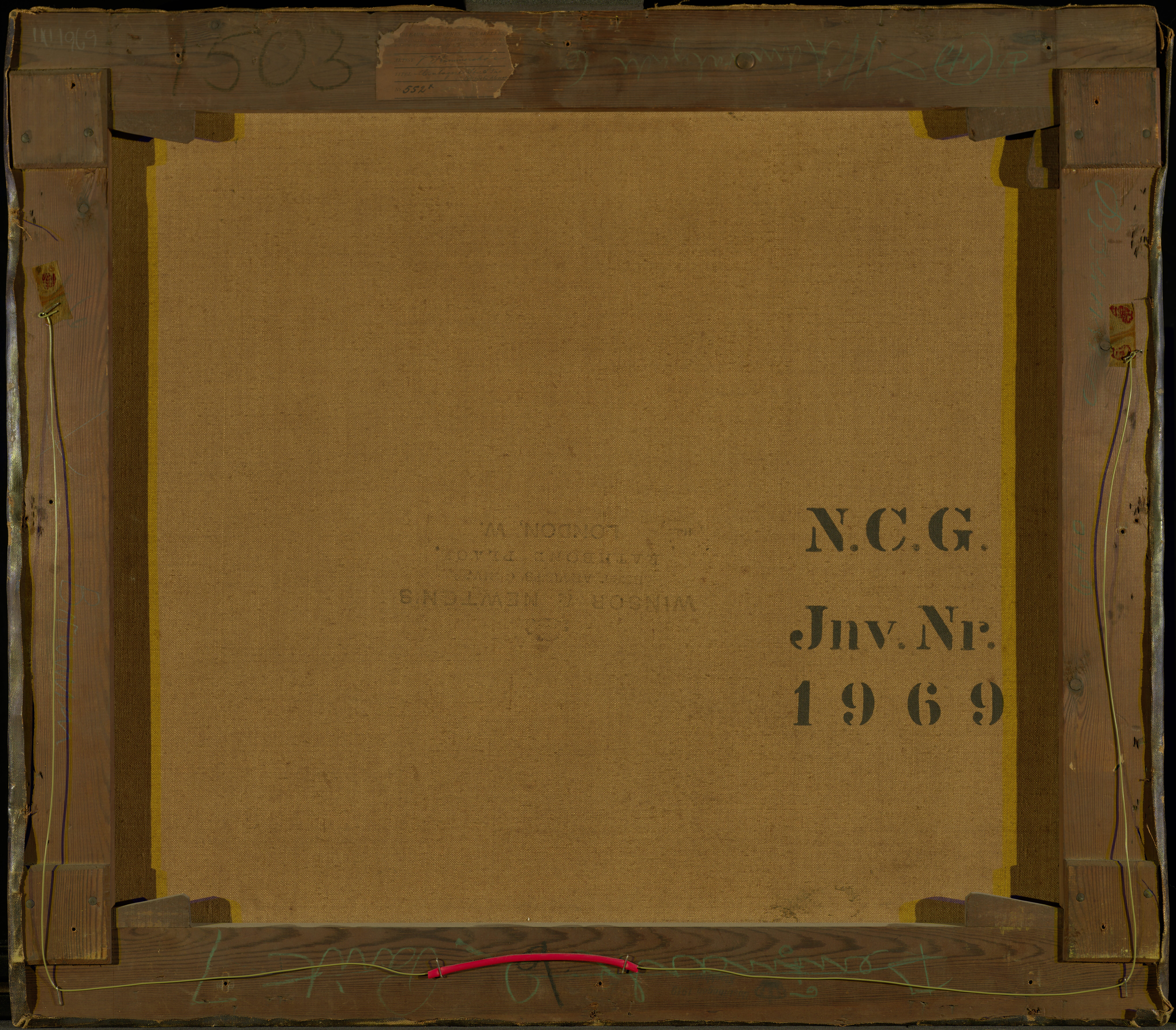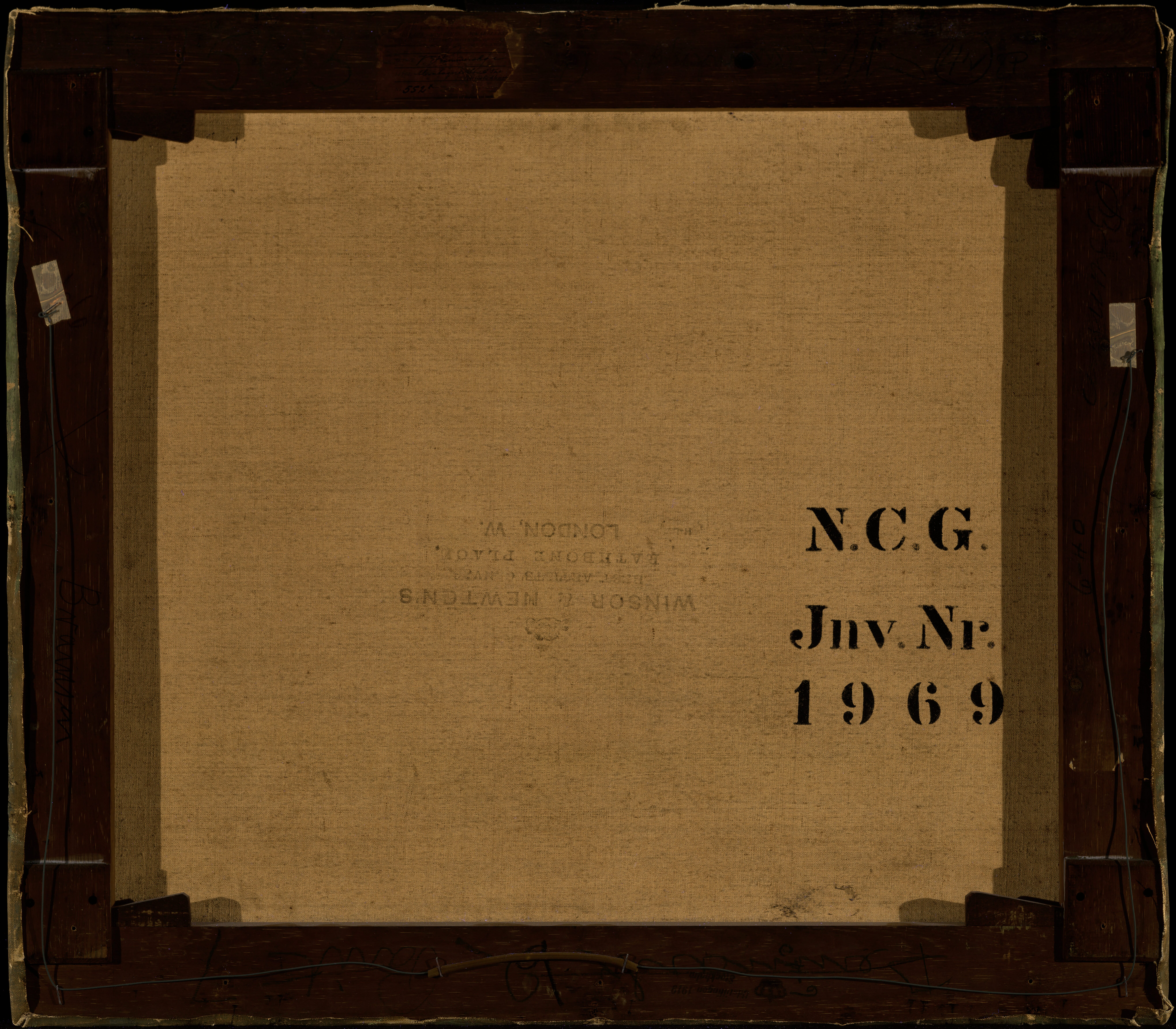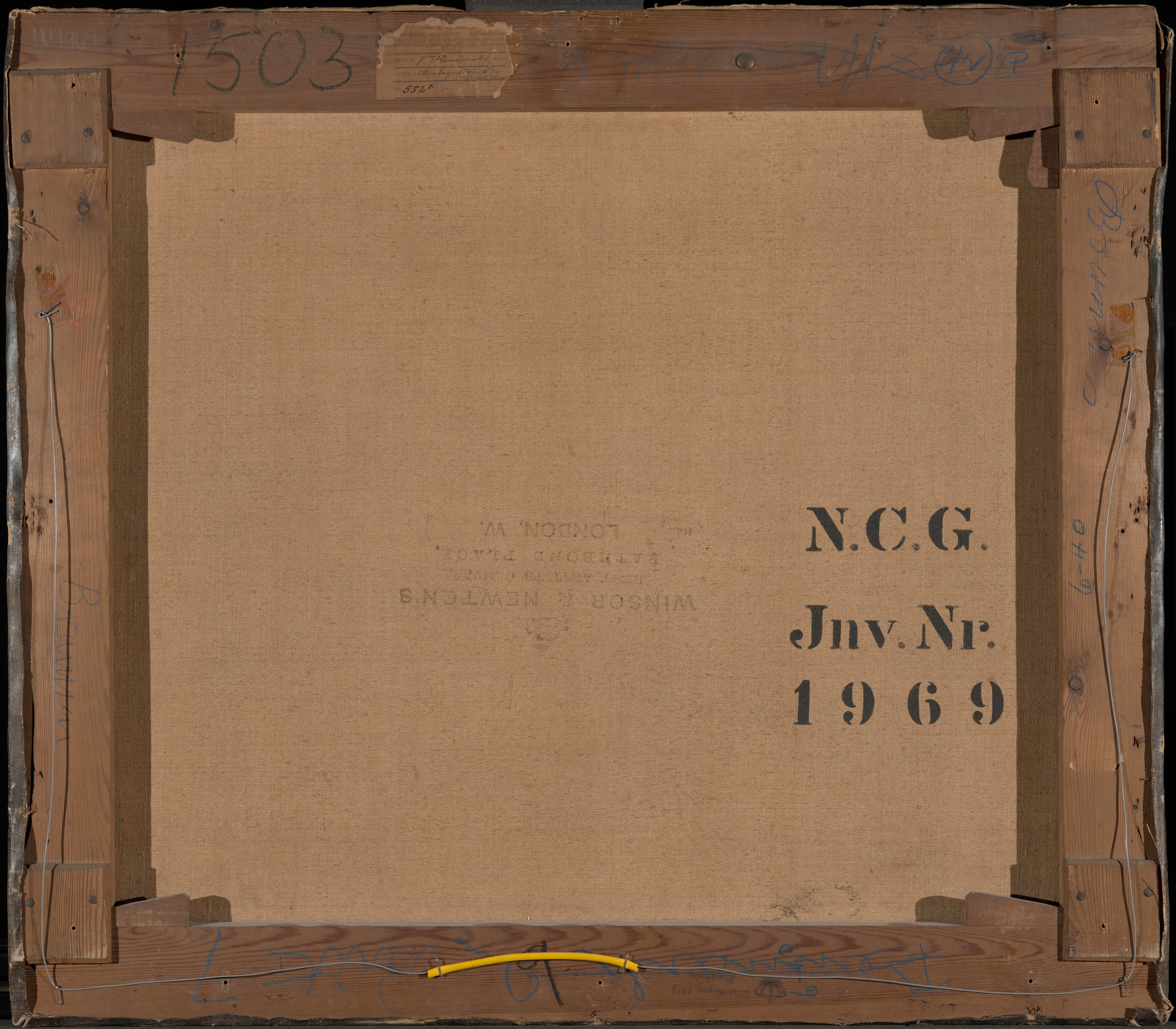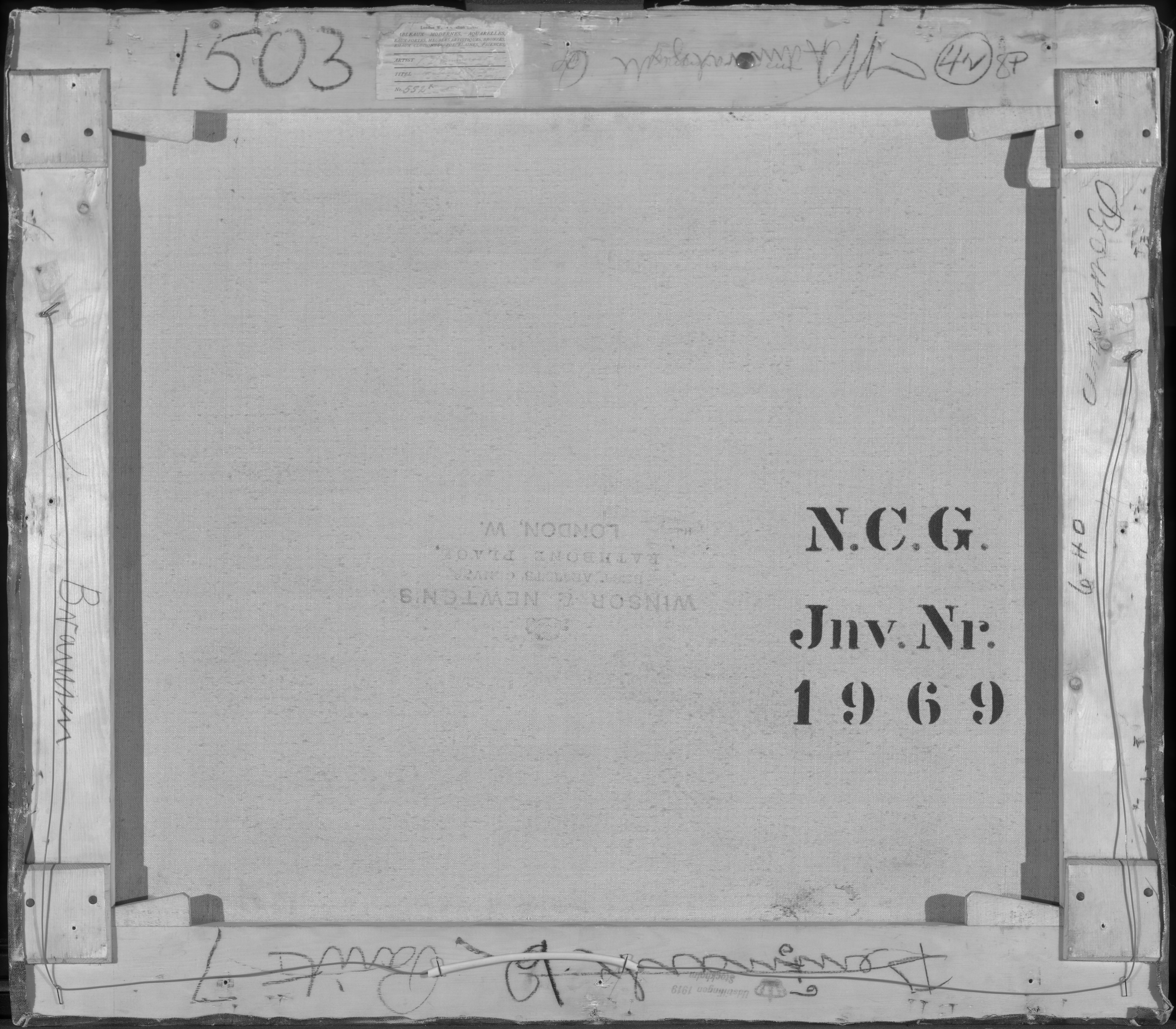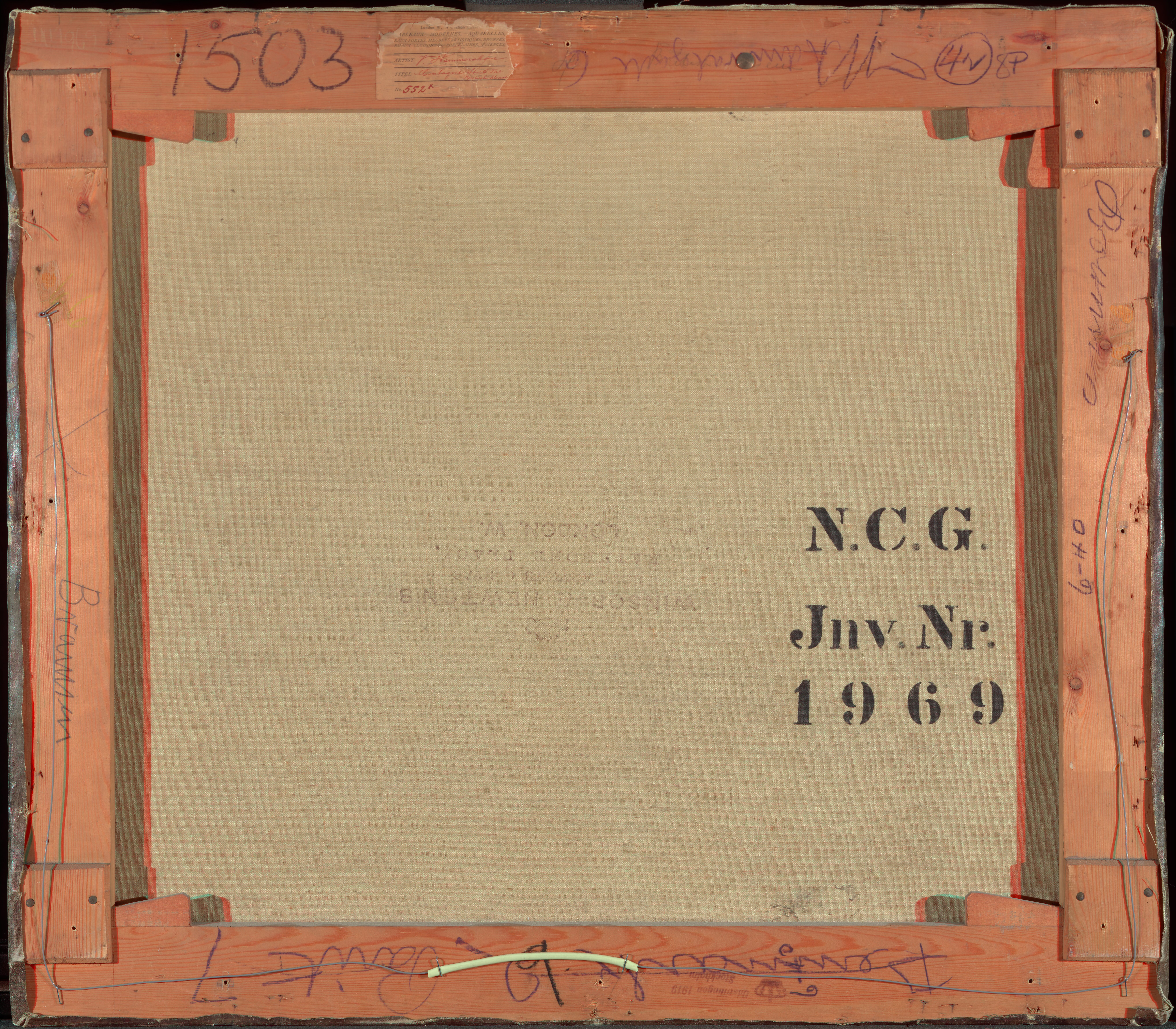 Inscriptions on the stretcher in blue crayon are the following: On the top bar: 'Admiralgade 6' and the numbers '1503' and '4N 8P'. On the bottom bar: 'Denmark 2 Paint [..?] 7' and in black crayon '9'. On the right-hand bar (as viewed from the back): 'Bramsen'. On the left-hand bar (as viewed from the back): '6-40' and an illegible name. A fragment of a dealer or exhibition label on the top bar bears the name 'V. Hammershøi' and the title 'Montague Str. & the British Museum' and the numbr '552x' in ink. A stamp on the bottom bar reads: 'Udstillingen 1919 Stockholm'.