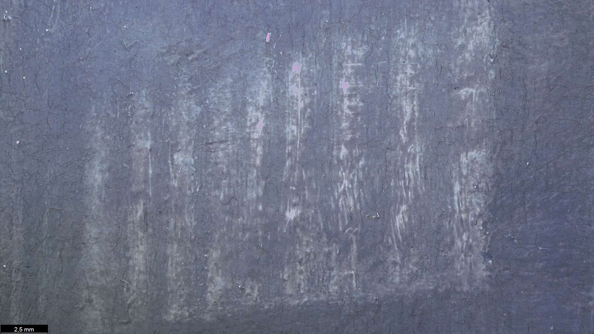 Many fibres and brush hairs are inbedded in the paint surface.