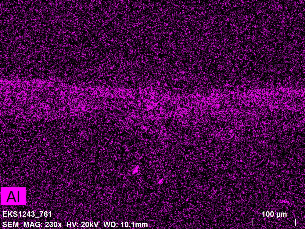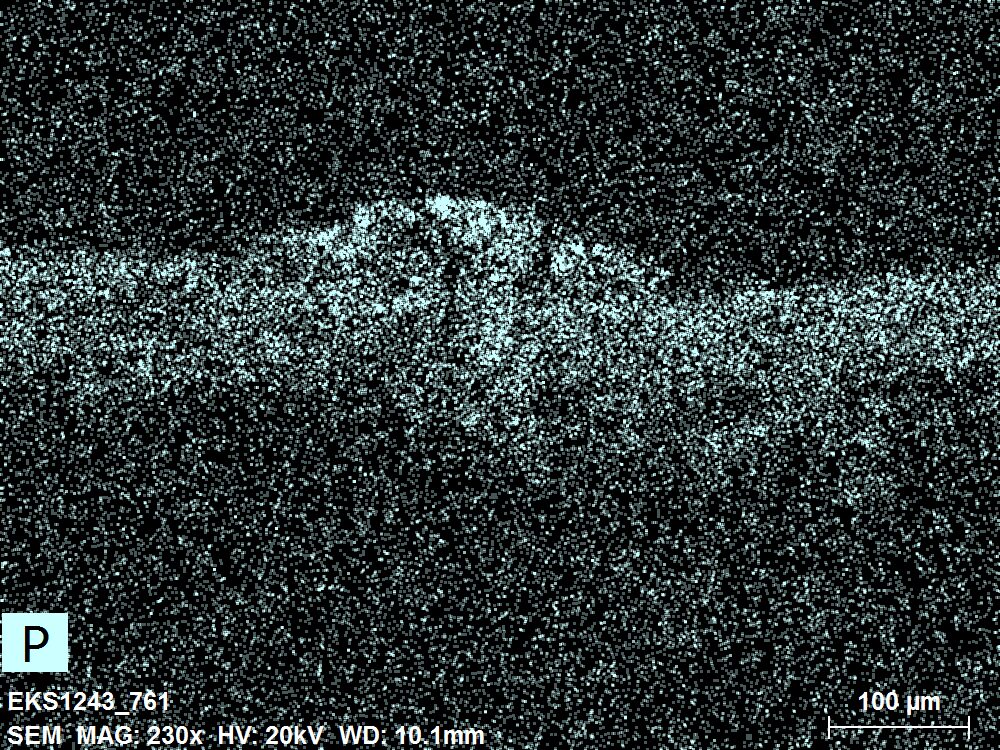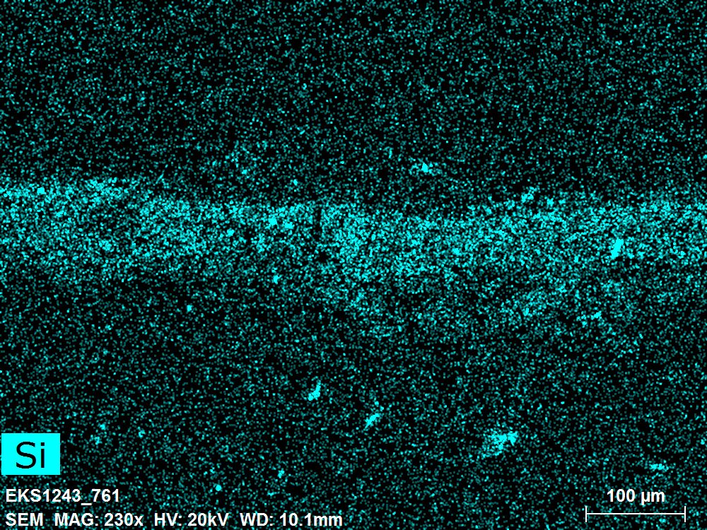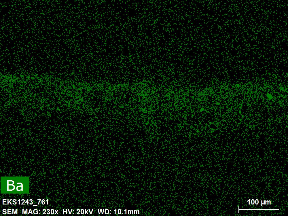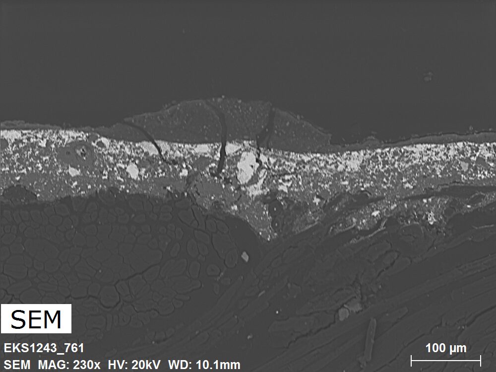 SEM-EDXS is a technique that provides highly detailed images at the microscopic level while simultaneously identifying the elemental composition of a sample. It is particularly valuable for studying the stratigraphy of paint cross sections at very fine scales, for the chemical characterisation of pigments, fillers and degradation products, and for detecting trace elements that may indicate very specific materials. Below, the elements listed in parentheses refer to minor elements whose relative abundance is below 10% of the total signal. The F1 map below represents the Pb M line. Read more under SEM-EDXS in the glossary.