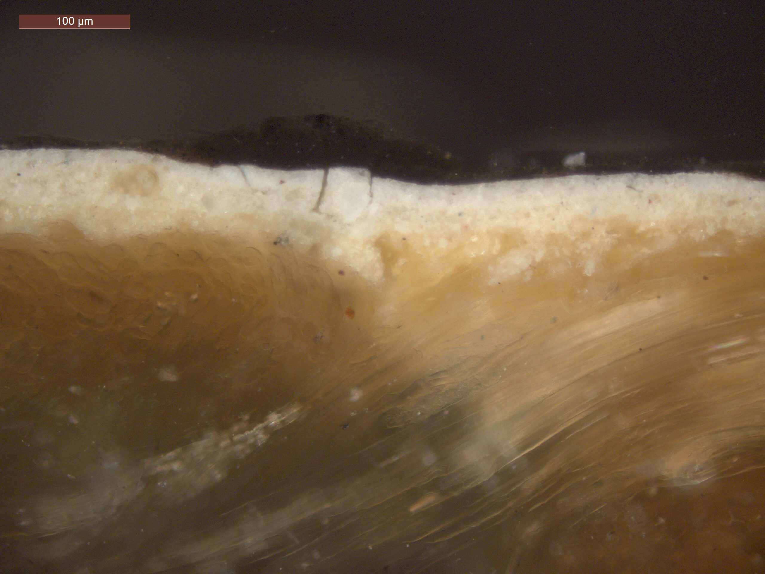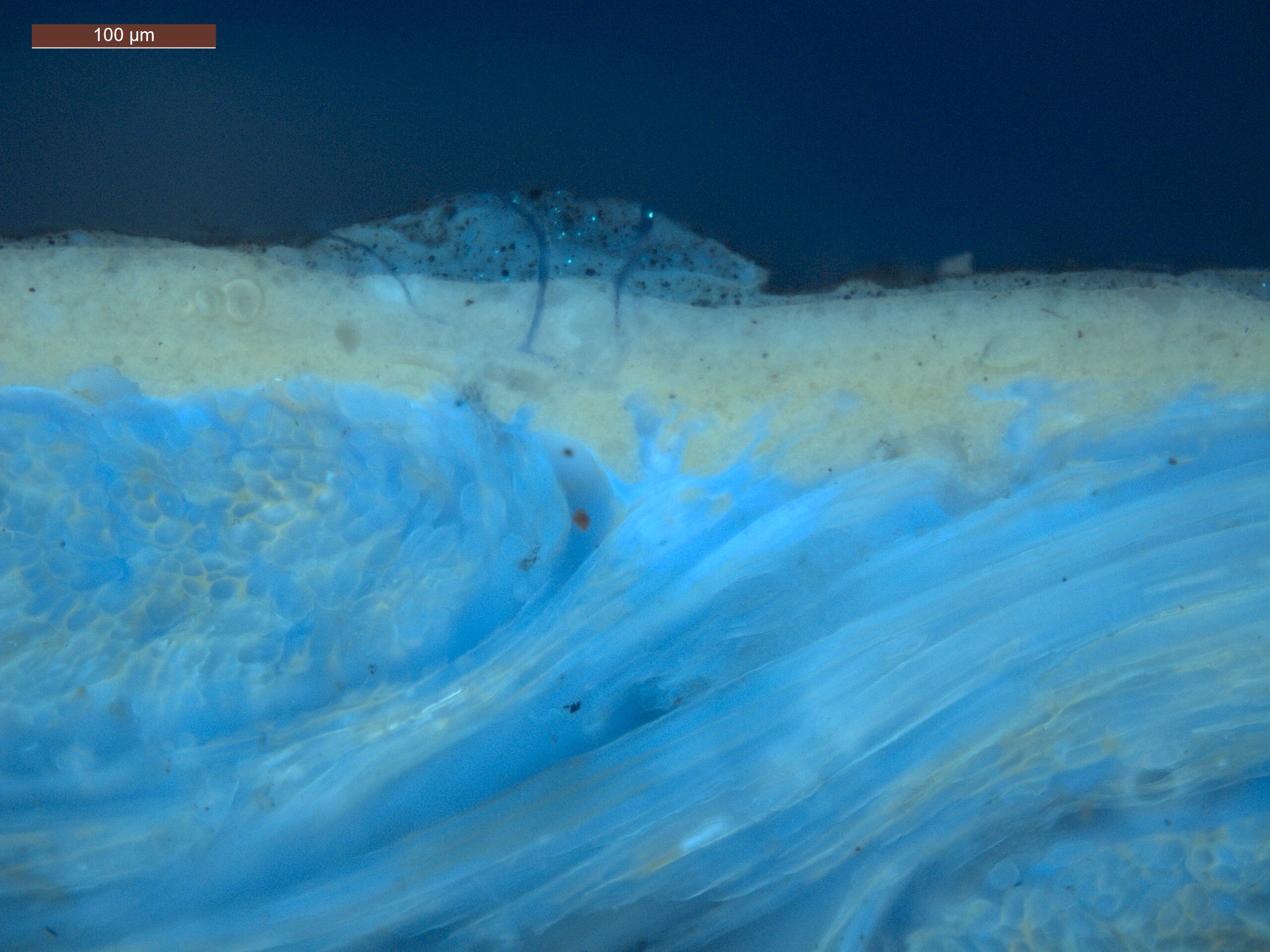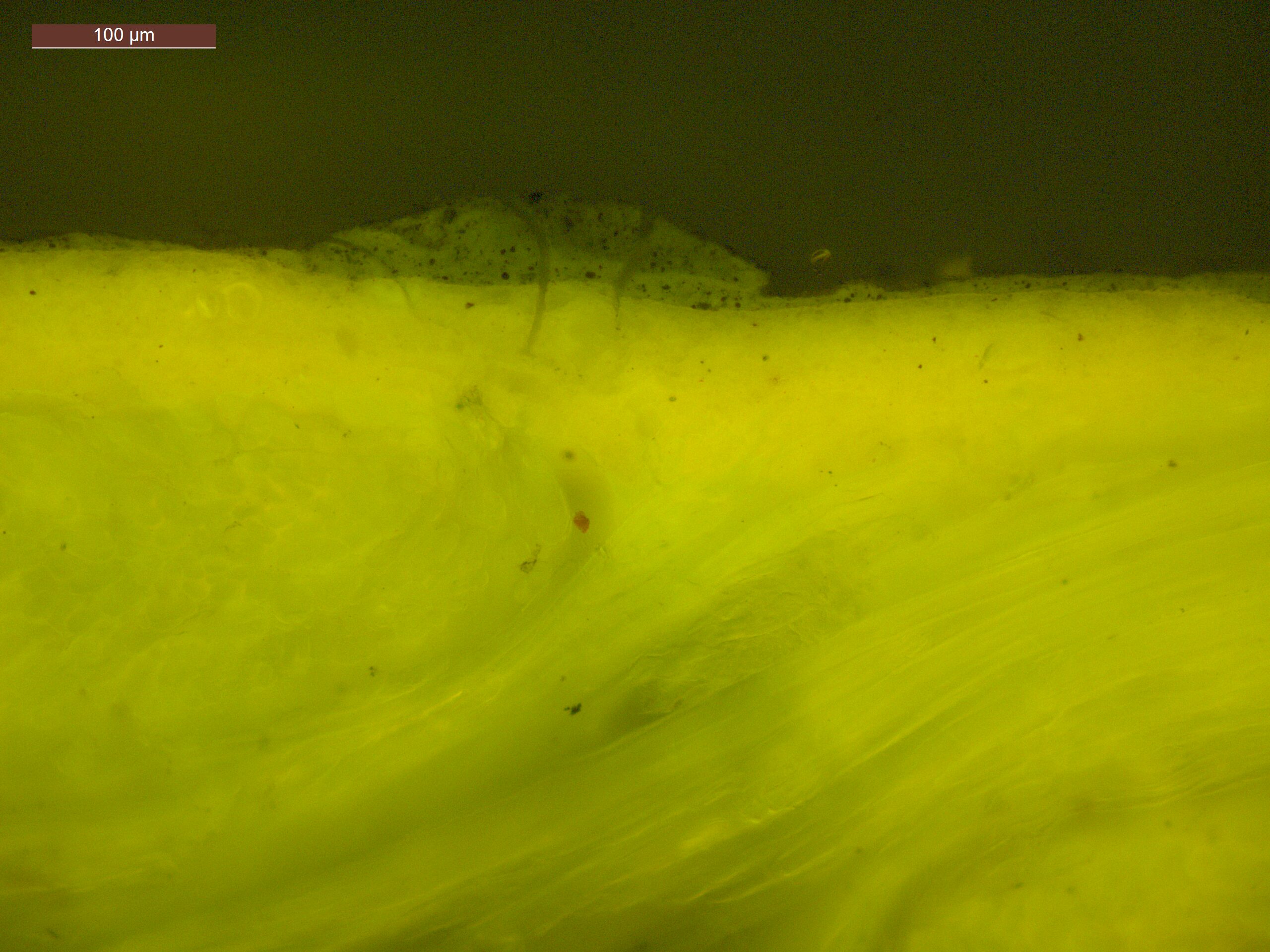 Optical microscopy uses visible light and lenses to magnify and examine the surface and structure of a painting. When applied to cross sections of paint samples, it allows for detailed observation of a painting’s stratigraphy (layer structure) and pigment particles. It is often employed with various illumination techniques, such as dark field and UV fluorescence, to enhance the analysis. Layer number 1 in the results section below the images refers to the layer at the bottom of the cross section.