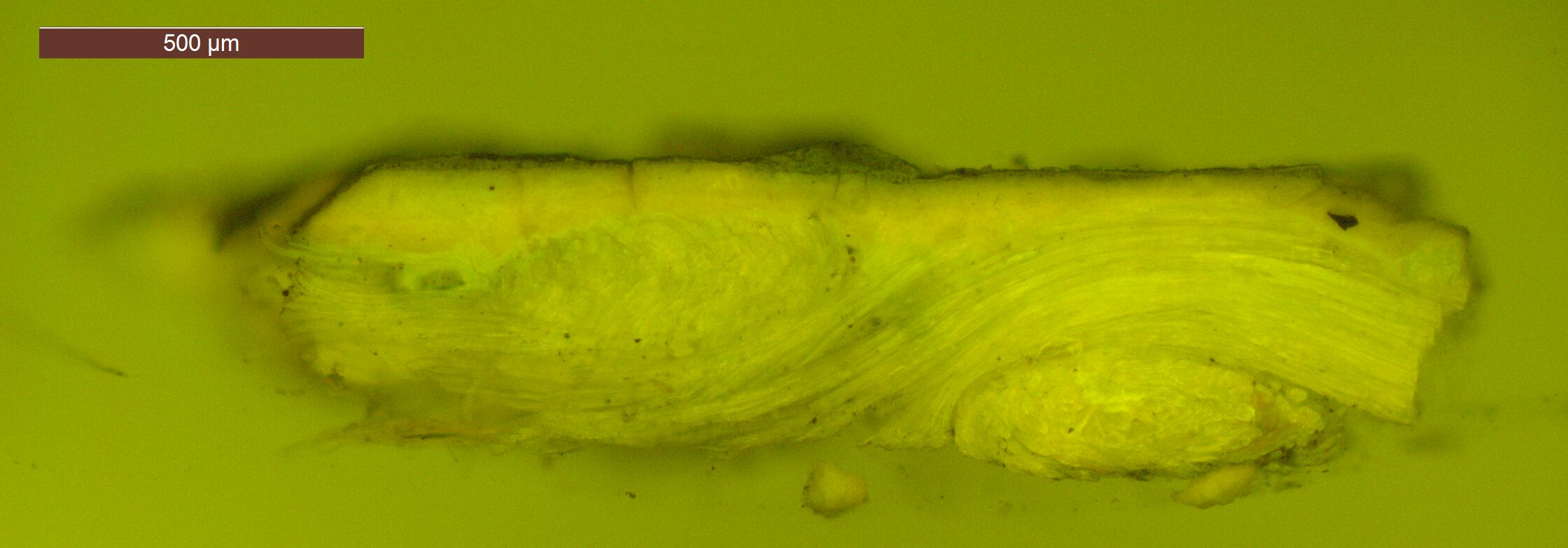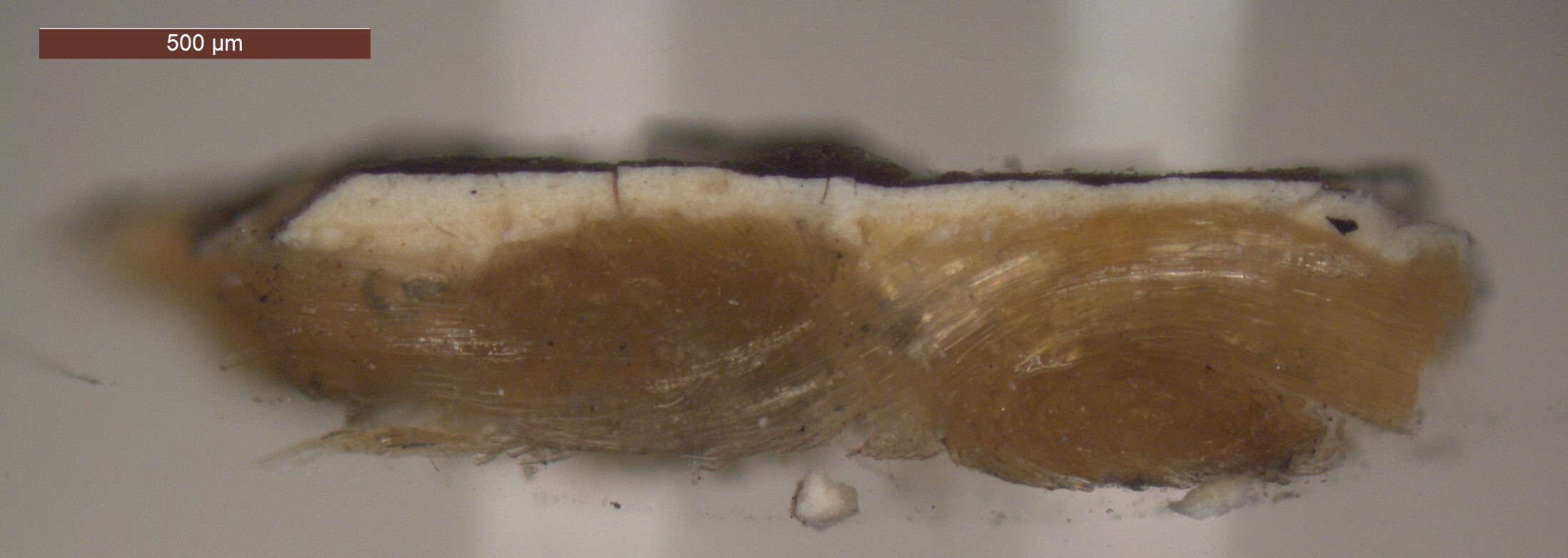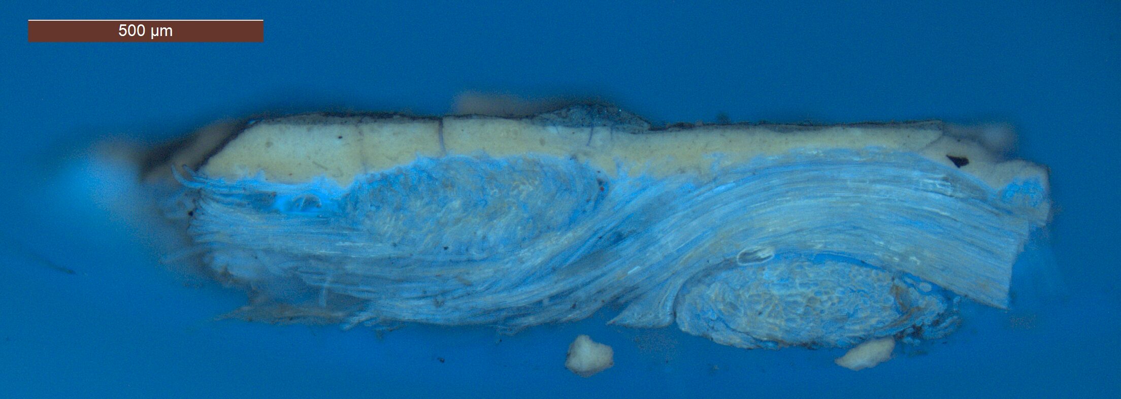 Optical microscopy uses visible light and lenses to magnify and examine the surface and structure of a painting. When applied to cross sections of paint samples, it allows for detailed observation of a painting’s stratigraphy (layer structure) and pigment particles. It is often employed with various illumination techniques, such as dark field and UV fluorescence, to enhance the analysis. Layer number 1 in the results section below the images refers to the layer at the bottom of the cross section.
