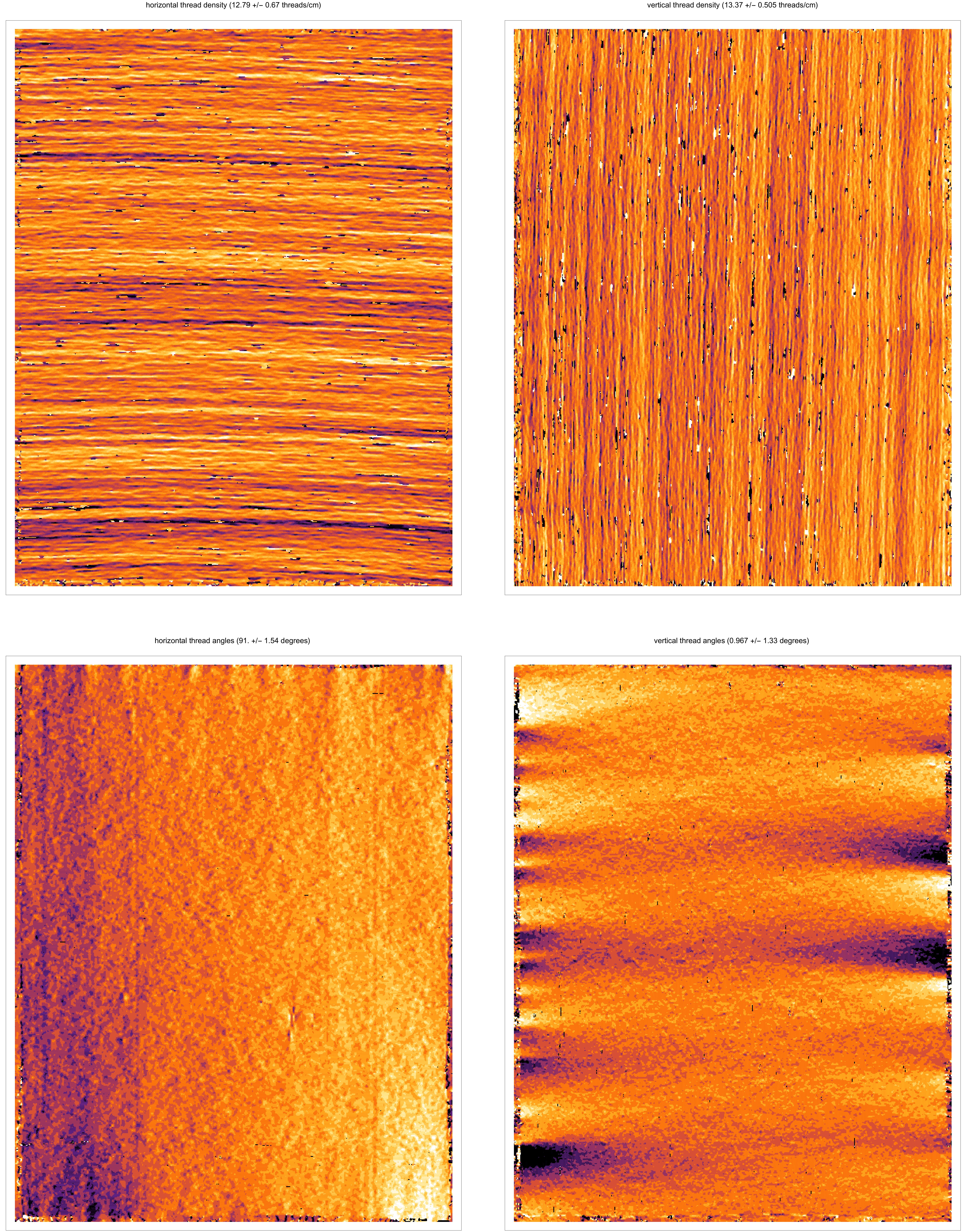 Weave maps are detailed visualisations of the thread patterns in a canvas, created by applying thread counting on high-resolution x-radiographs. These are used for analysing the structure of the canvas and to compare canvases used in different paintings. A comparison between weave maps can sometimes determine if two or more pieces of canvas derive from the same batch and thereby shed light on the place and period in which a painting has been created.