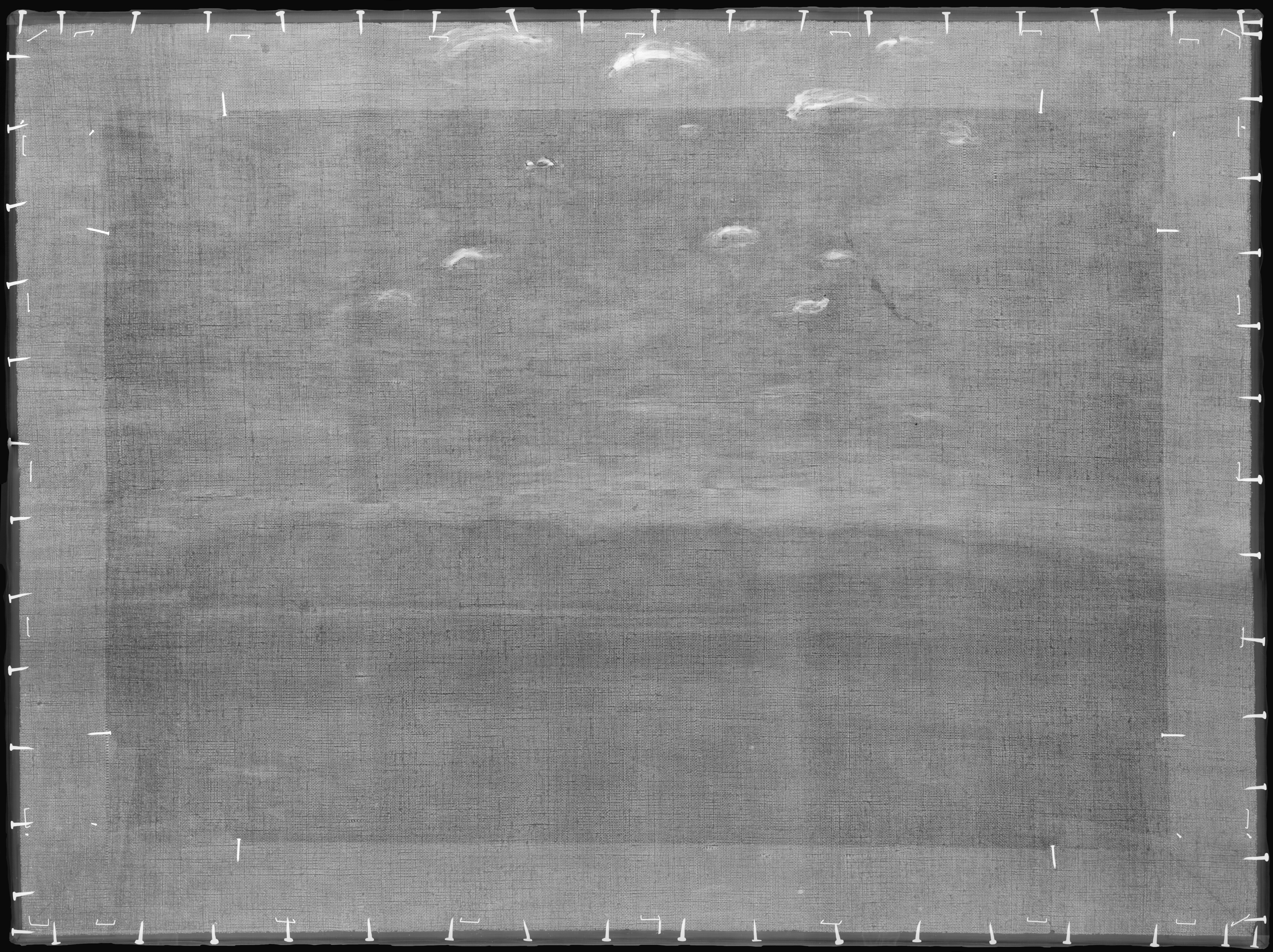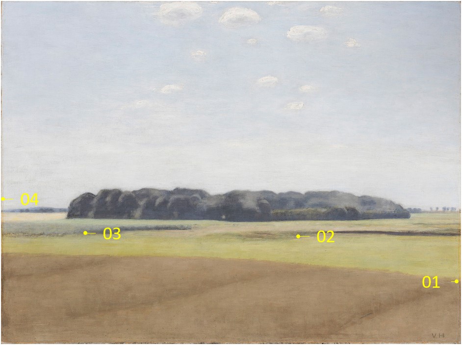 The ground layer is a preparatory layer applied directly to the support to create a smooth surface for painting. It is typically opaque and monochrome in color, providing a neutral base that influences the subsequent application of paint layers and the final appearance of the painting. The composition of the ground layer varies depending on the type of support and the historical period of the artwork. Hammershøi typically painted on white and industrially primed canvasses.
